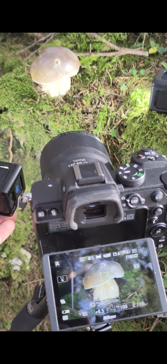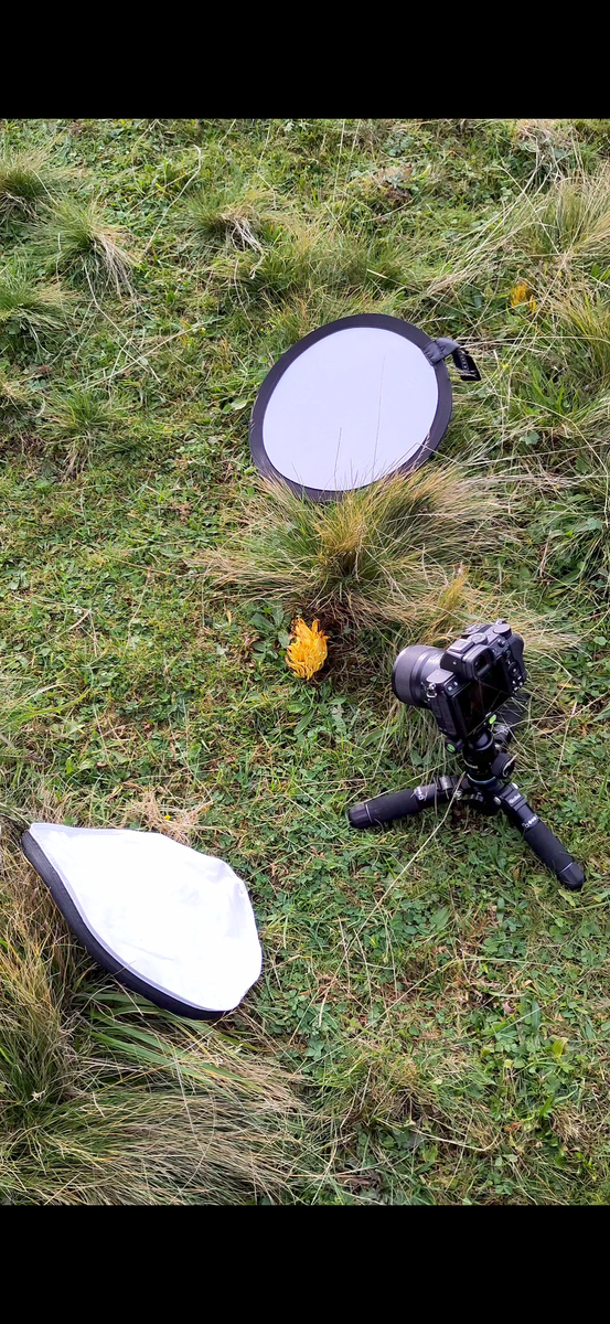 Den Diffusor (oben im Bild) habe ich über den Pilz gehalten um die Sonneneinstrahlung (obwohl von Wolken verdeckt) zu minimieren und das Licht zu verbessern. Die Sonne stand in etwa in der Richtung in der der Diffusor liegt. Den weißen Reflektor habe ich in der anderen Hand bodennah gehalten um Licht auf den vorderen Teil des Pilzes zu lenken. Aufnahme dann mit Selbstauslöser, bzw. in diesem Fall ist es ein Stack von 20 Fotos.