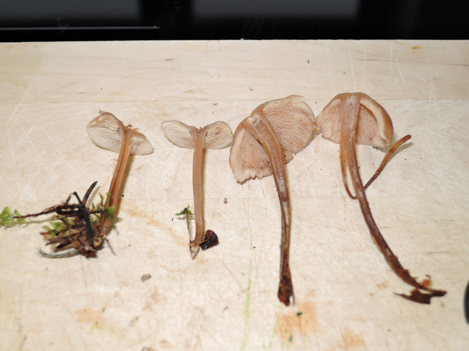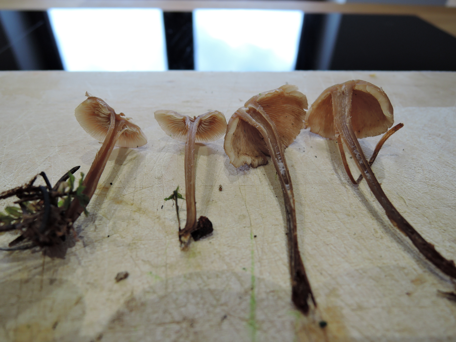 Der Hut ist grau- bis hellbraun, Hutgröße bis ca. 3-4cm, Trichterförmig bis halbkugelig, Hutmitte meist dunkler