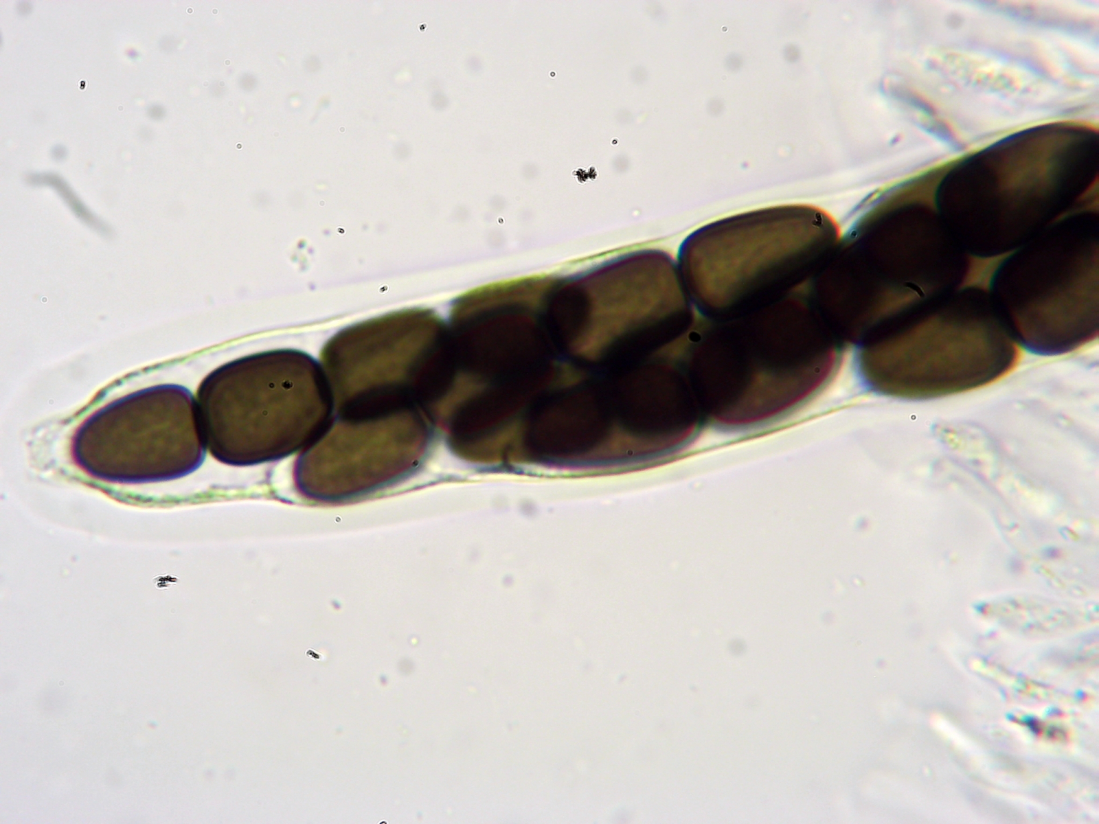 Perithecien fast rund mit kurz auslaufender Spitze und ohne Haare, tief ins Substrat eingesenkt. Asci 8-sporig mir sehr breiter Spitze. Sporen 30,5 x 19,5 µm mir apicalem Keimporus und dicker Gelhülle. Mit Richardson und Watling komme ich zu Sordida macrospora. Das korrespondiert auch gut mit der Abbildungen bei Lundqvist. Insbesondere die breite Ascusspitze in Fig. 71e kommt meinen sehr nahe.
