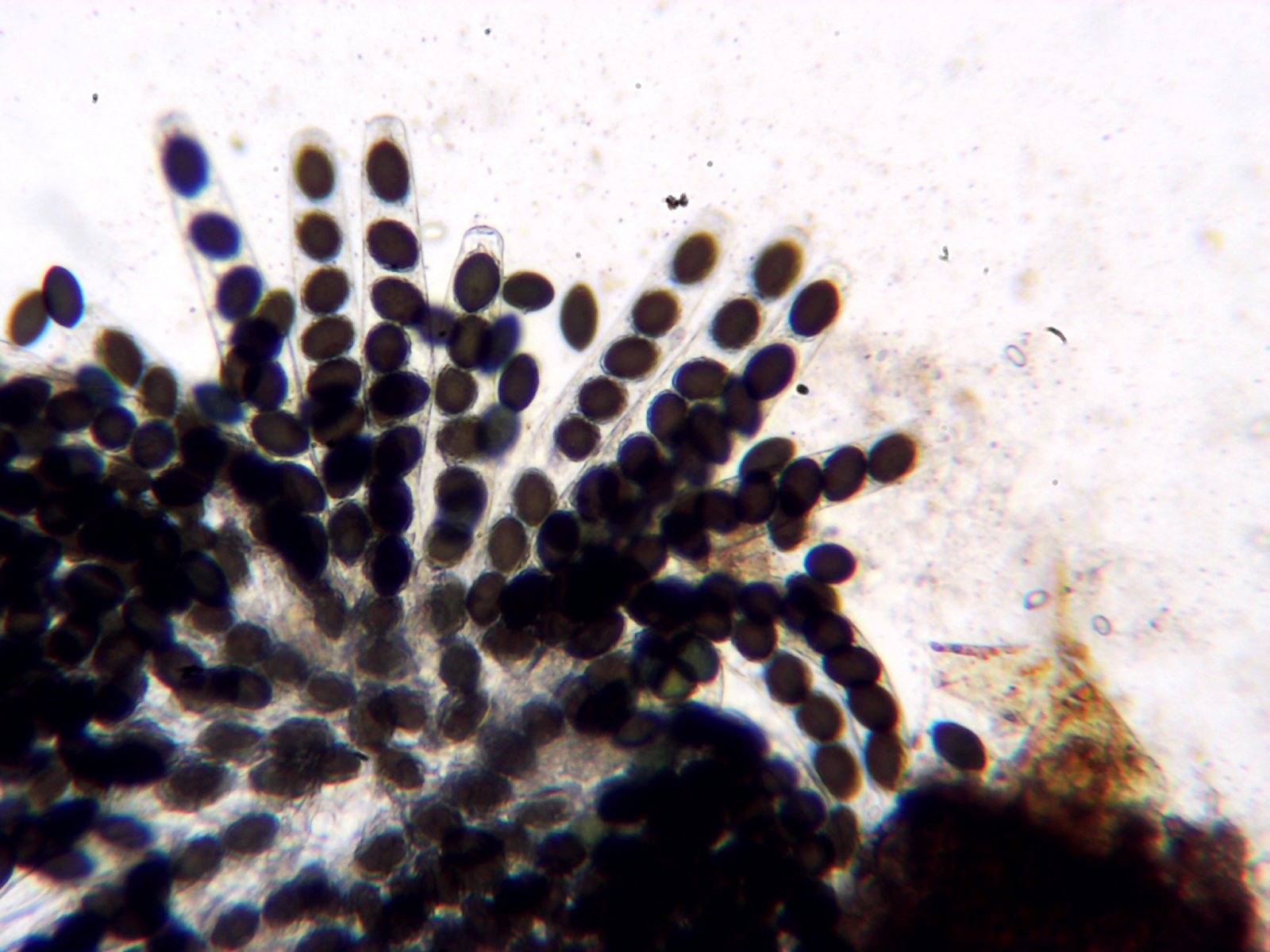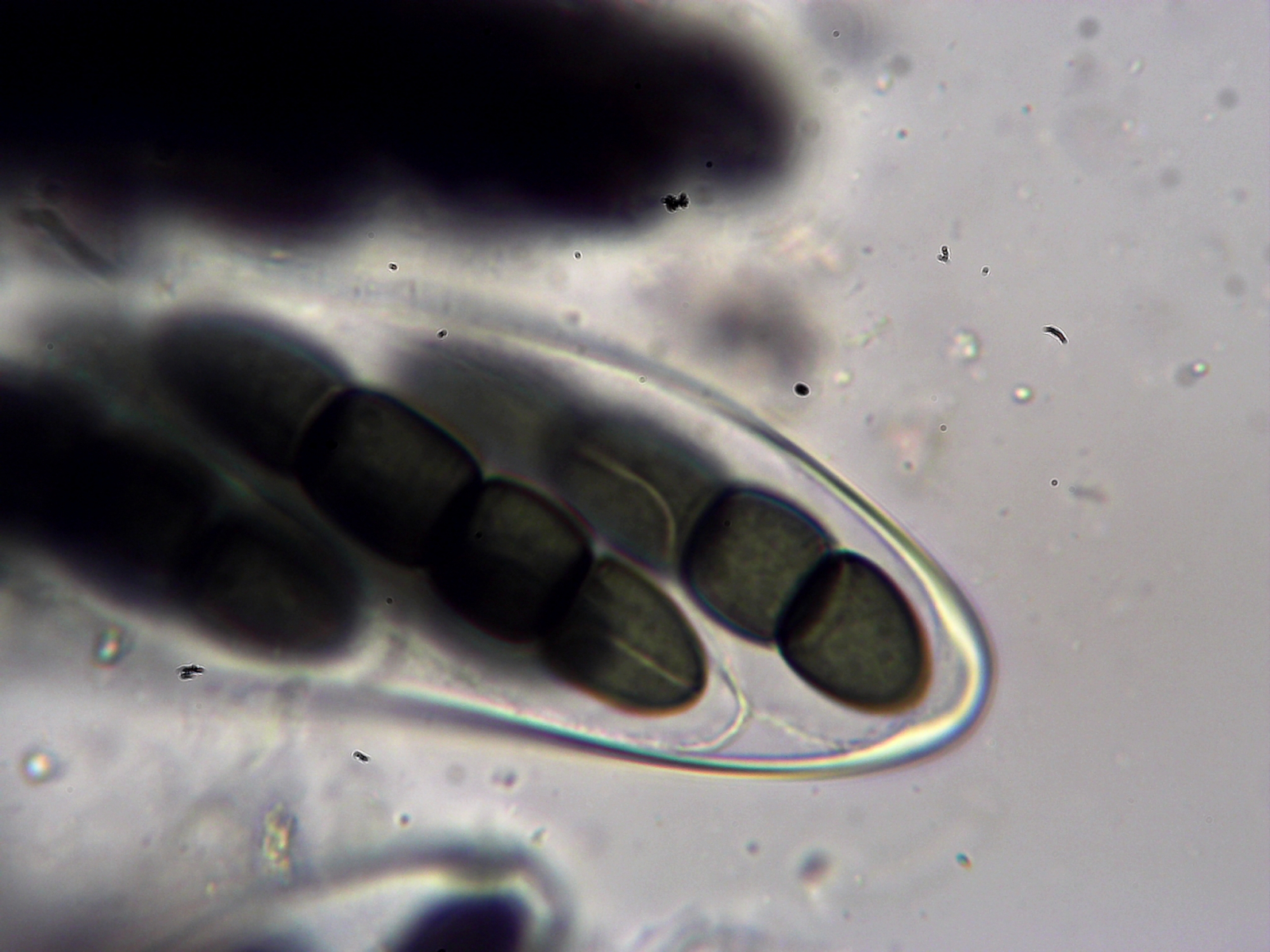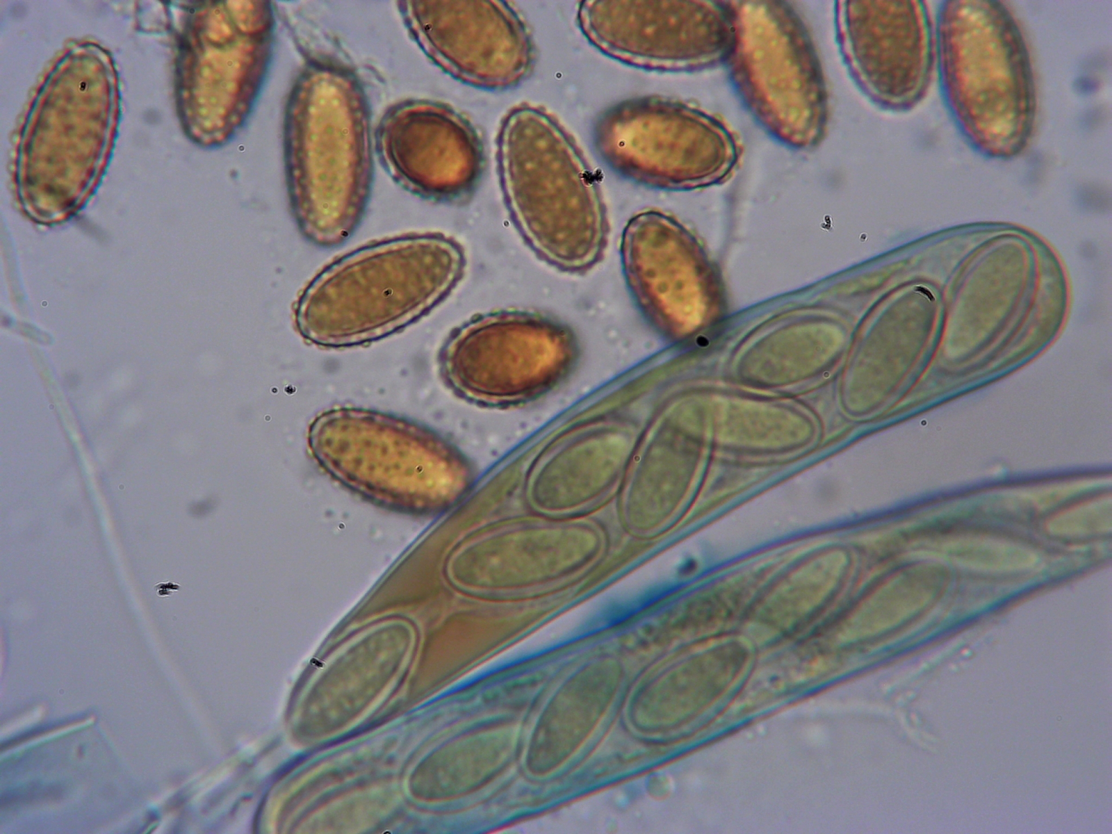 Unter dem Mikroskop zeigten sich auffallend dicke operculate 8-sporige Asci mit breiter Basis und negativer Reaktion auf Melzer und JKJ. Die Sporen waren glatt, ellipsoid, hyalin und 15-18 µm groß.