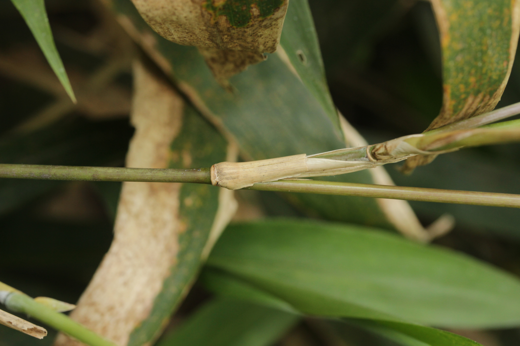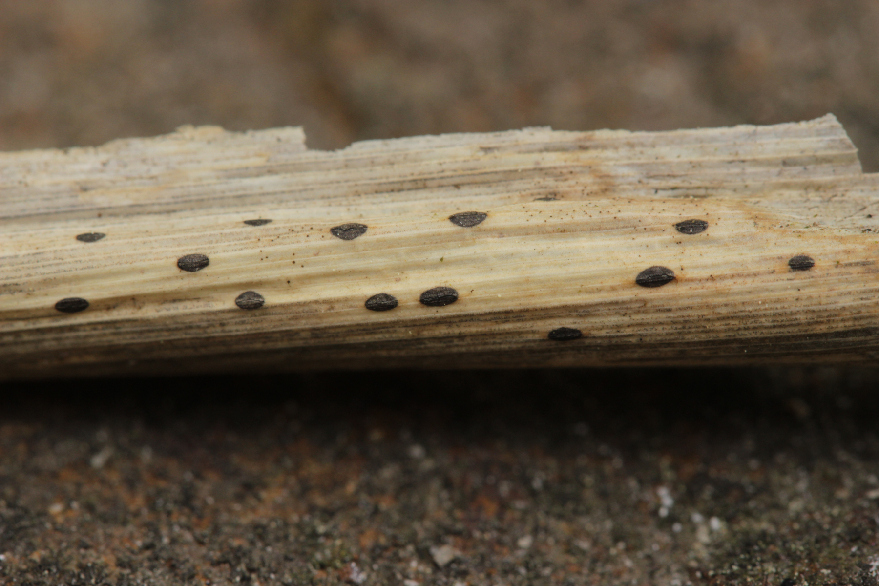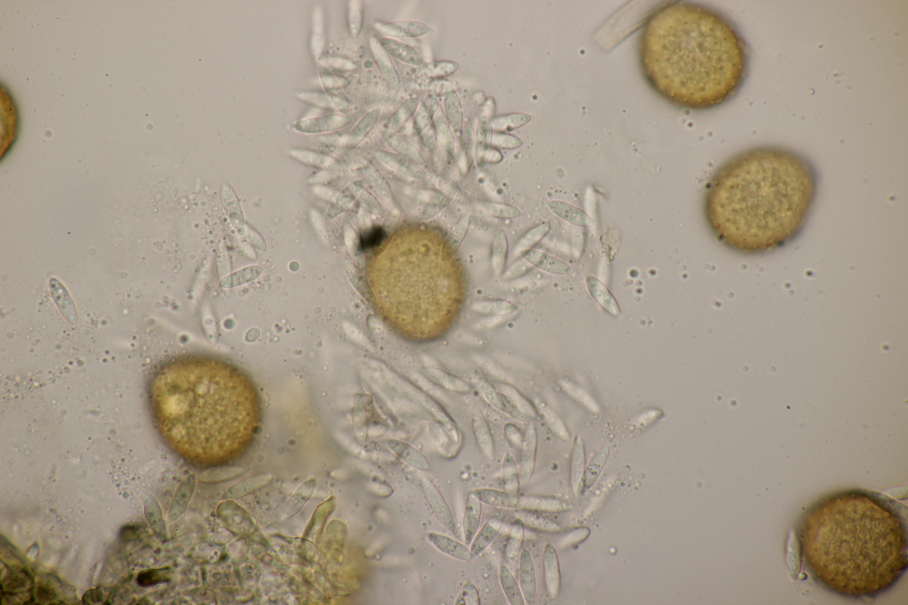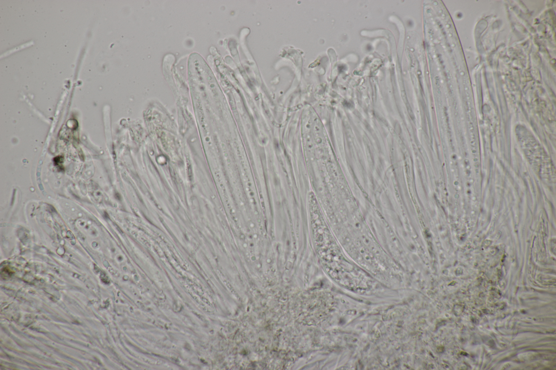 6. Auch an Rohrkolben fand sich diese Mollisia, die dann mit Hans' Hilfe den Namen Mollisia mediella bekommen hat. Sporen (22-27) µm x 3 µm, dreifach septiert, Kristalldrusen vorhanden, mit KOH eine gelbe Reaktion der Paraphysen, ein Ascus mit blauer Lugolreaktion, die anderen Asci ohne Reaktion.
