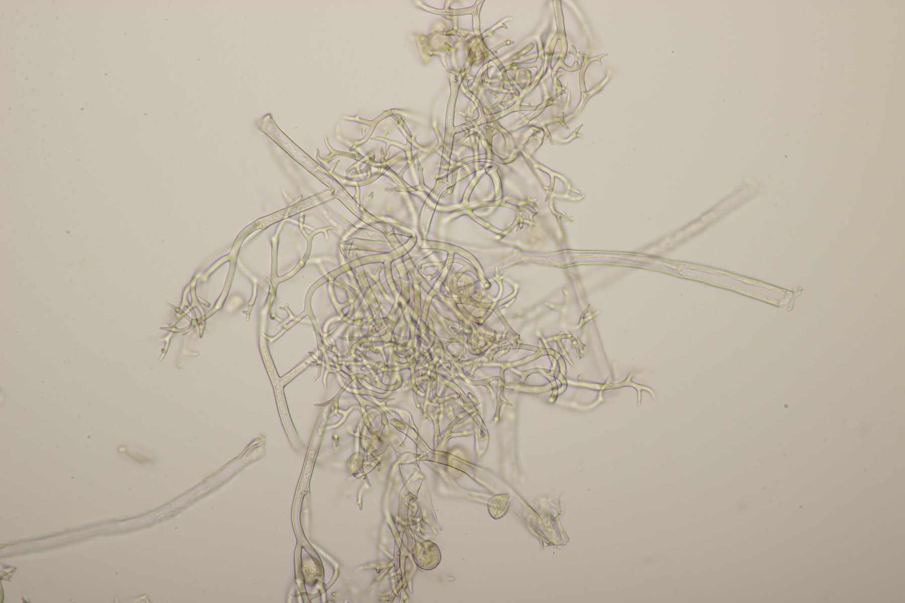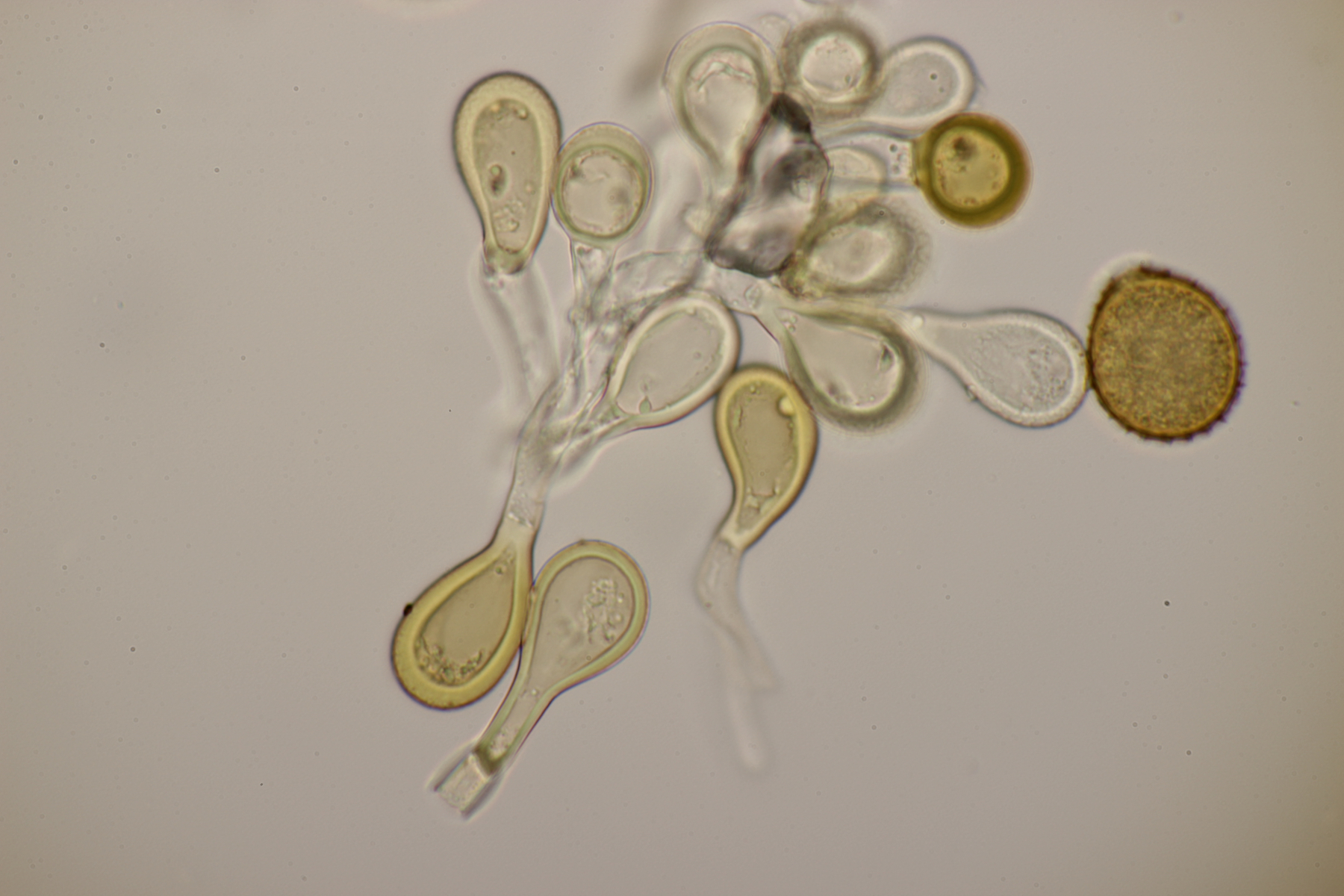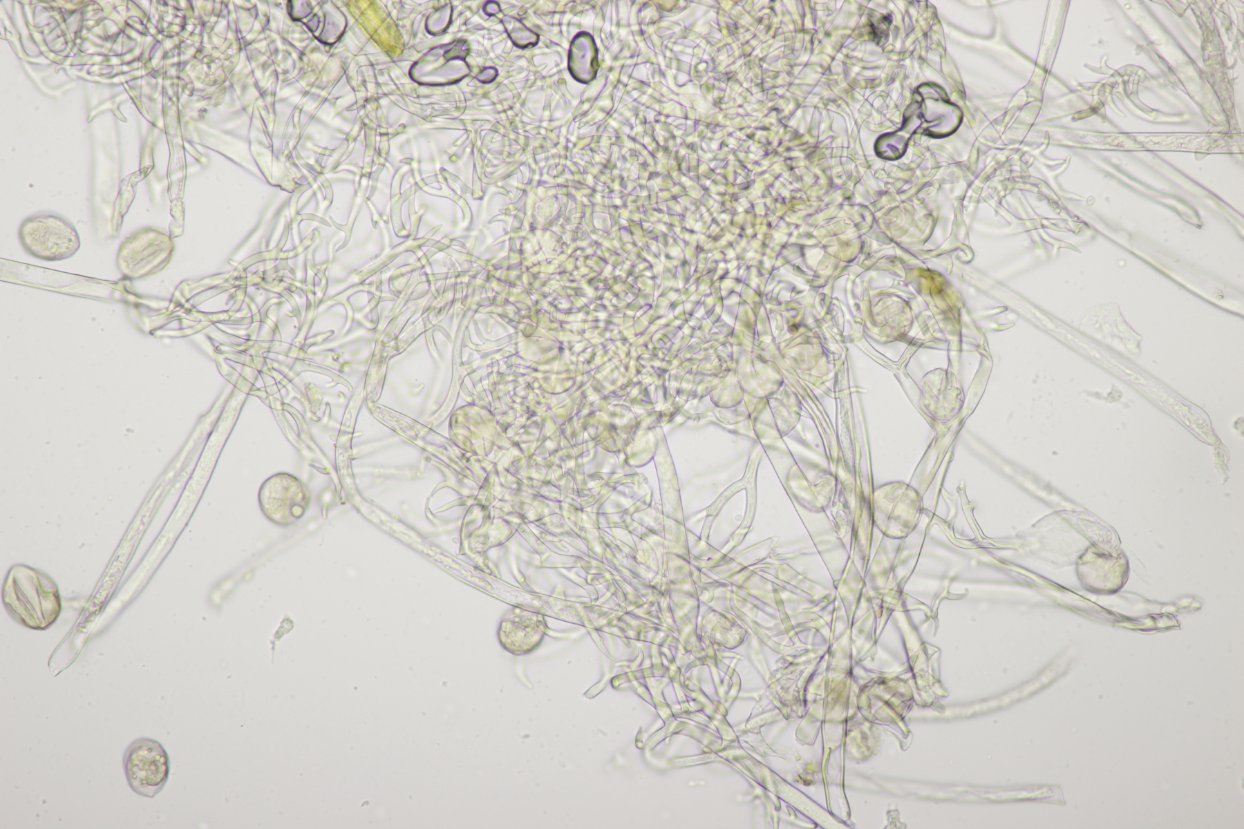 5. Auf einem abgestorbenen Typha-Stängel, der feucht lag, fand sich dieser weiße Belag. Mein erster Gedanke war einer der aquatischen Hyphomyceten, aber im Mikro waren dann Strukturen sichtbar, die zu einer Corticiaceae passen. Schnallen gab es reichlich, reife Basidien waren nicht vorhanden. Interessanterweise war der ganze Fruchtkörper voll mit Sporen, die an Tomentella erinnern.