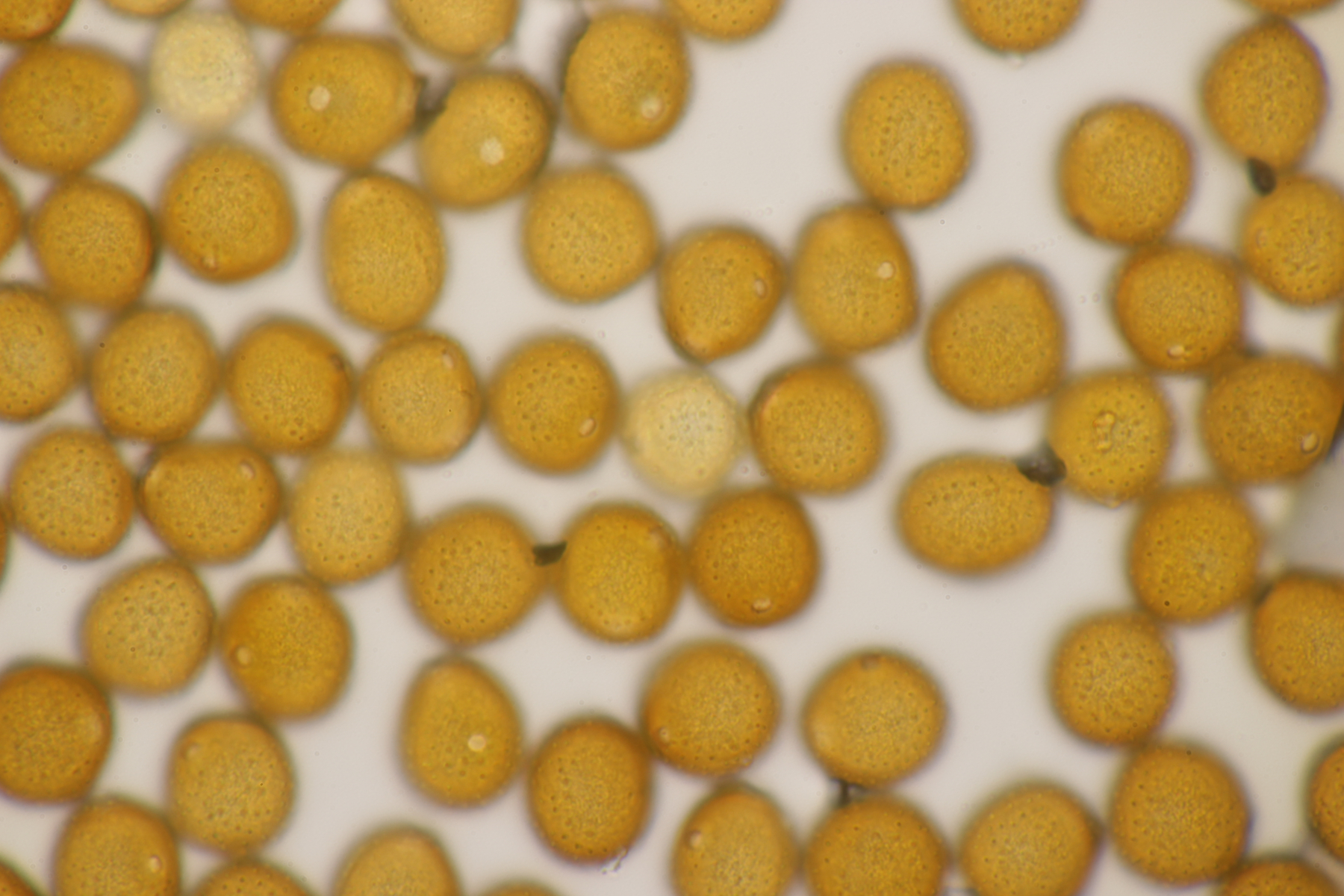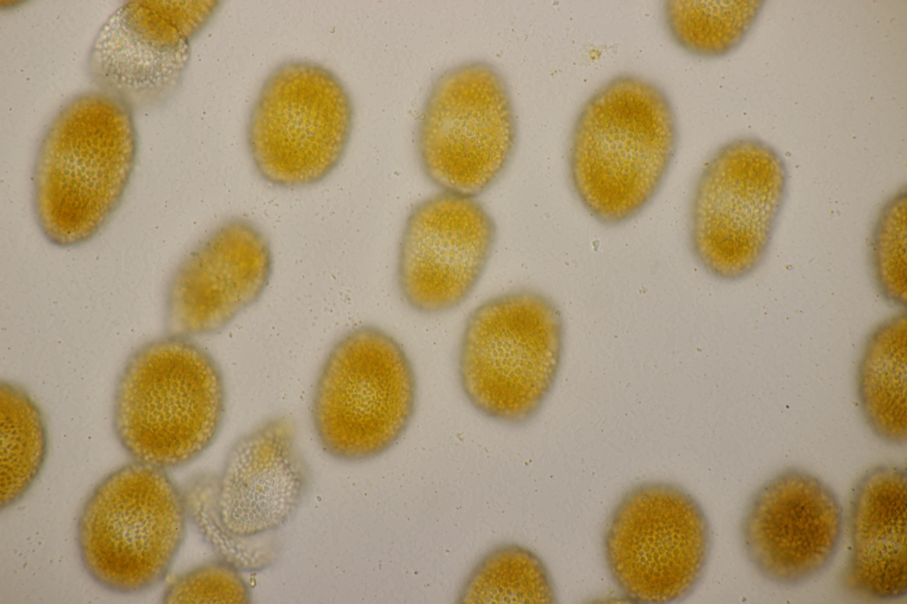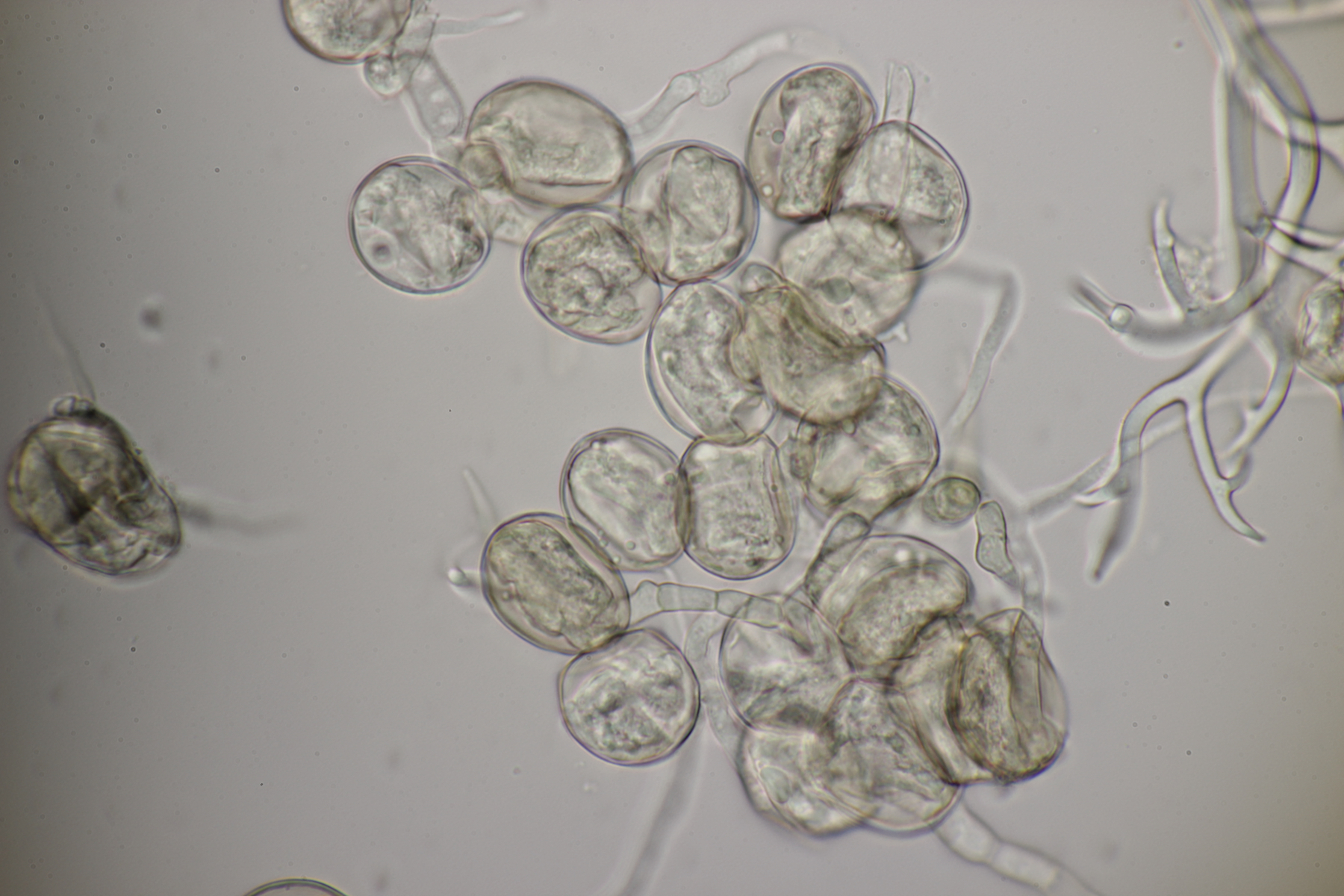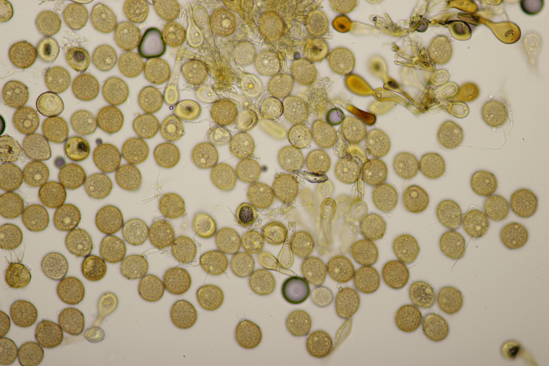 5. Auf einem abgestorbenen Typha-Stängel, der feucht lag, fand sich dieser weiße Belag. Mein erster Gedanke war einer der aquatischen Hyphomyceten, aber im Mikro waren dann Strukturen sichtbar, die zu einer Corticiaceae passen. Schnallen gab es reichlich, reife Basidien waren nicht vorhanden. Interessanterweise war der ganze Fruchtkörper voll mit Sporen, die an Tomentella erinnern.