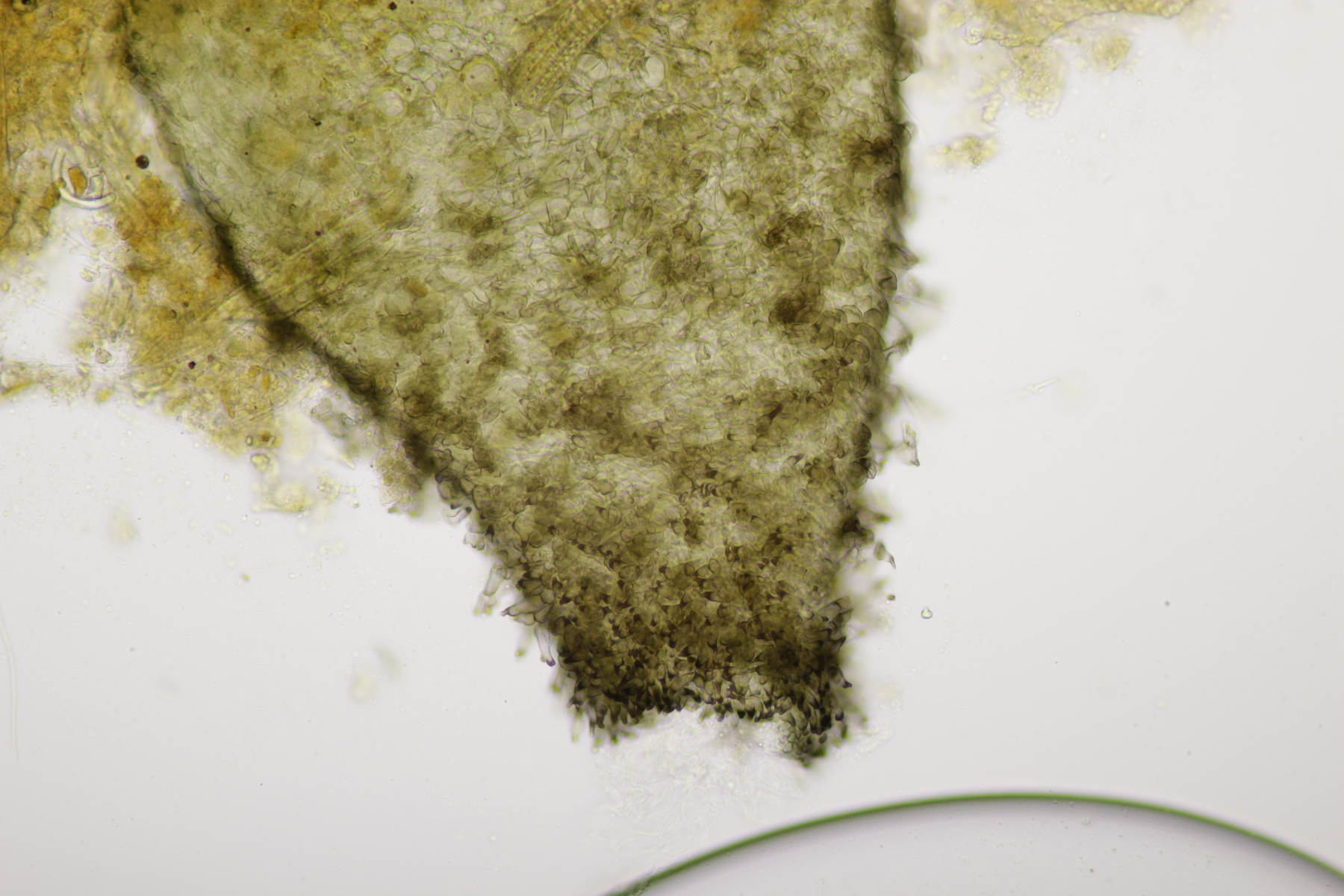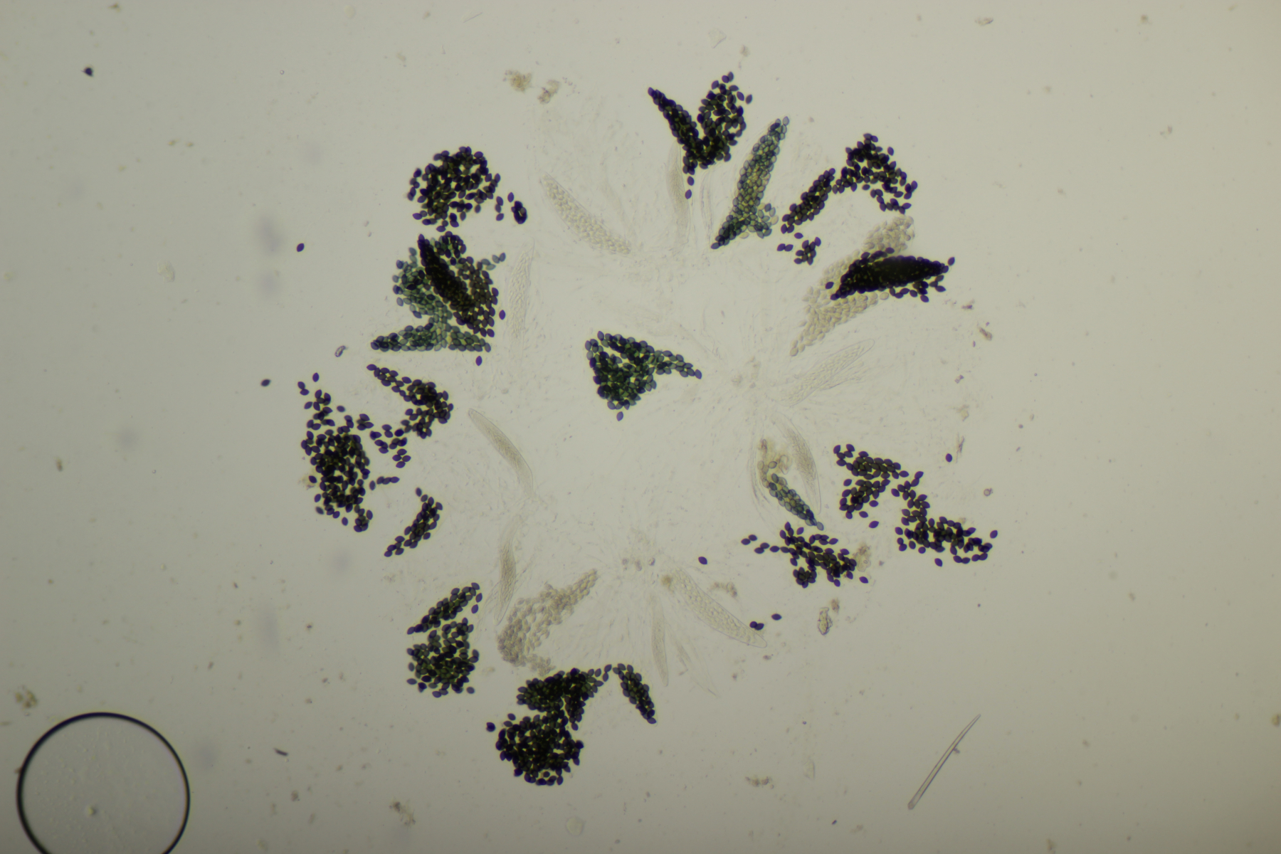4. Hier hatte ich im Feld erst an kleine Becher gedacht. Aber im Mikroskop entpuppte sich das Ganze dann als Basidiomycet. Hat da jemand eine Idee zu?