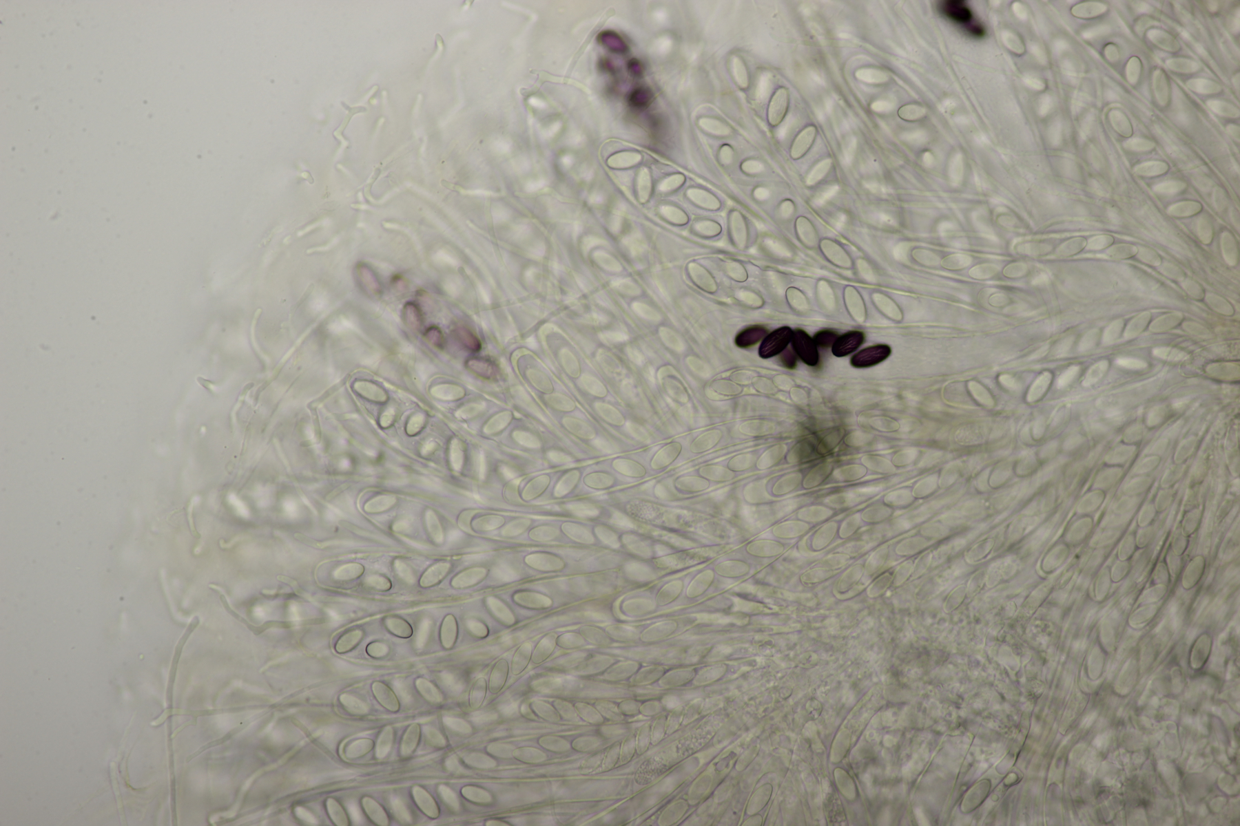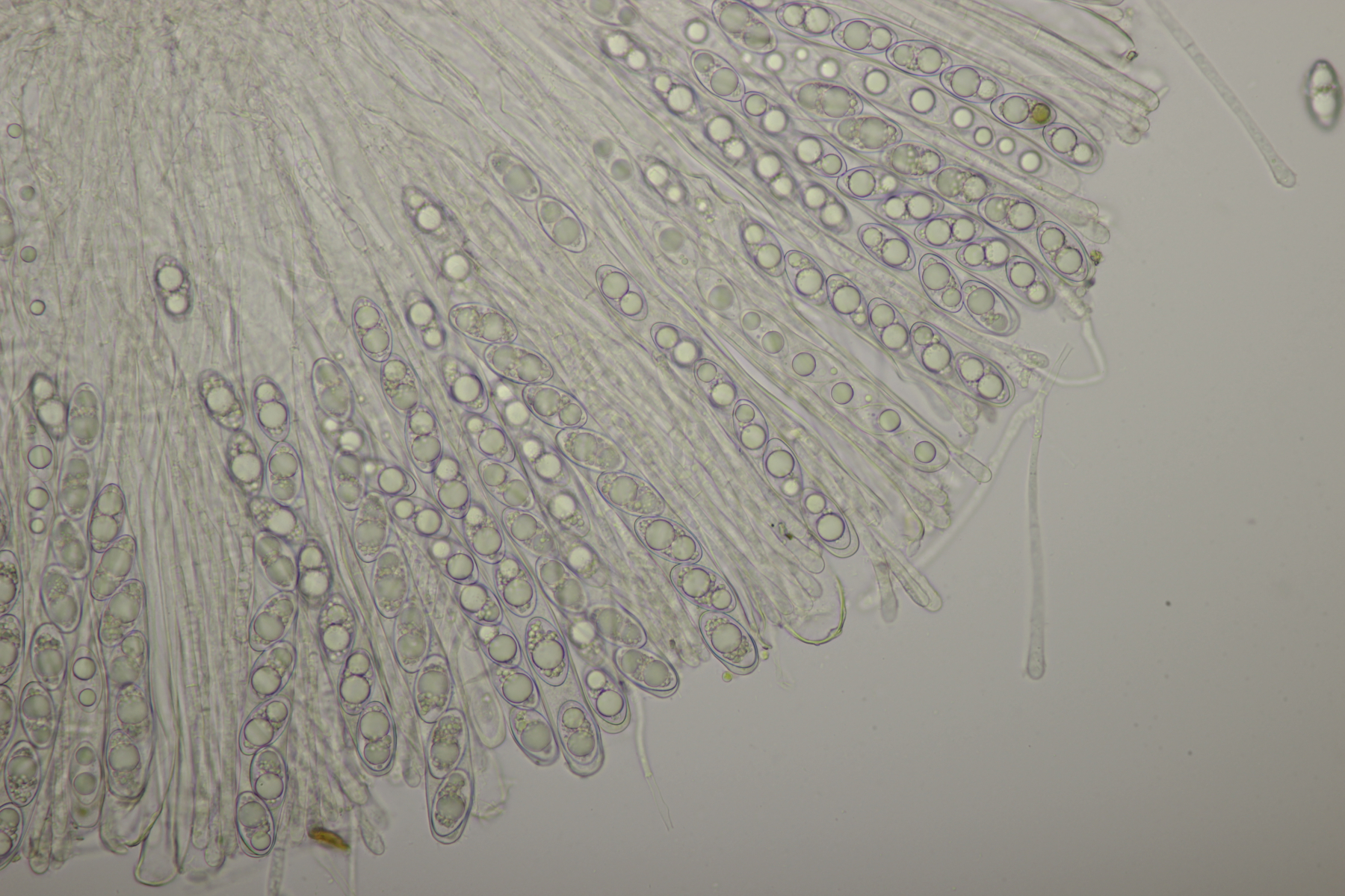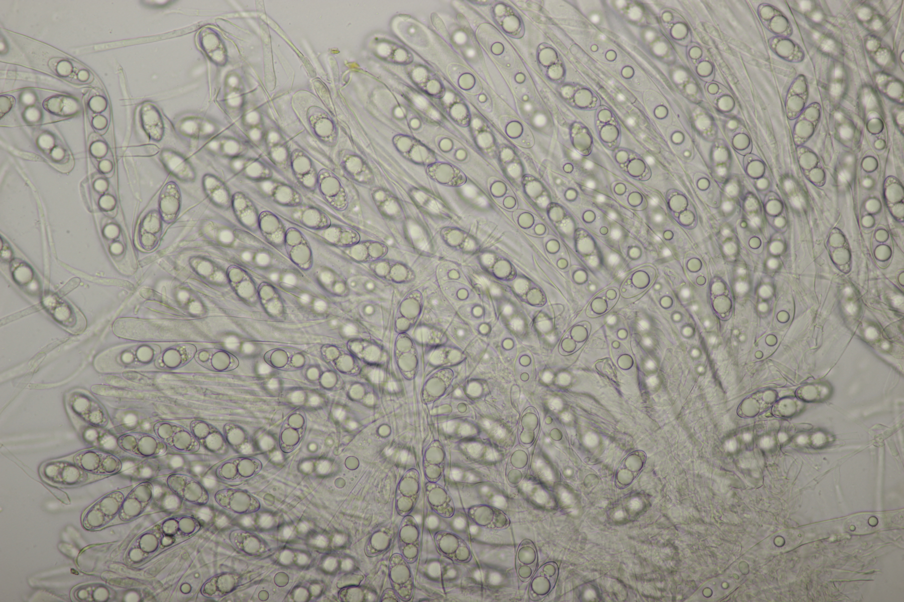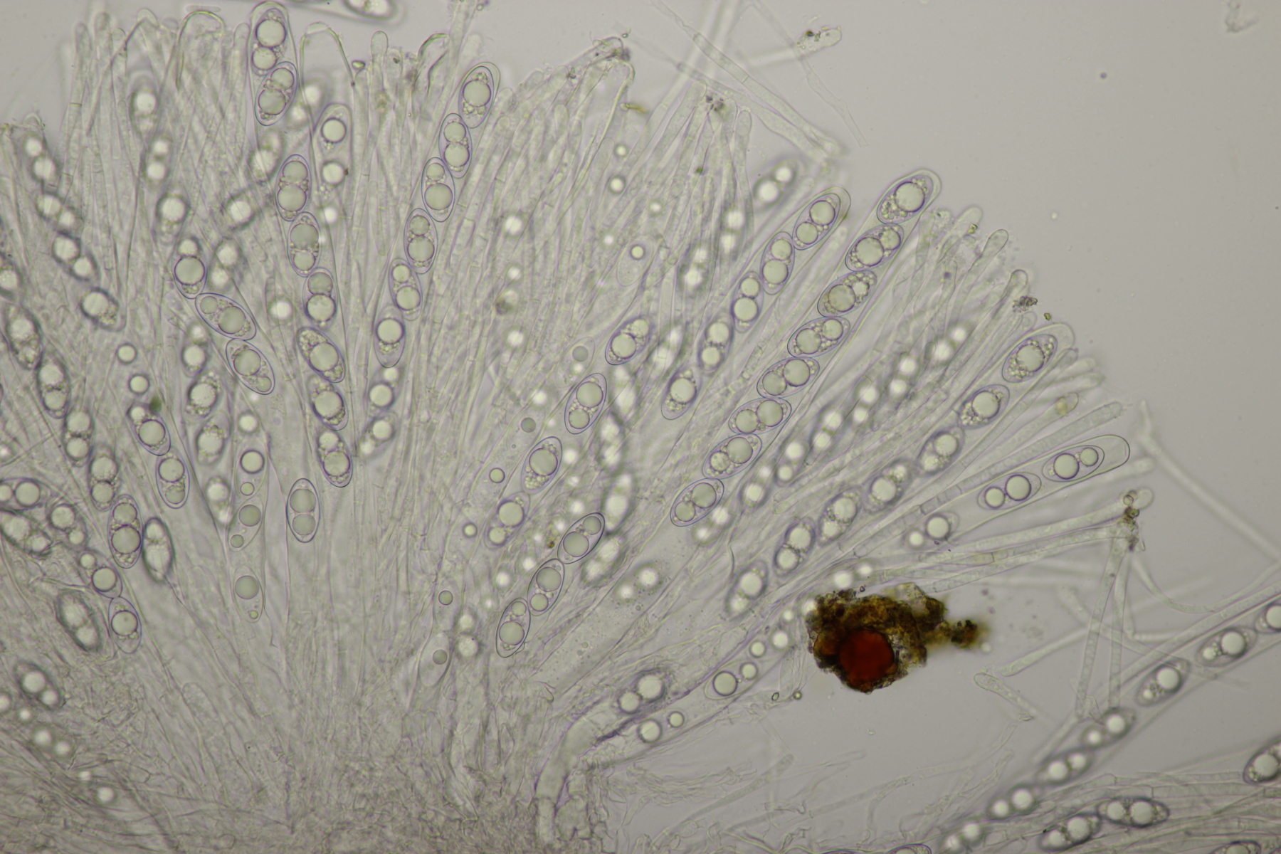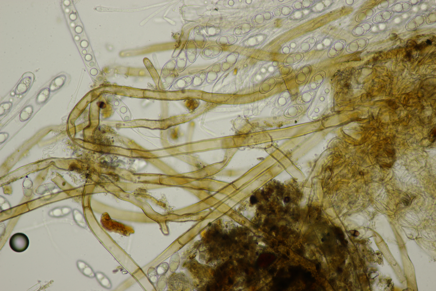 ich hatte eine Probe mitgenommen, bei der mittlerweile auch einige wenige Fruchtkörper reif geworden sind. Mikroskopisch sieht das ganze dann folgendermaßen aus: