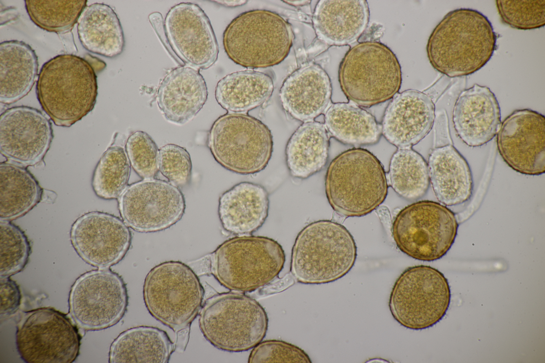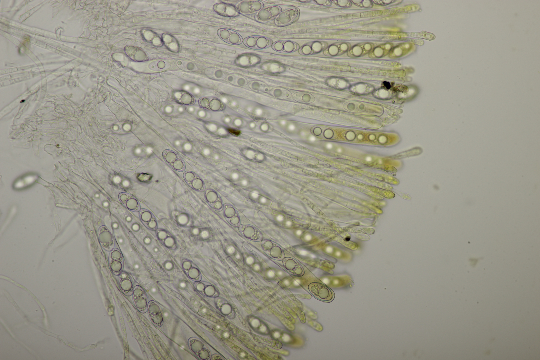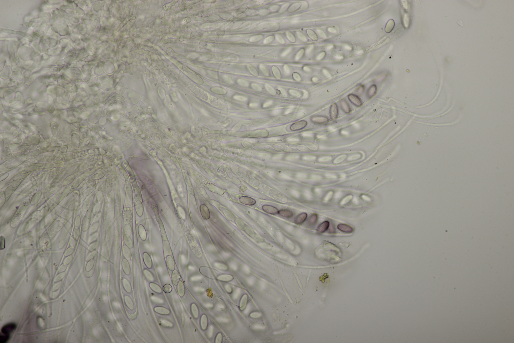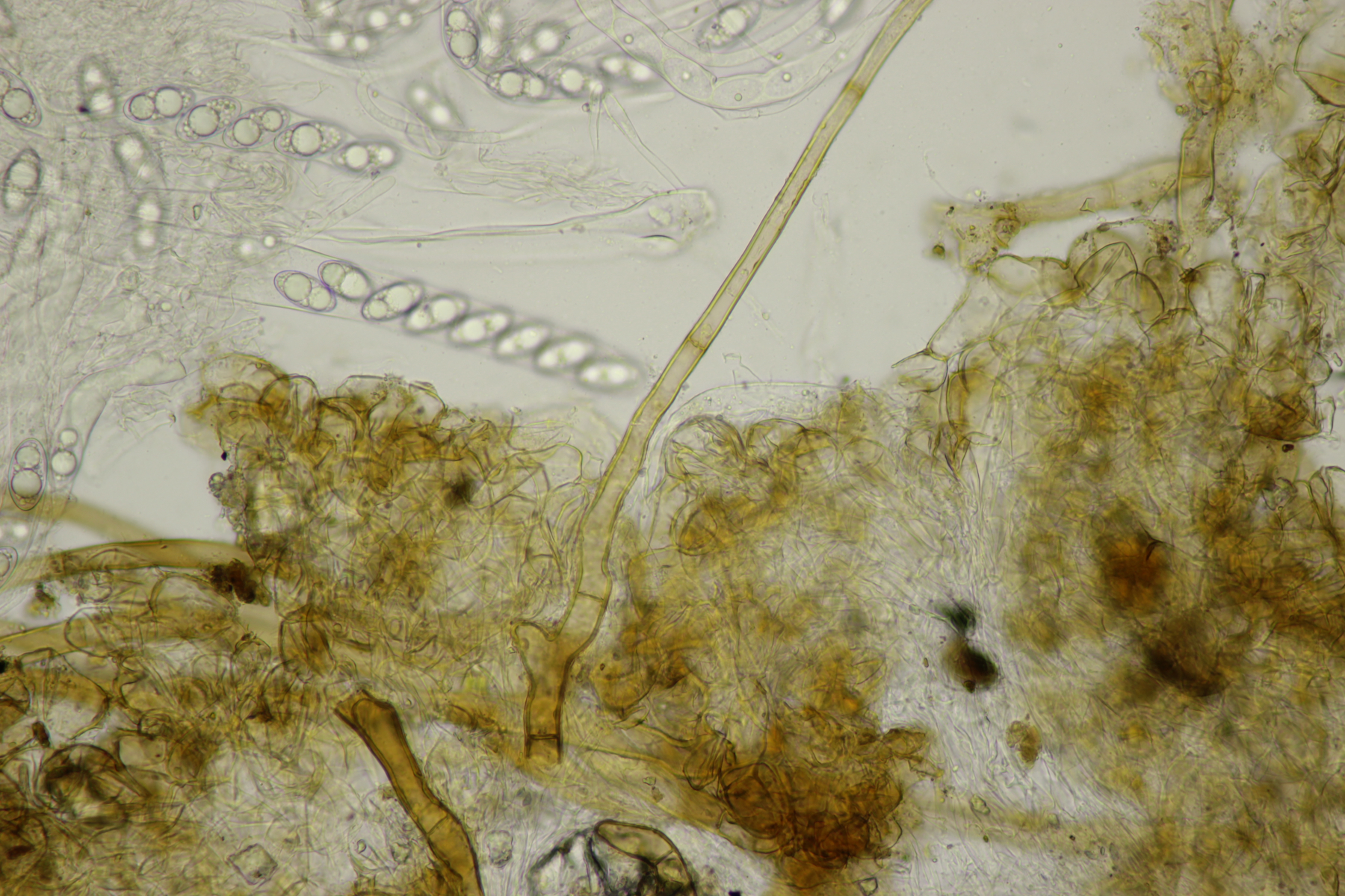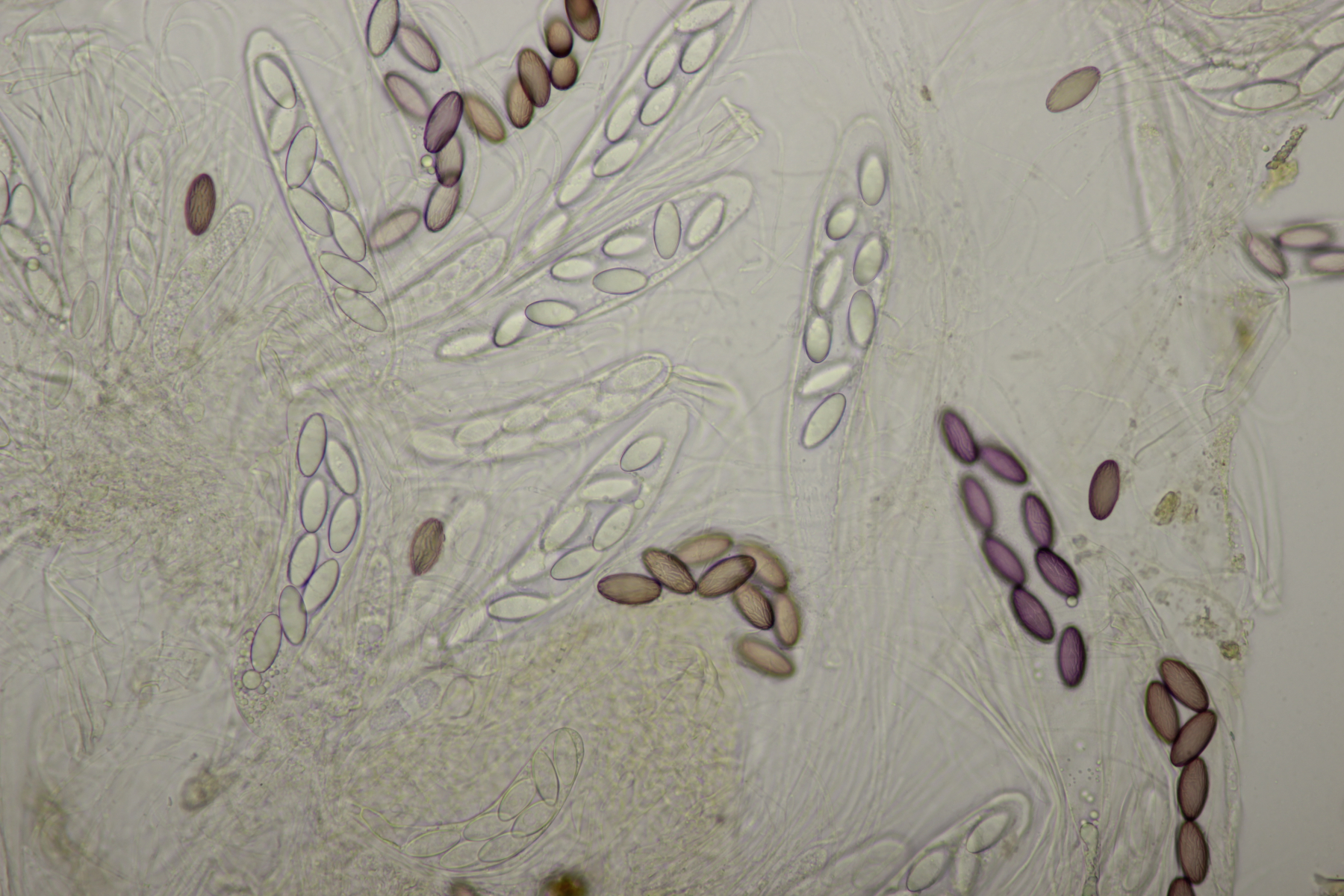 ich hatte eine Probe mitgenommen, bei der mittlerweile auch einige wenige Fruchtkörper reif geworden sind. Mikroskopisch sieht das ganze dann folgendermaßen aus: