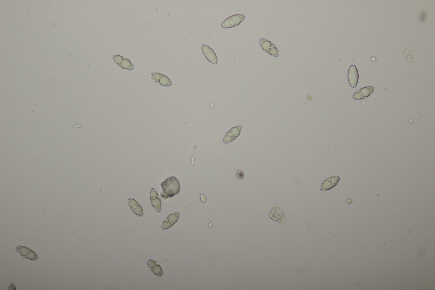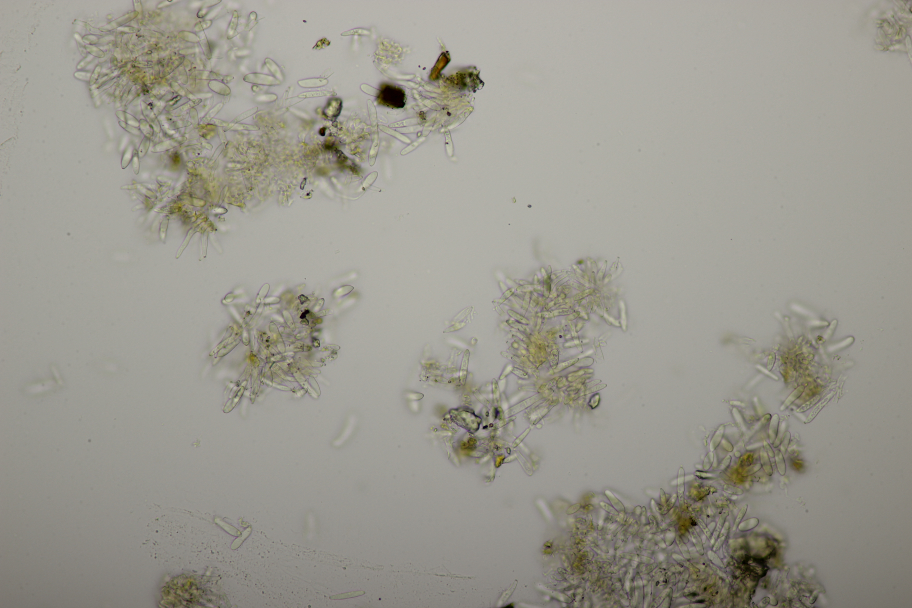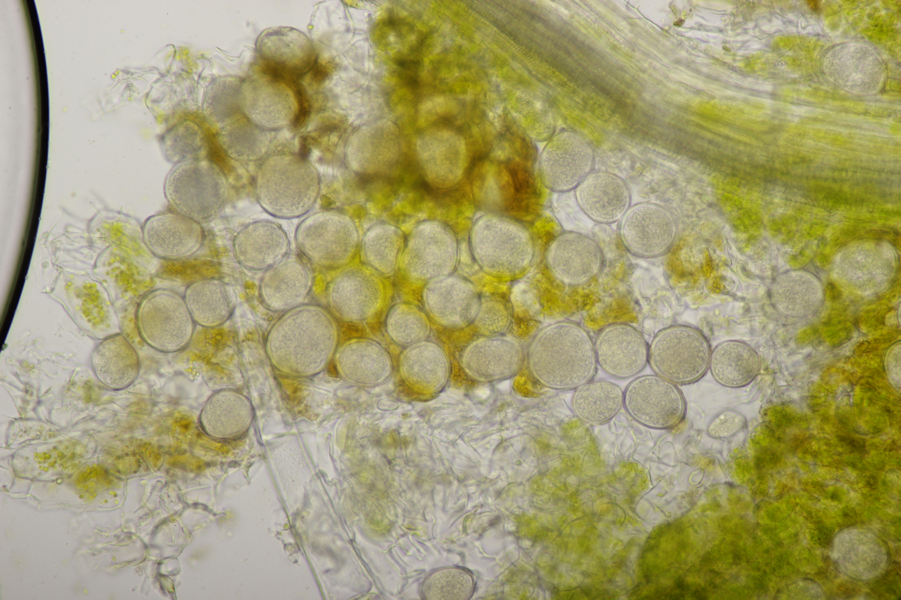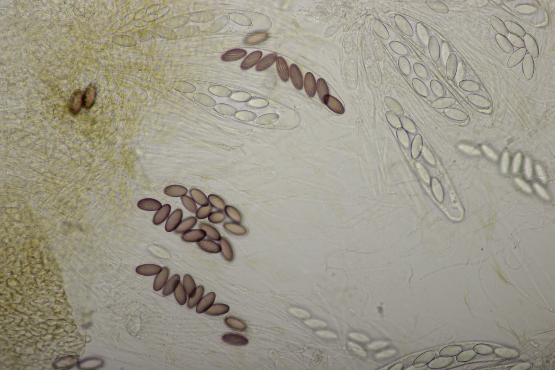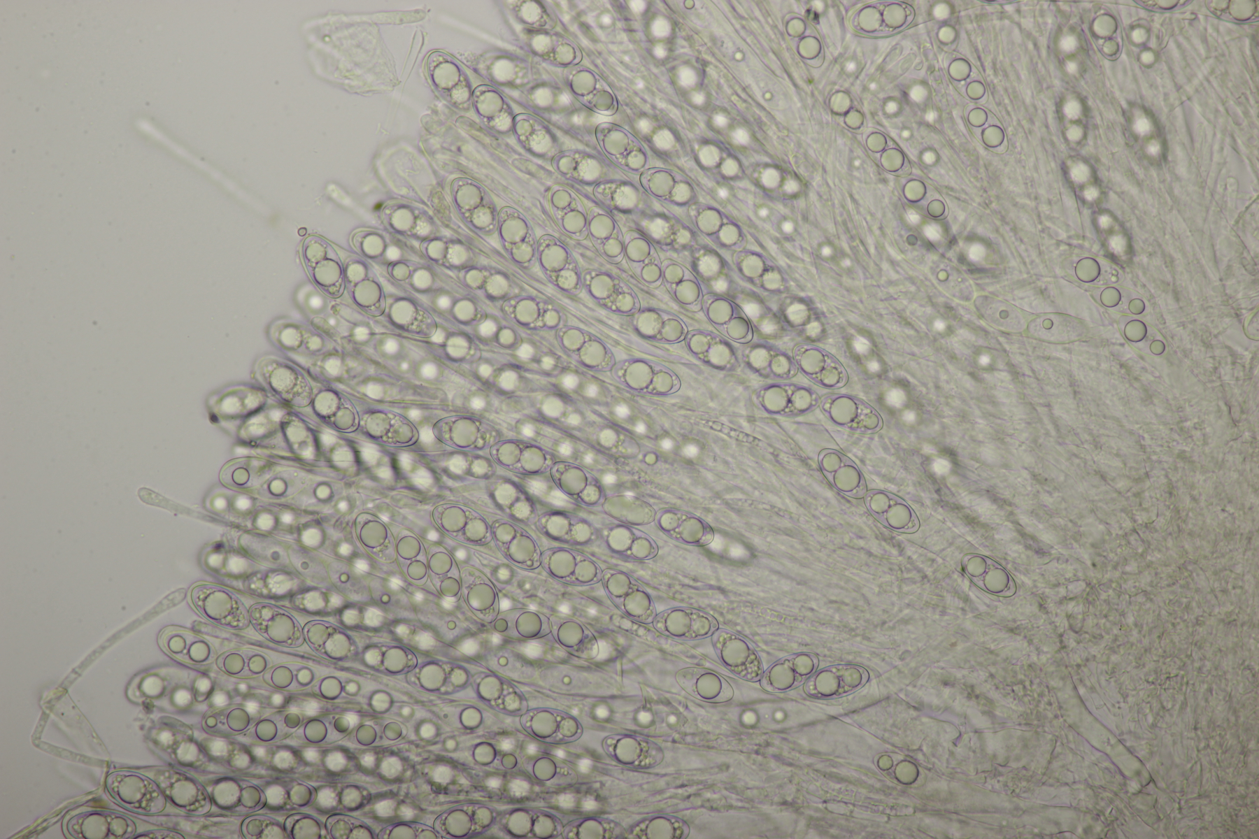 ich hatte eine Probe mitgenommen, bei der mittlerweile auch einige wenige Fruchtkörper reif geworden sind. Mikroskopisch sieht das ganze dann folgendermaßen aus: