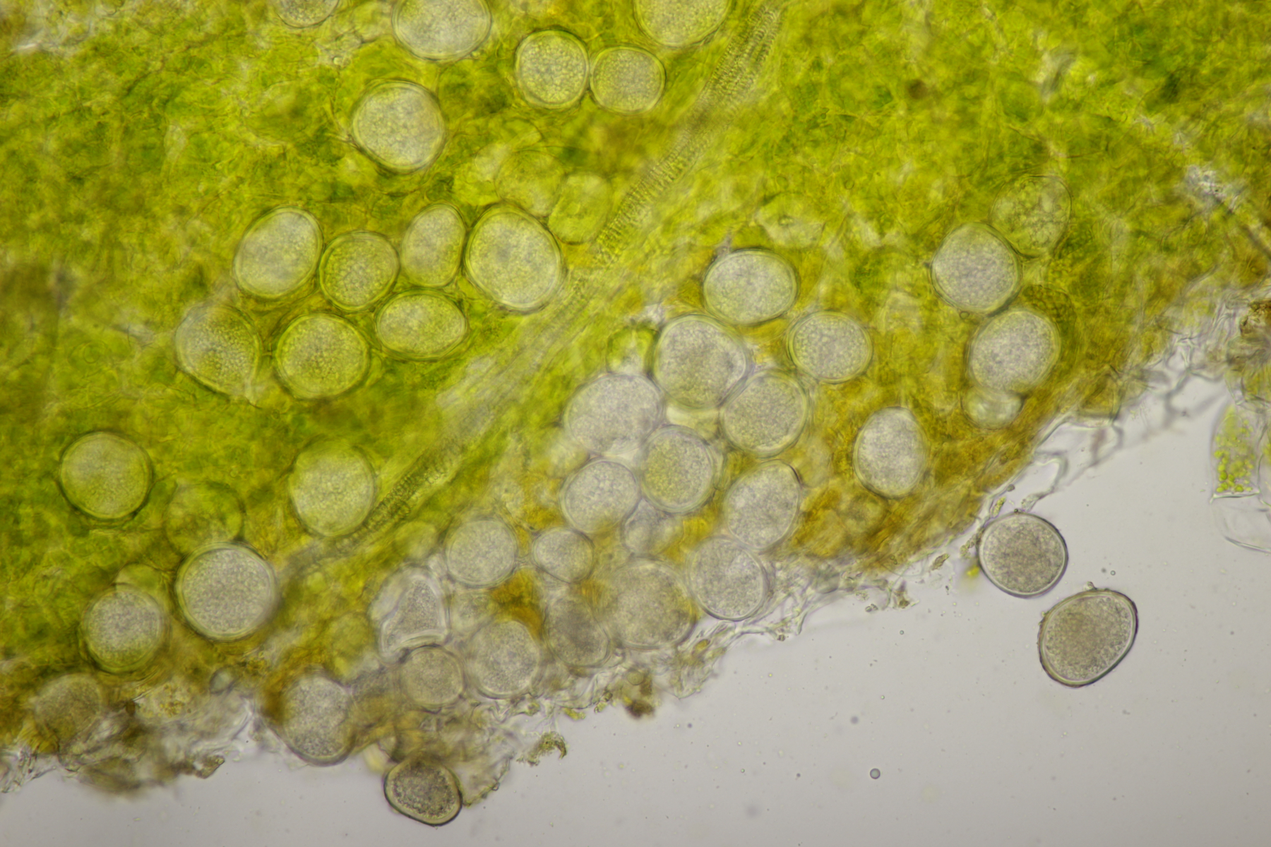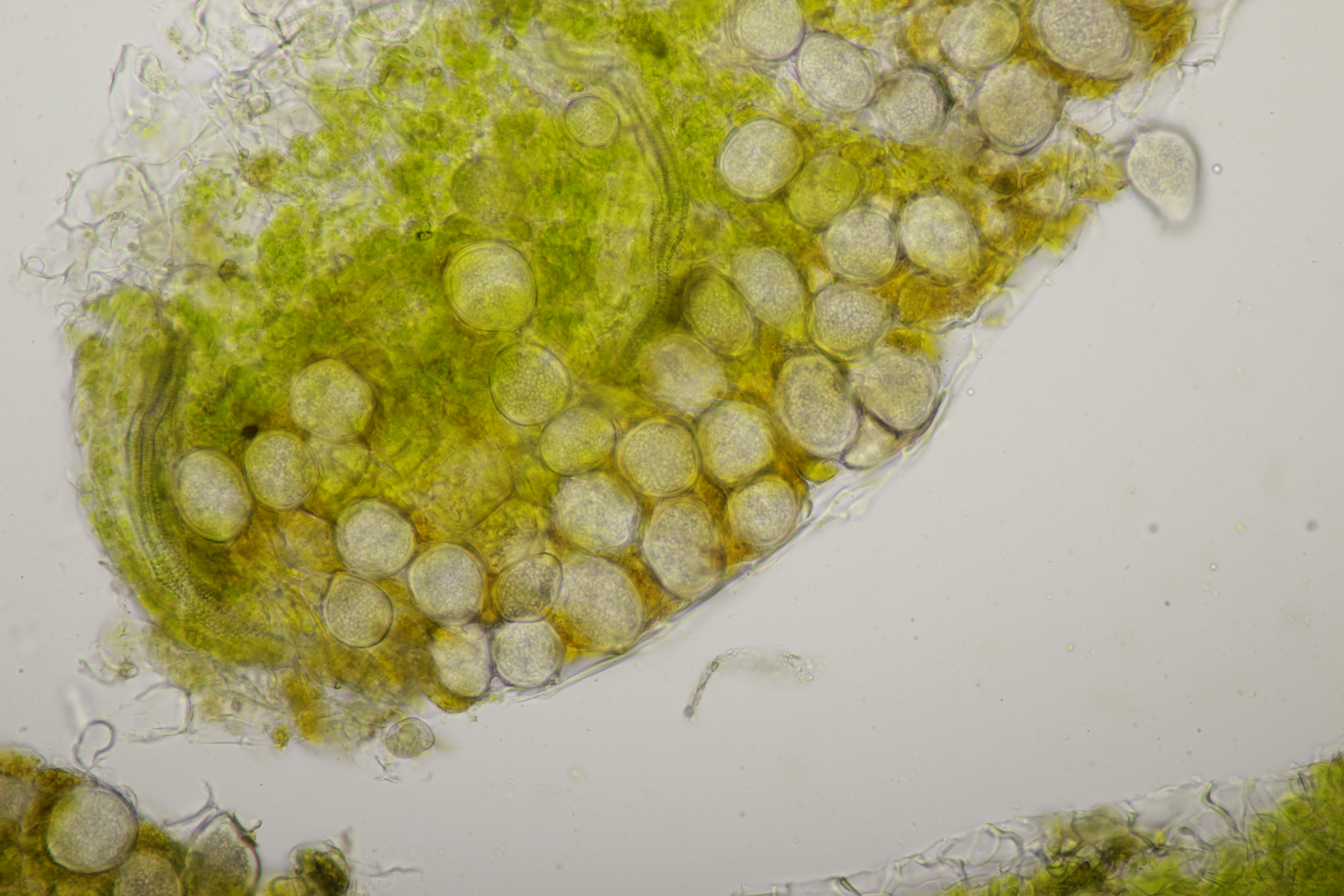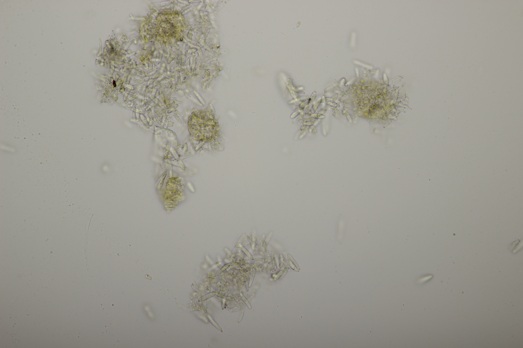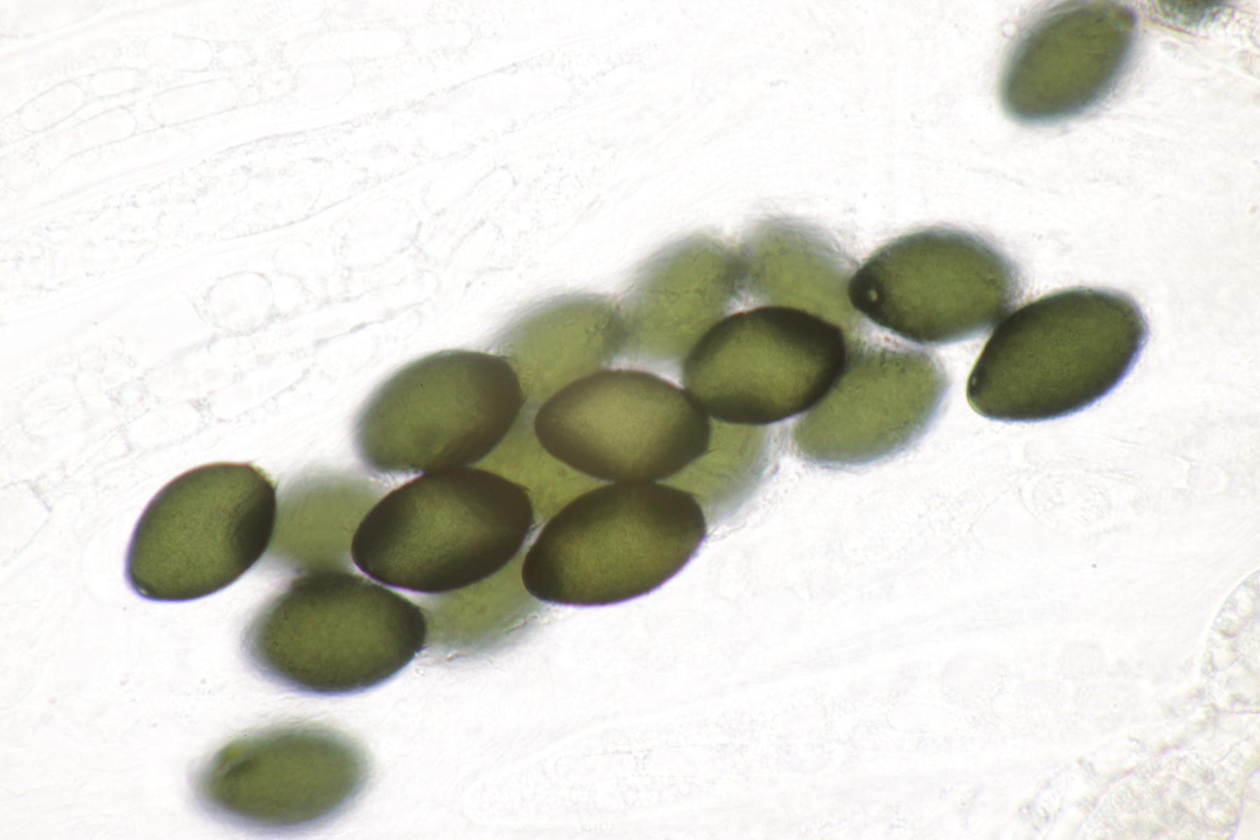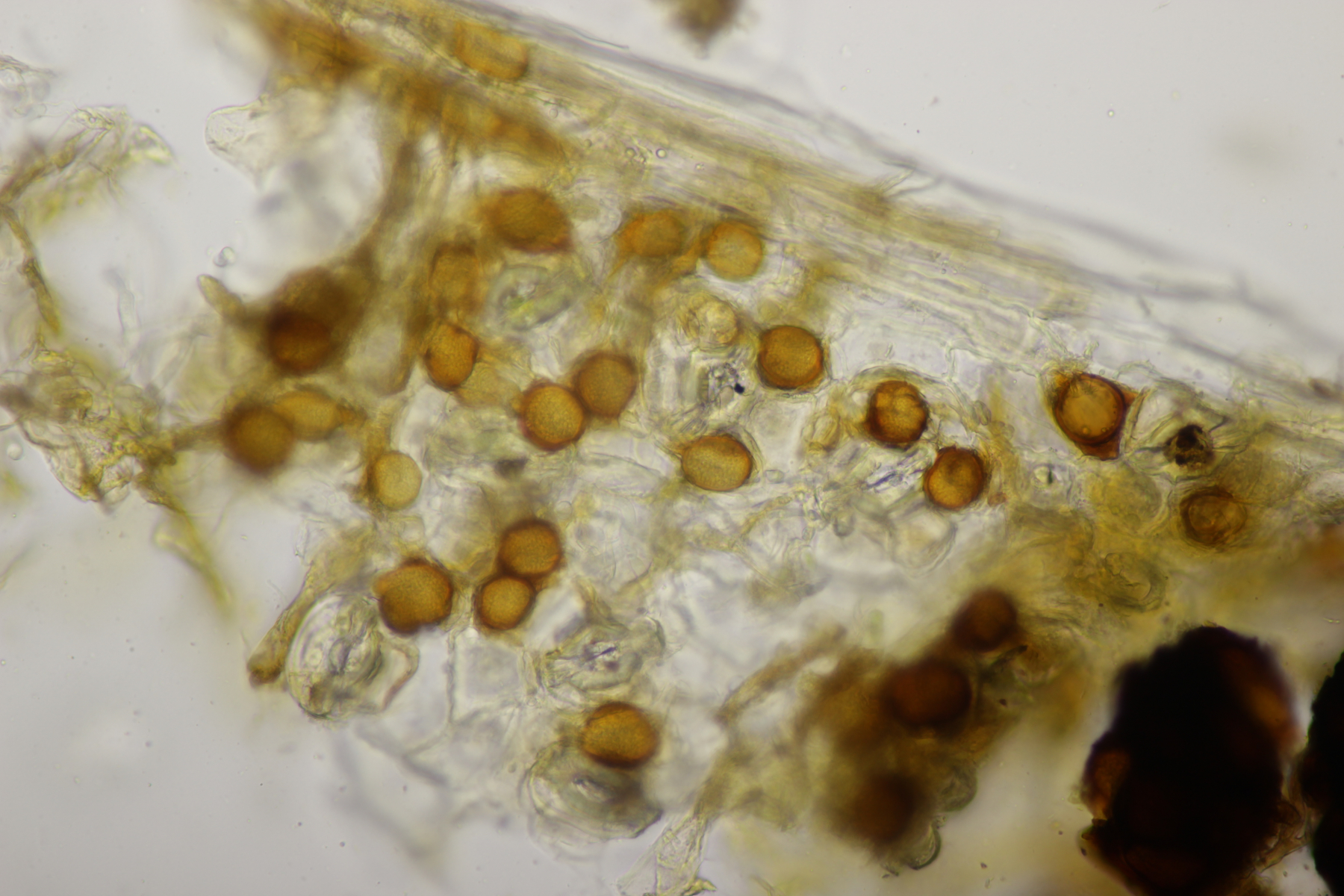 ich hatte eine Probe mitgenommen, bei der mittlerweile auch einige wenige Fruchtkörper reif geworden sind. Mikroskopisch sieht das ganze dann folgendermaßen aus: