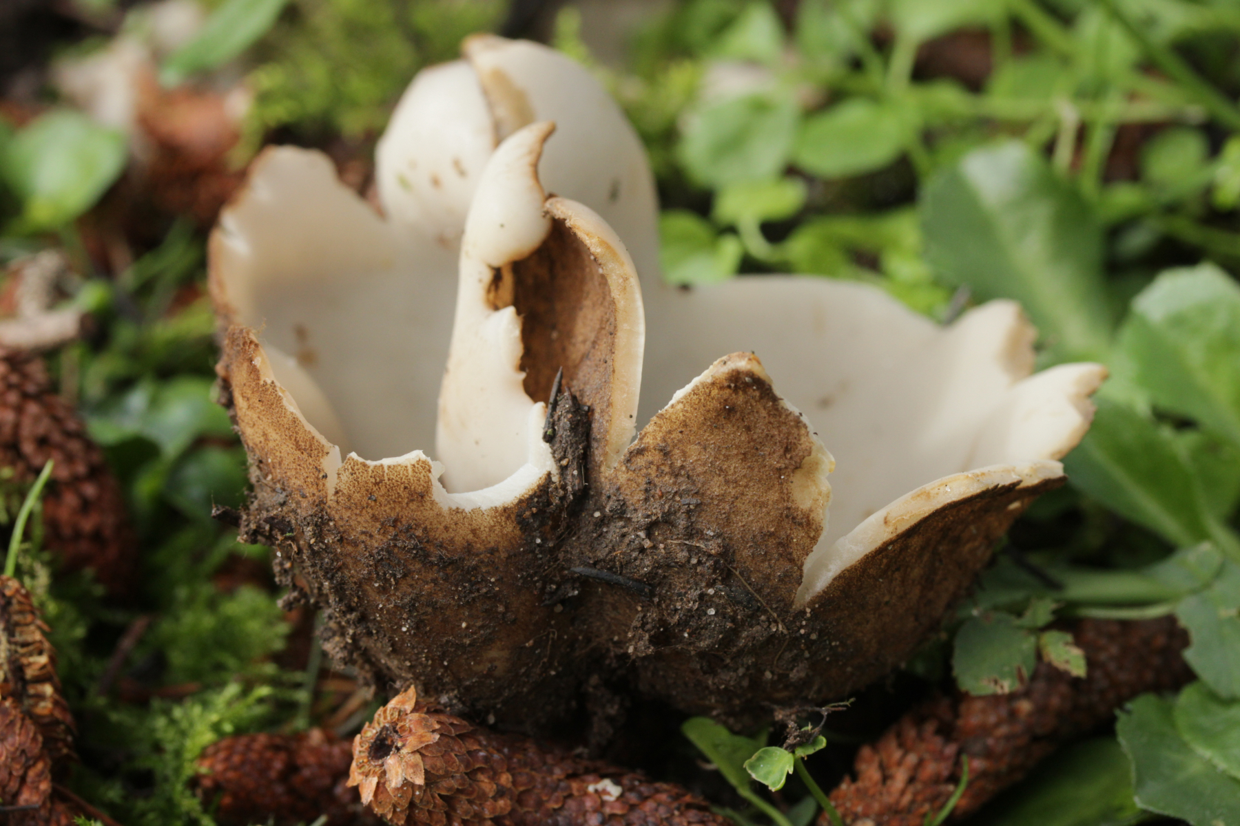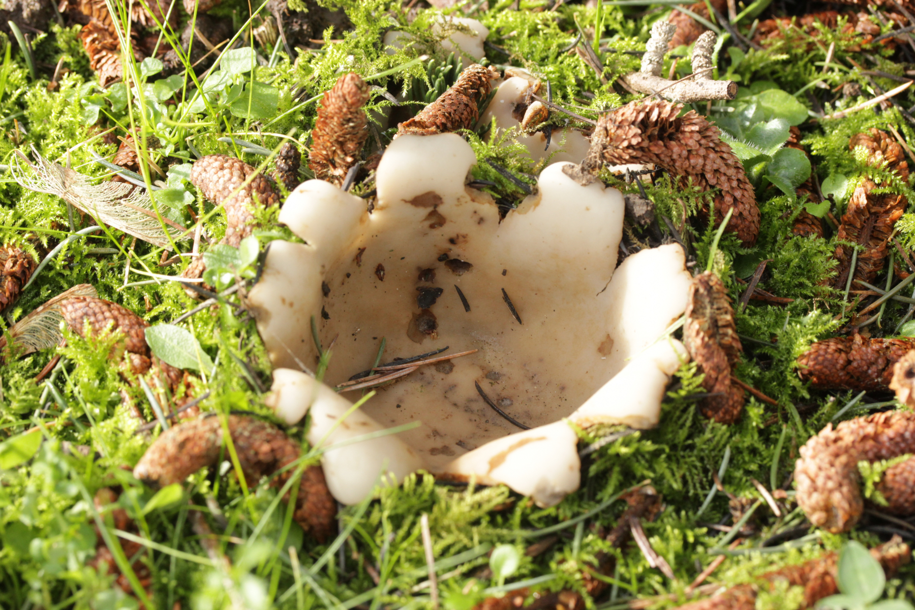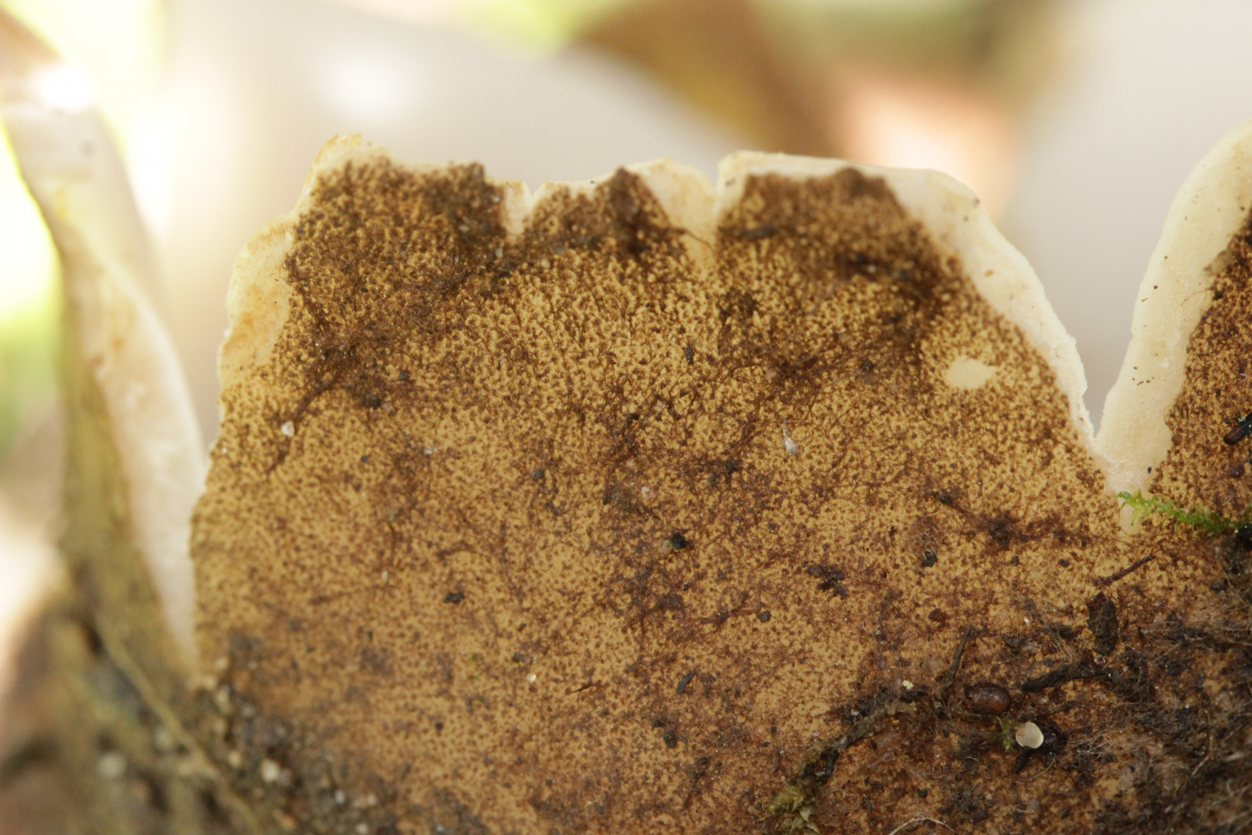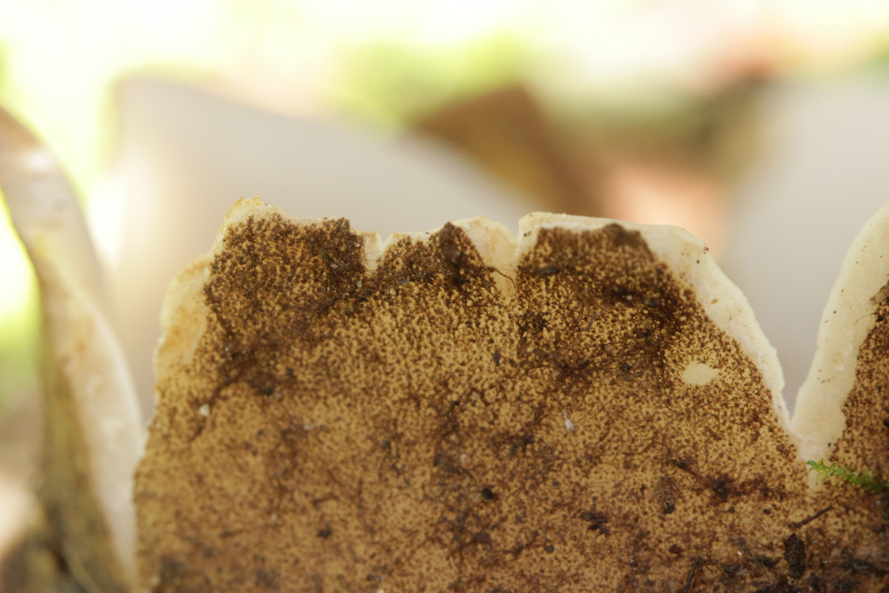 Dann noch mal zu den dicken Brocken. Farblich auch wieder kein echtes Weiß, sondern mit leichtem Gelbton. Die Fruchtkörper sind deutlich größer und von der Form her eher halbkugelförmig. Sporen (19-21) µm x (8-10) µm.