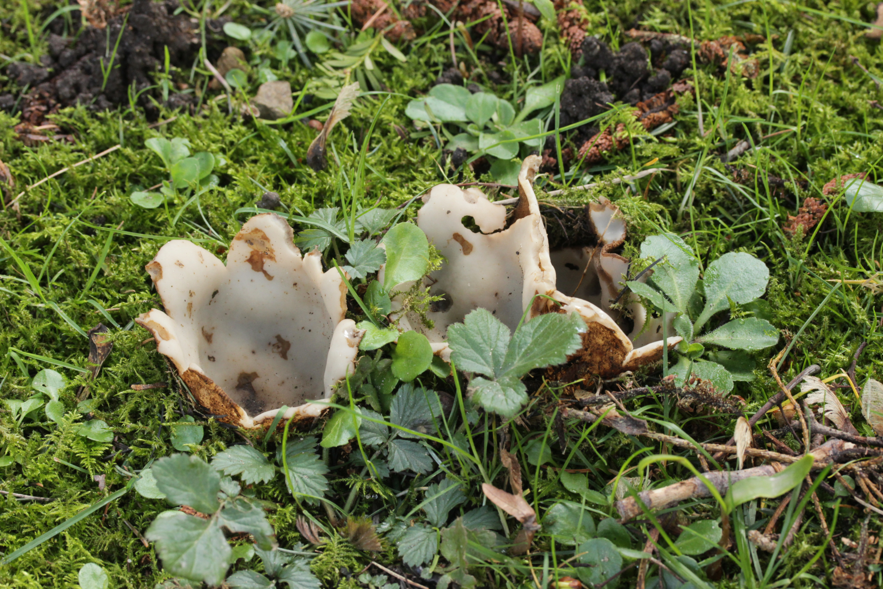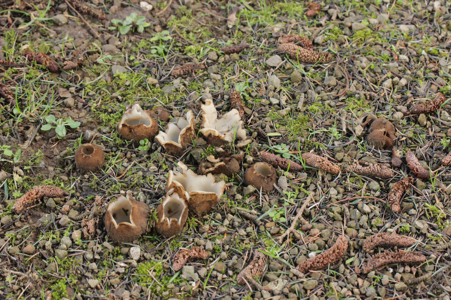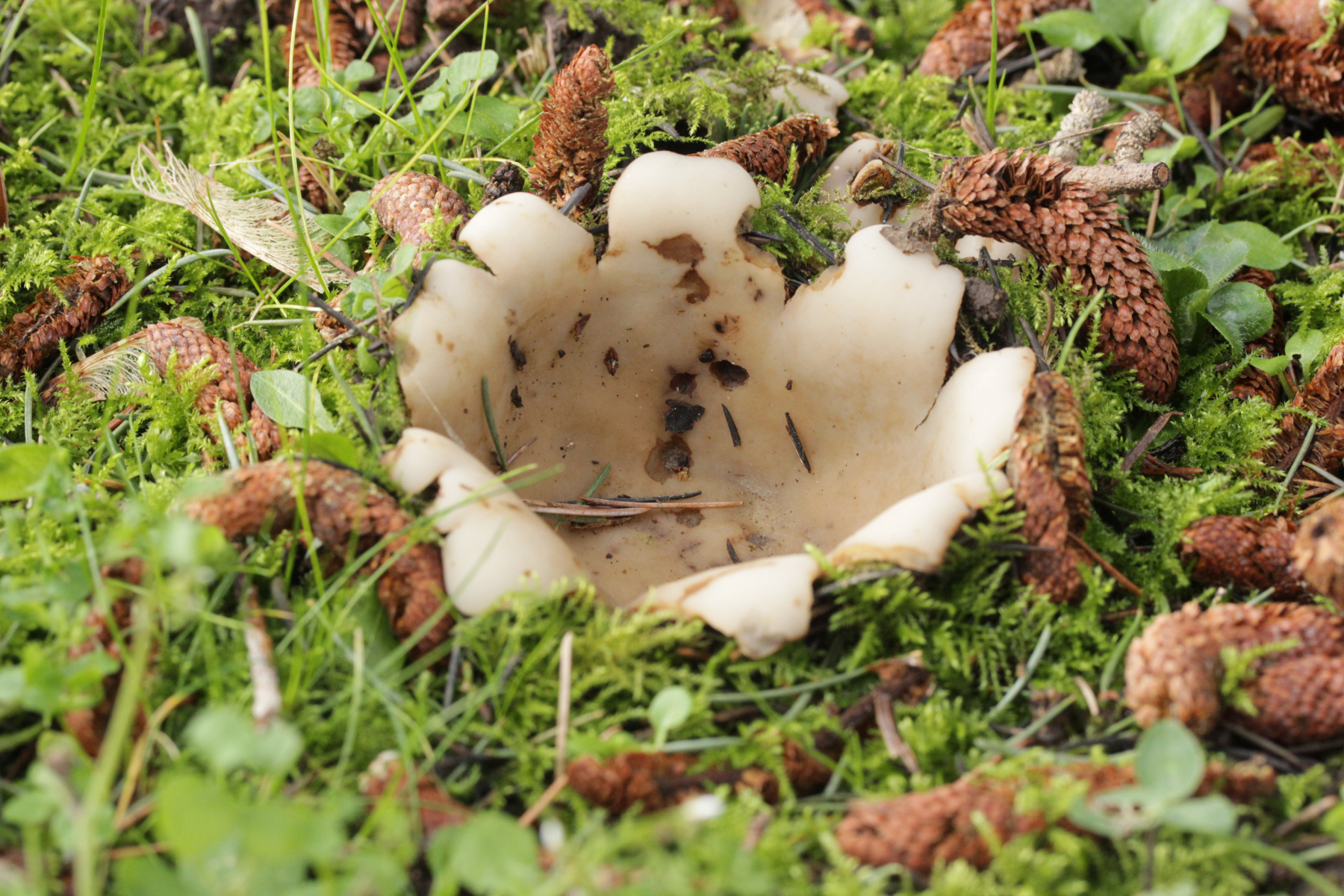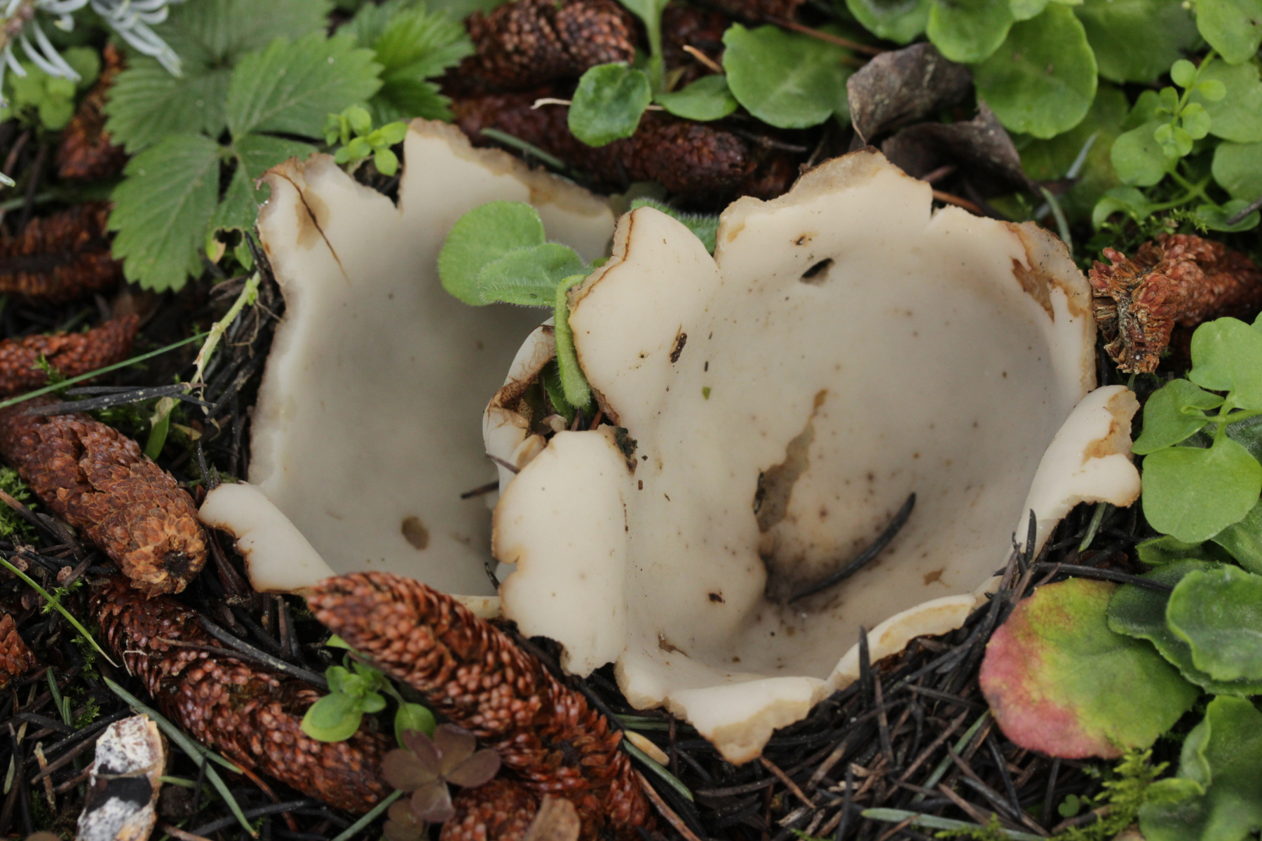 Dann noch mal zu den dicken Brocken. Farblich auch wieder kein echtes Weiß, sondern mit leichtem Gelbton. Die Fruchtkörper sind deutlich größer und von der Form her eher halbkugelförmig. Sporen (19-21) µm x (8-10) µm.