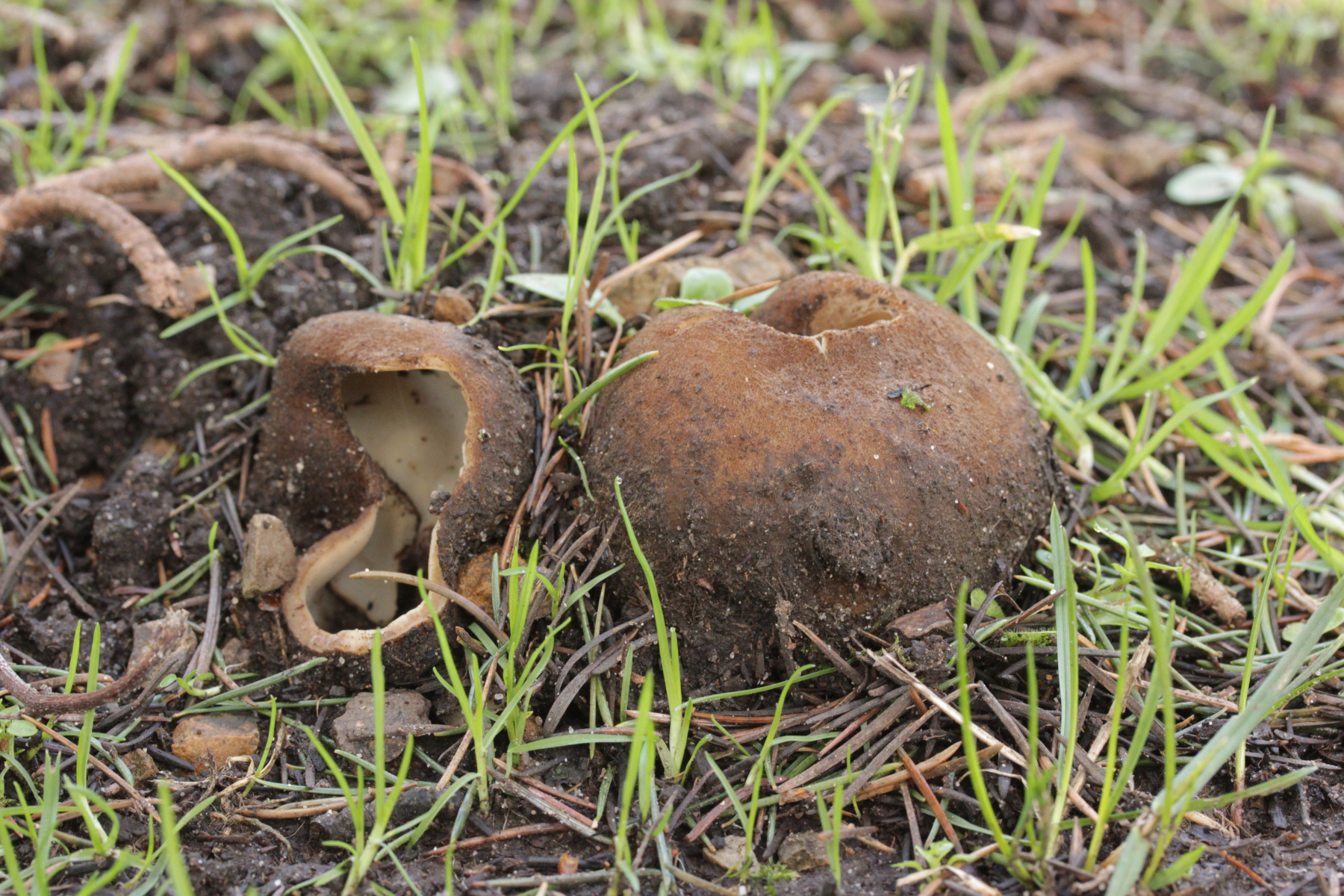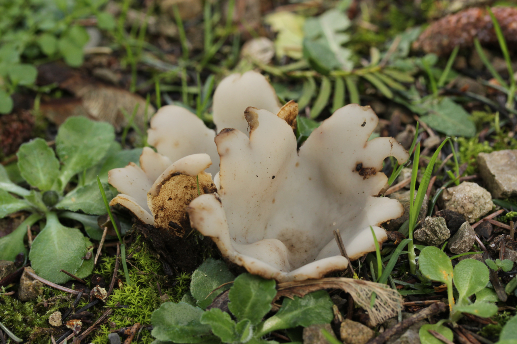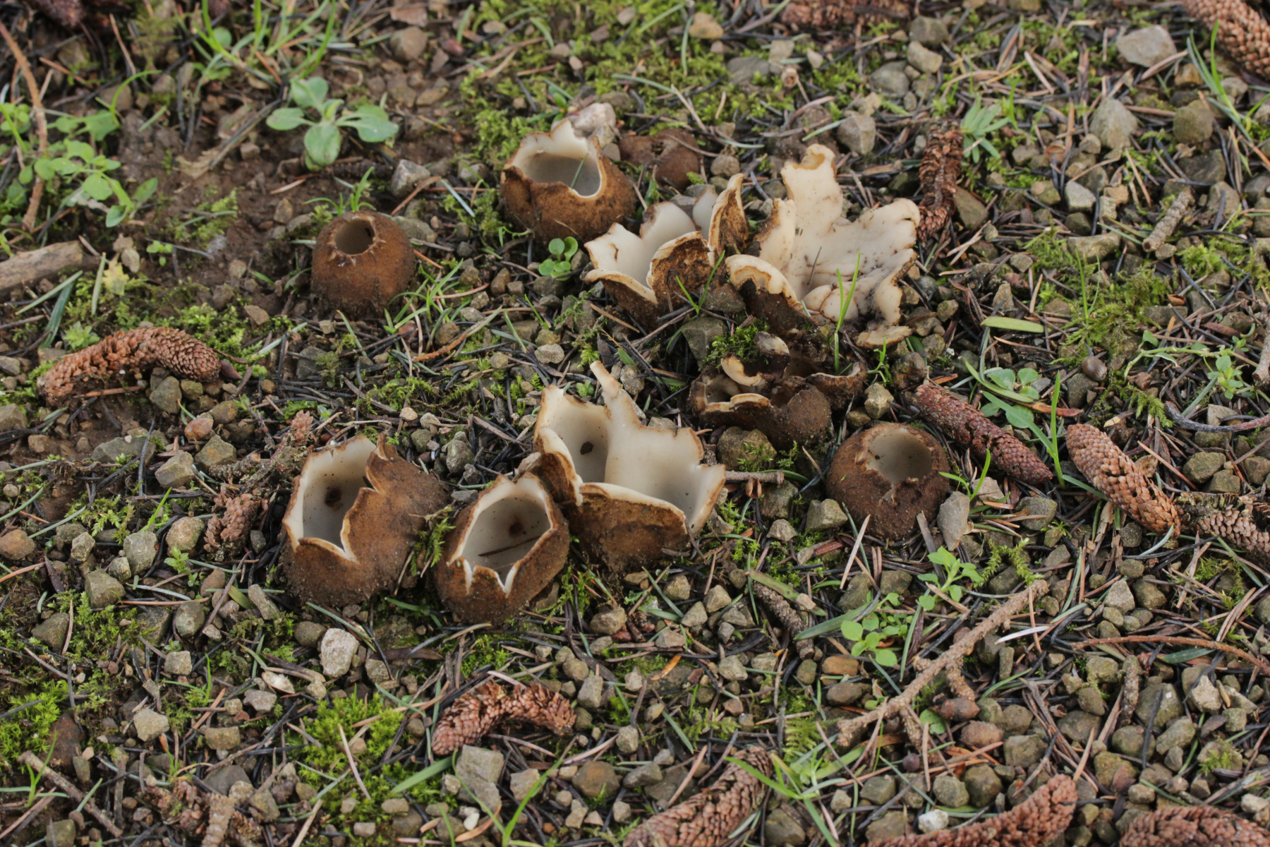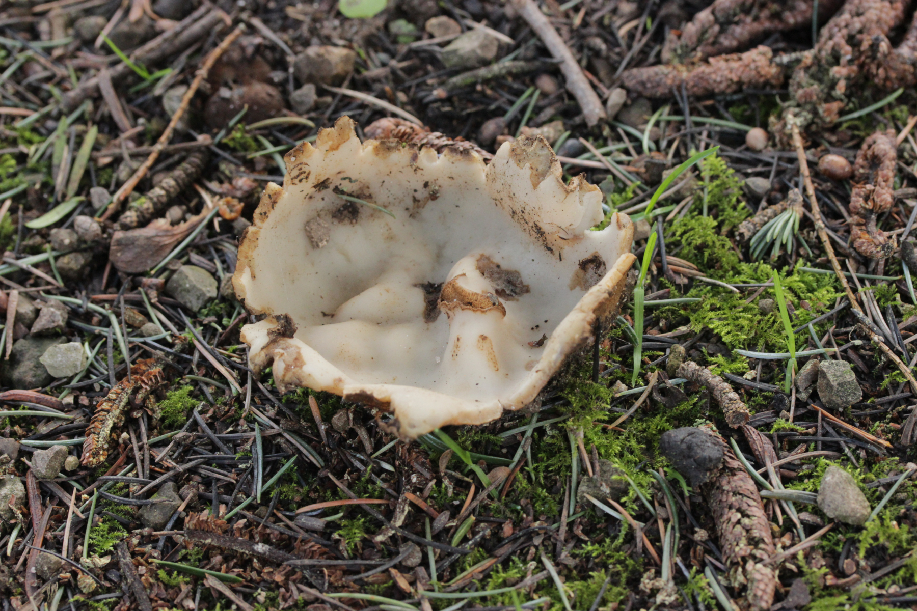 Dann noch mal zu den dicken Brocken. Farblich auch wieder kein echtes Weiß, sondern mit leichtem Gelbton. Die Fruchtkörper sind deutlich größer und von der Form her eher halbkugelförmig. Sporen (19-21) µm x (8-10) µm.
