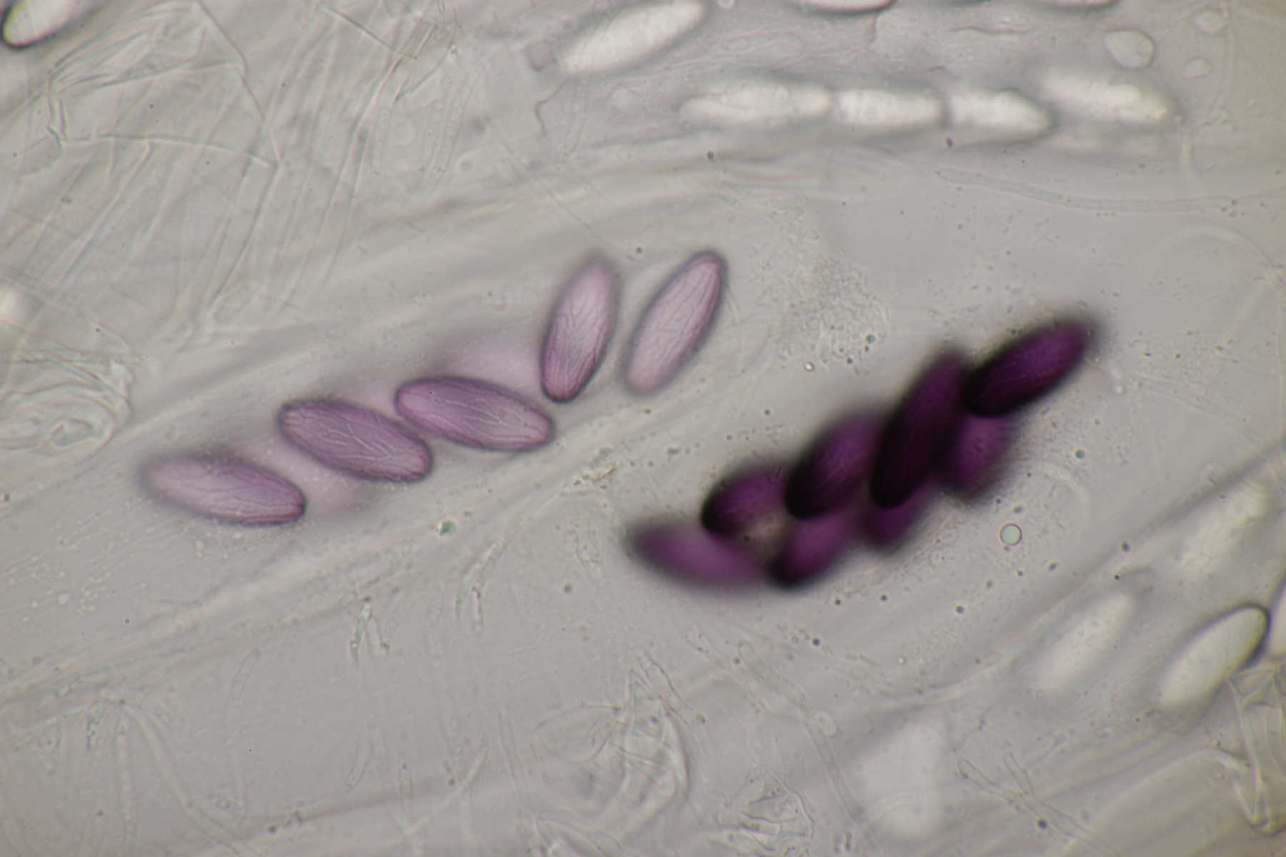 Zunächst habe ich mir einen der kleinen geschnappt. Sporengröße (28-29) µm x (10-12) µm, Sporen sind gestreift.