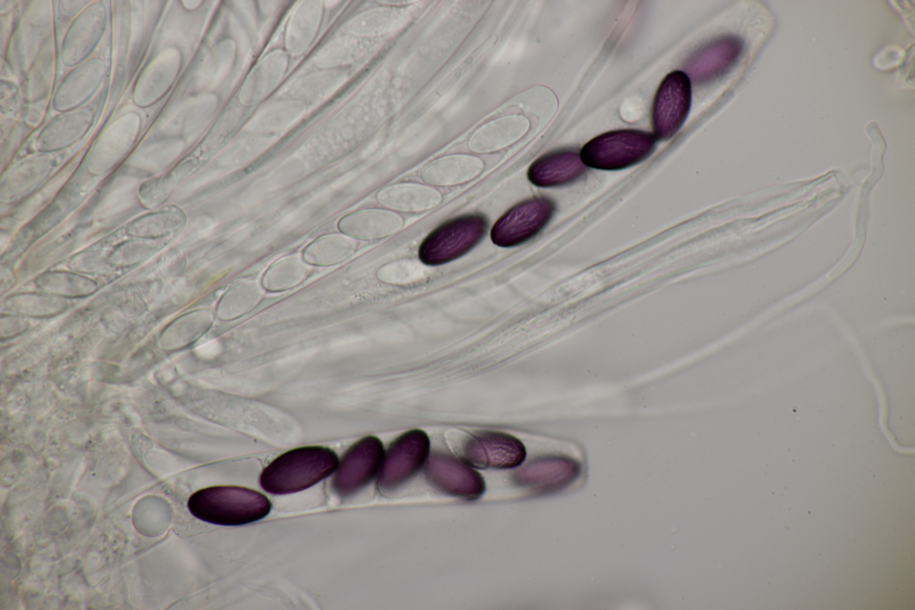 Ich habe gestern Abend auch noch mal ein wenig in meine Funde reingeschaut. Zunächst mal der kleine Ascobolus albidus. Rein-weiß erscheint er mir zwar nach wie vor nicht, ein gewissen Gelbton ist meiner Meinung nach dabei, aber das scheint laut van Brummelen auch ok zu sein. Was die Form angeht, sind sie eindeutig höher als breit. Sporenmaße sind (25-27) µm x (11-12) µm. Paßt also alles soweit :)