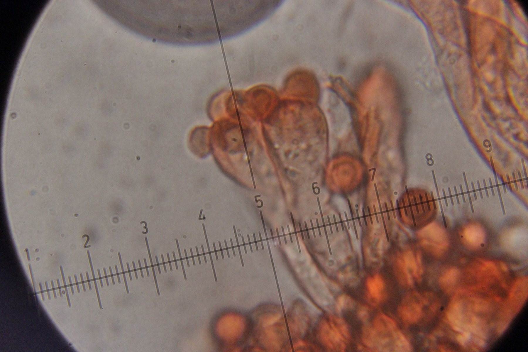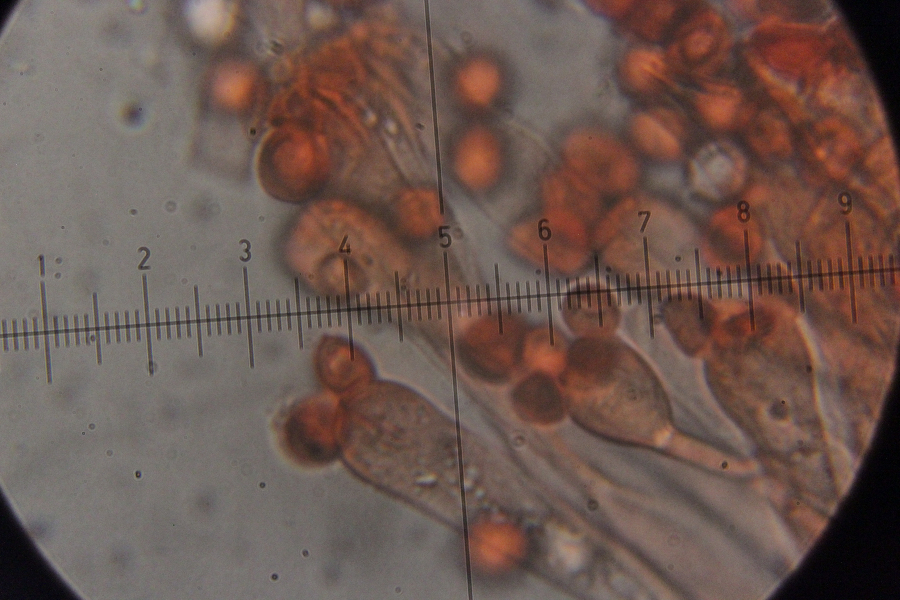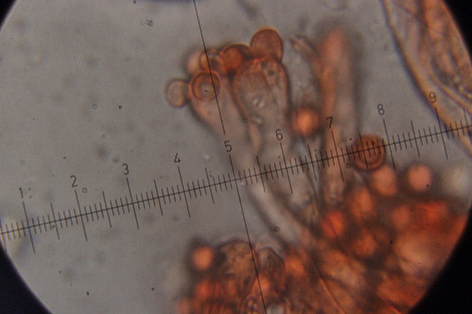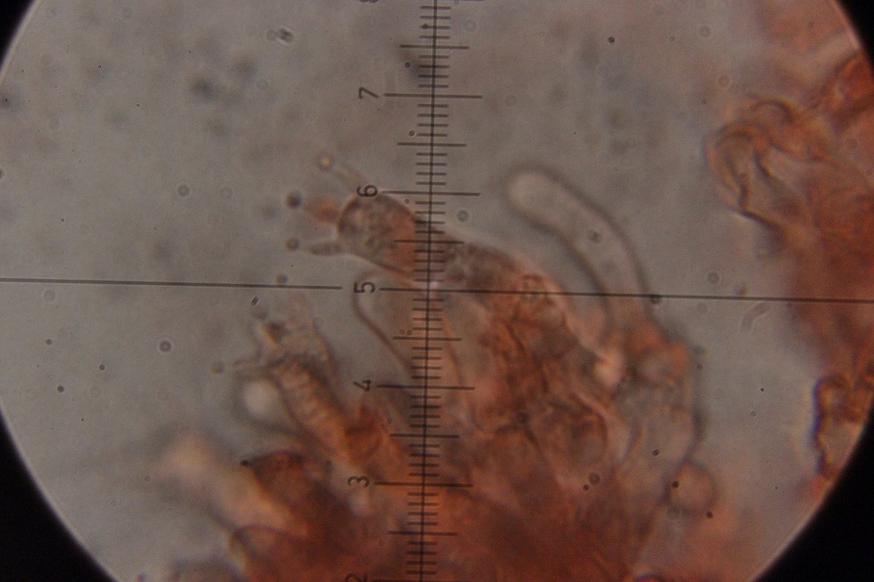 Mikroskopisch zeigen sich dann sehr lange Basidien. Oben an den Basidien werden die Sporen gebildet, allerdings nicht, wie sonst üblich, auf Sterigmen, sondern einfach direkt an den Basidien abspossend. Dabei können dann im Prinzip auch längere Ketten von Sporen gebildet werden. Die konnte ich aber nicht entdecken - aber ich quetsche meine Präparate ja auch immer wie irre.