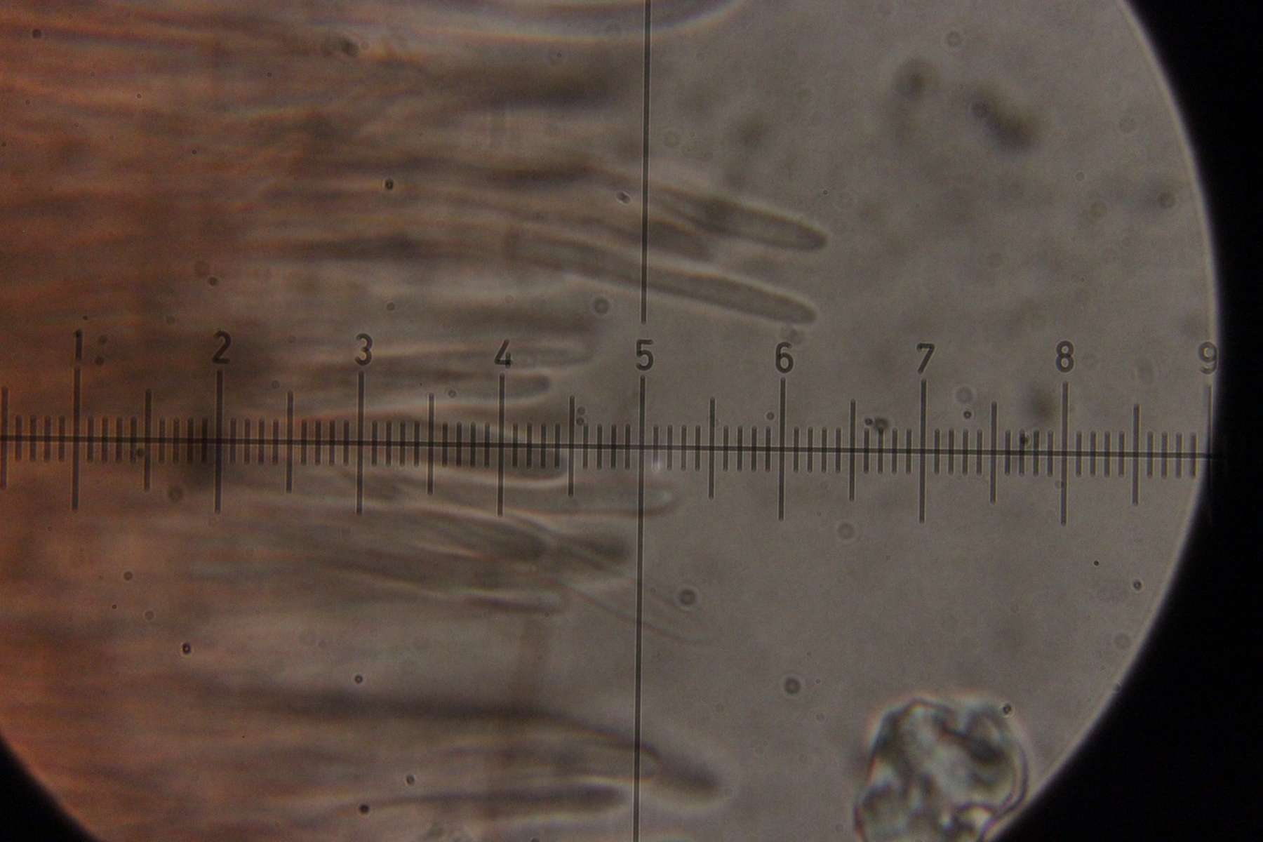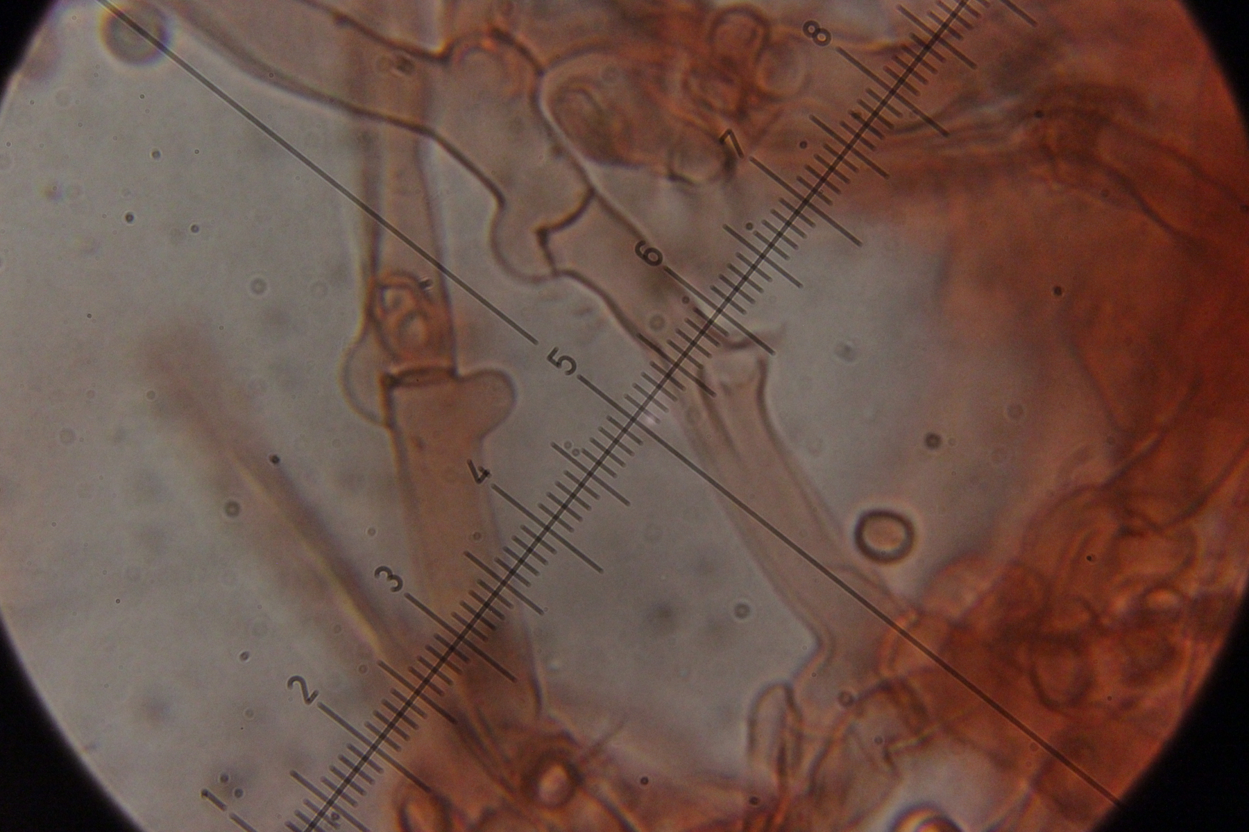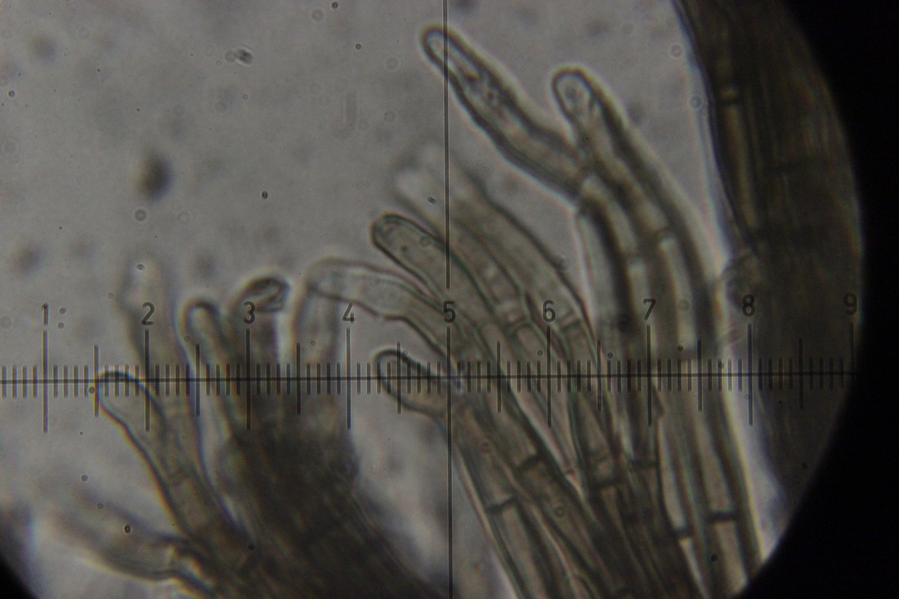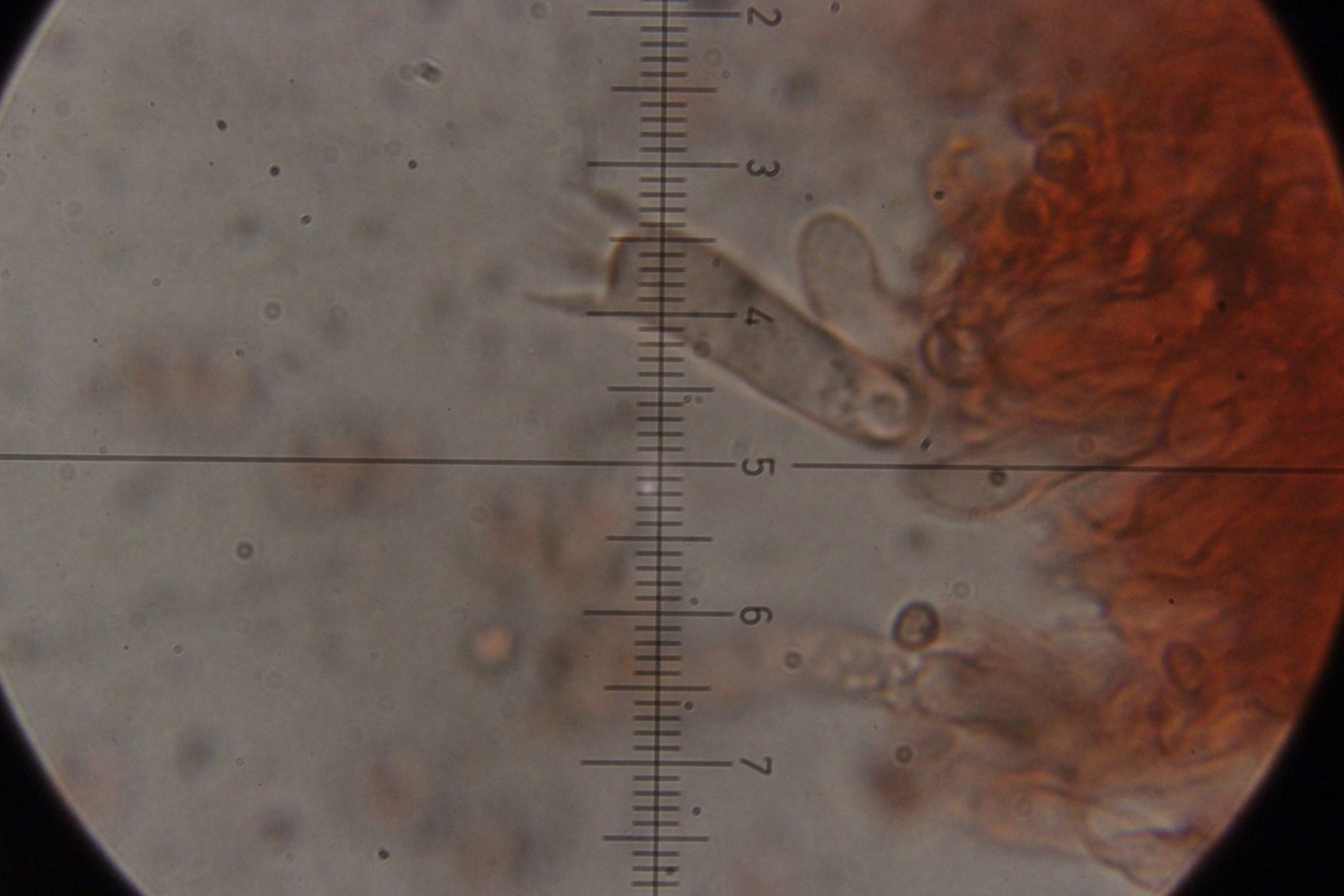 Mikroskopisch zeigen sich dann sehr lange Basidien. Oben an den Basidien werden die Sporen gebildet, allerdings nicht, wie sonst üblich, auf Sterigmen, sondern einfach direkt an den Basidien abspossend. Dabei können dann im Prinzip auch längere Ketten von Sporen gebildet werden. Die konnte ich aber nicht entdecken - aber ich quetsche meine Präparate ja auch immer wie irre.