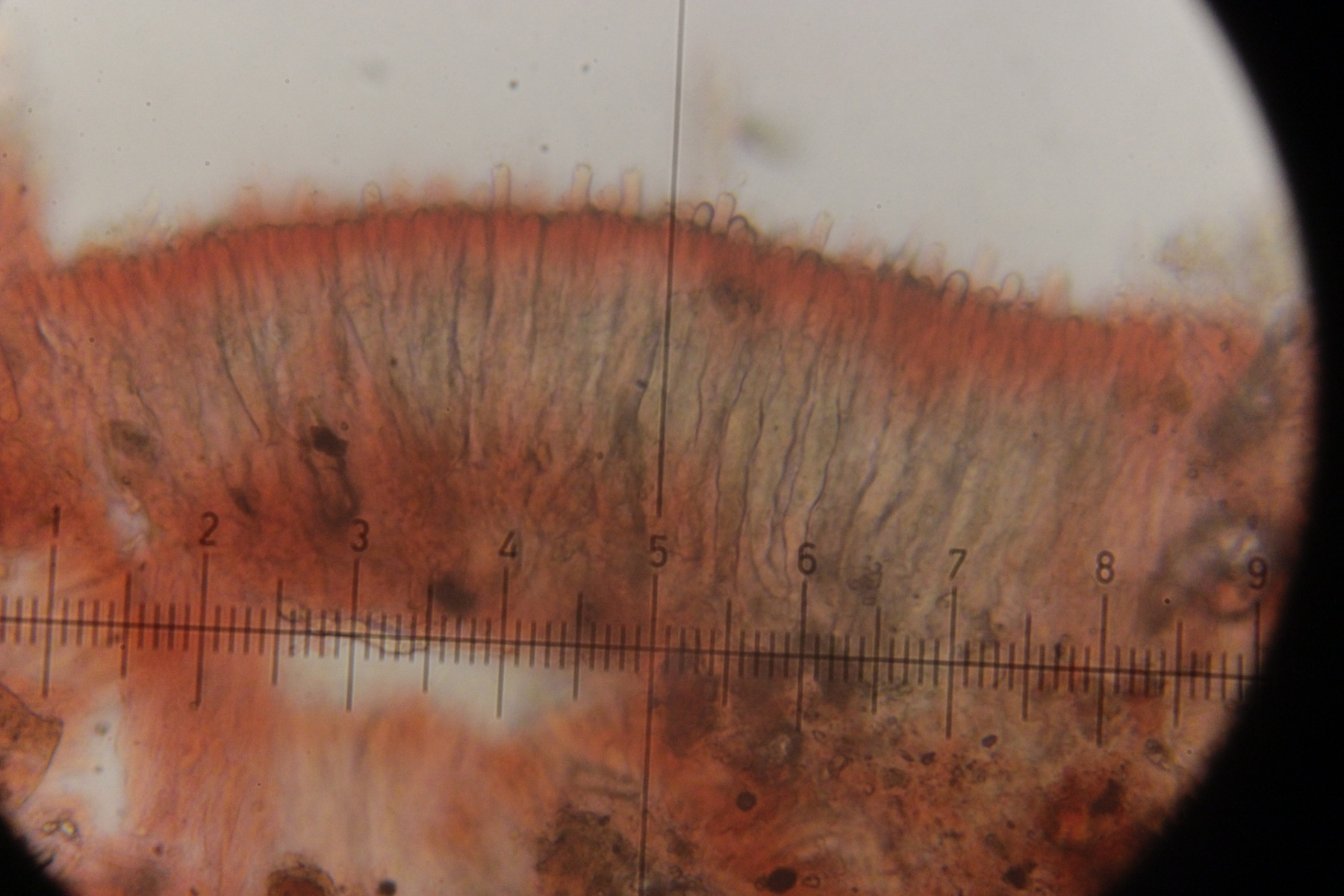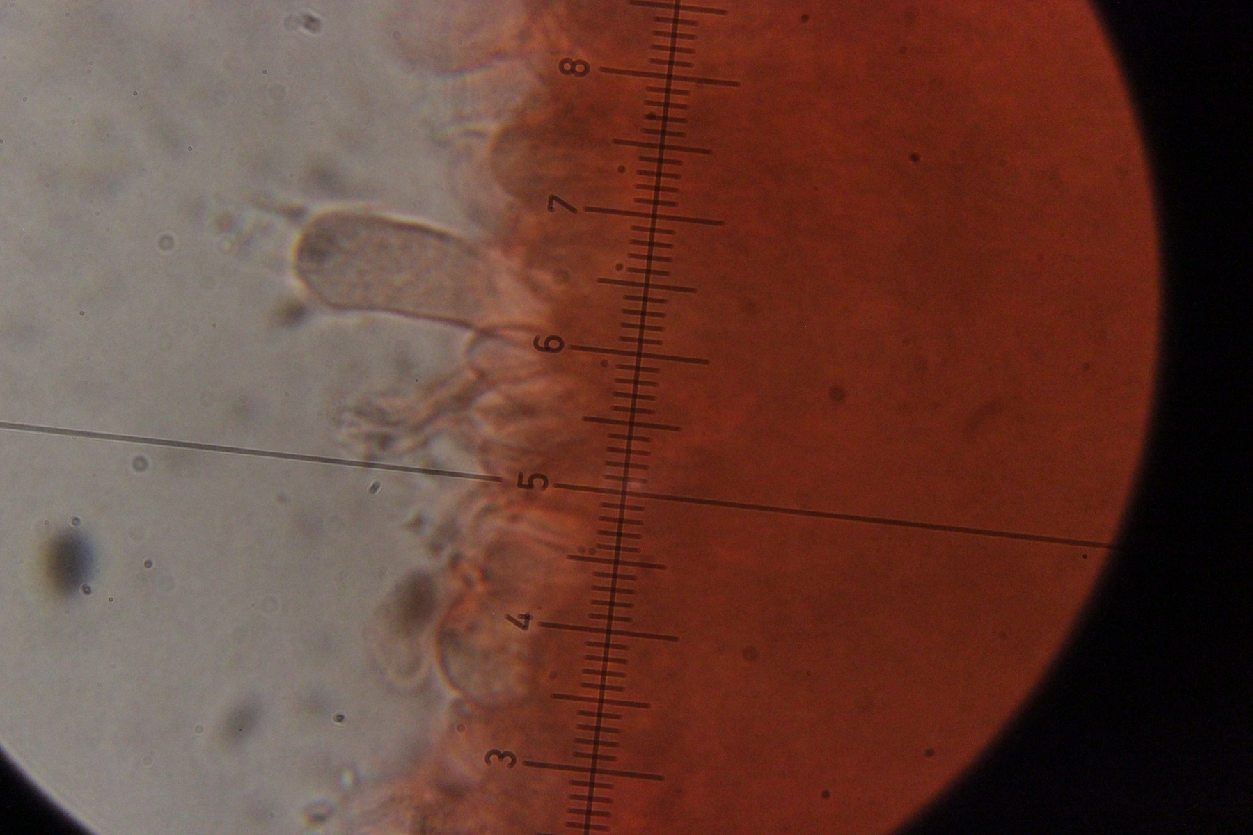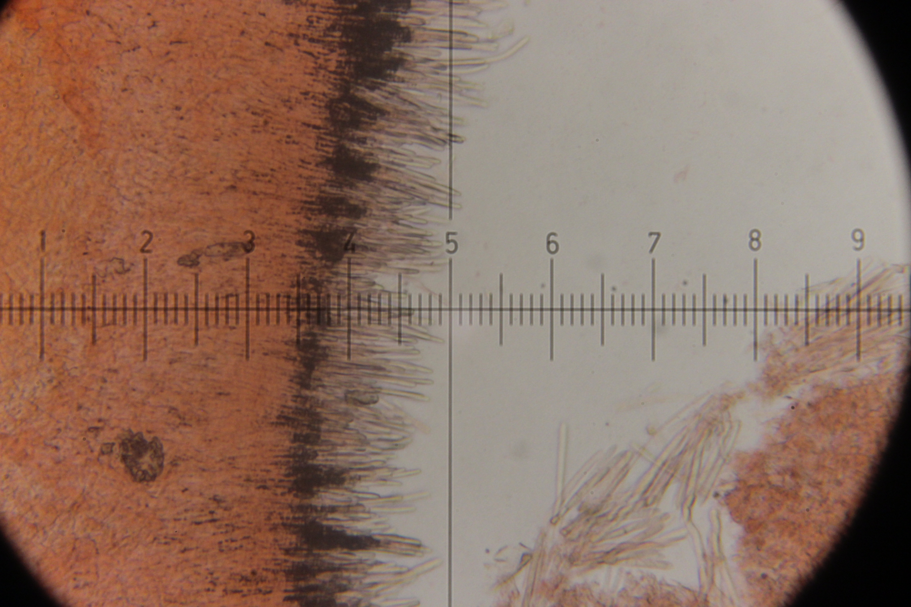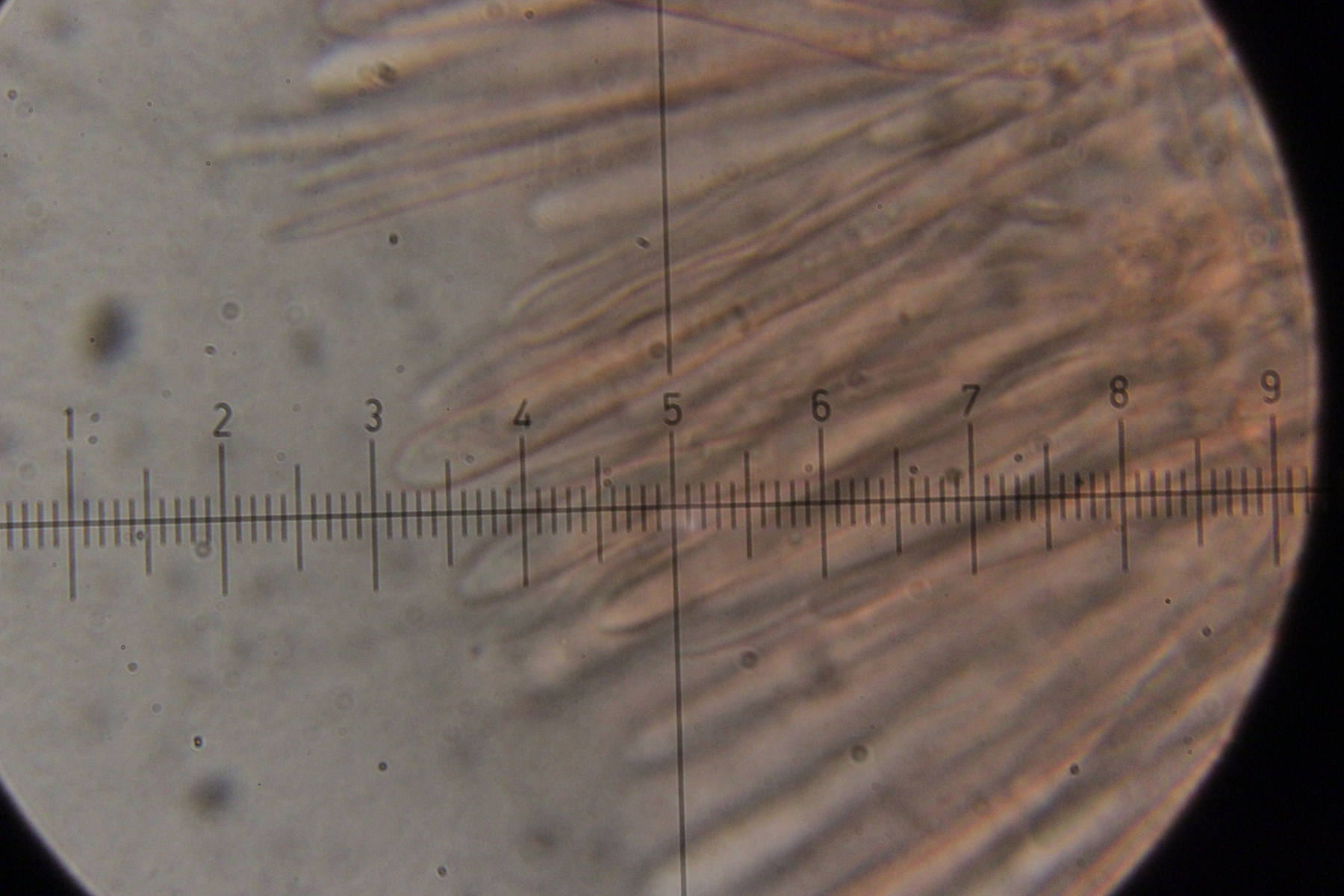 Mikroskopisch zeigen sich dann sehr lange Basidien. Oben an den Basidien werden die Sporen gebildet, allerdings nicht, wie sonst üblich, auf Sterigmen, sondern einfach direkt an den Basidien abspossend. Dabei können dann im Prinzip auch längere Ketten von Sporen gebildet werden. Die konnte ich aber nicht entdecken - aber ich quetsche meine Präparate ja auch immer wie irre.