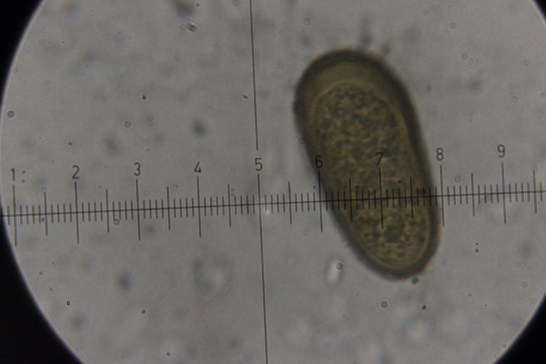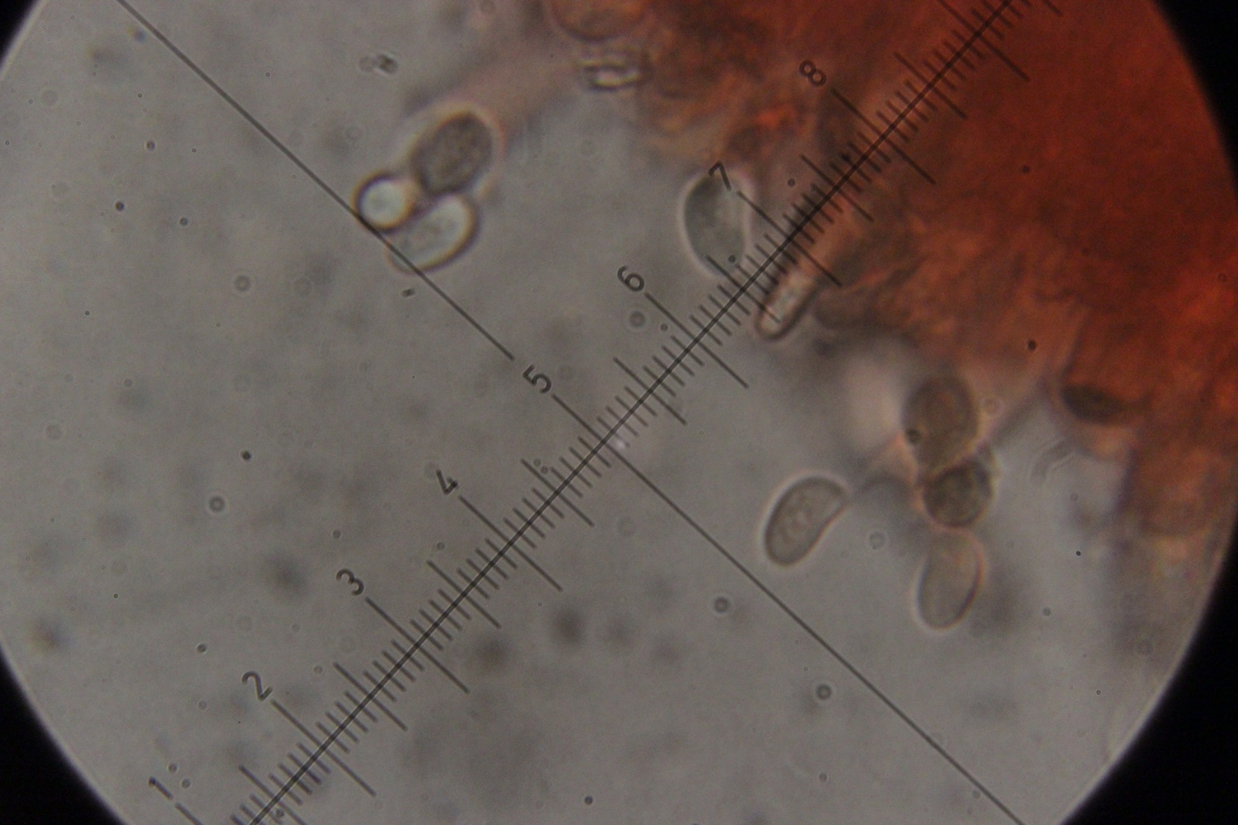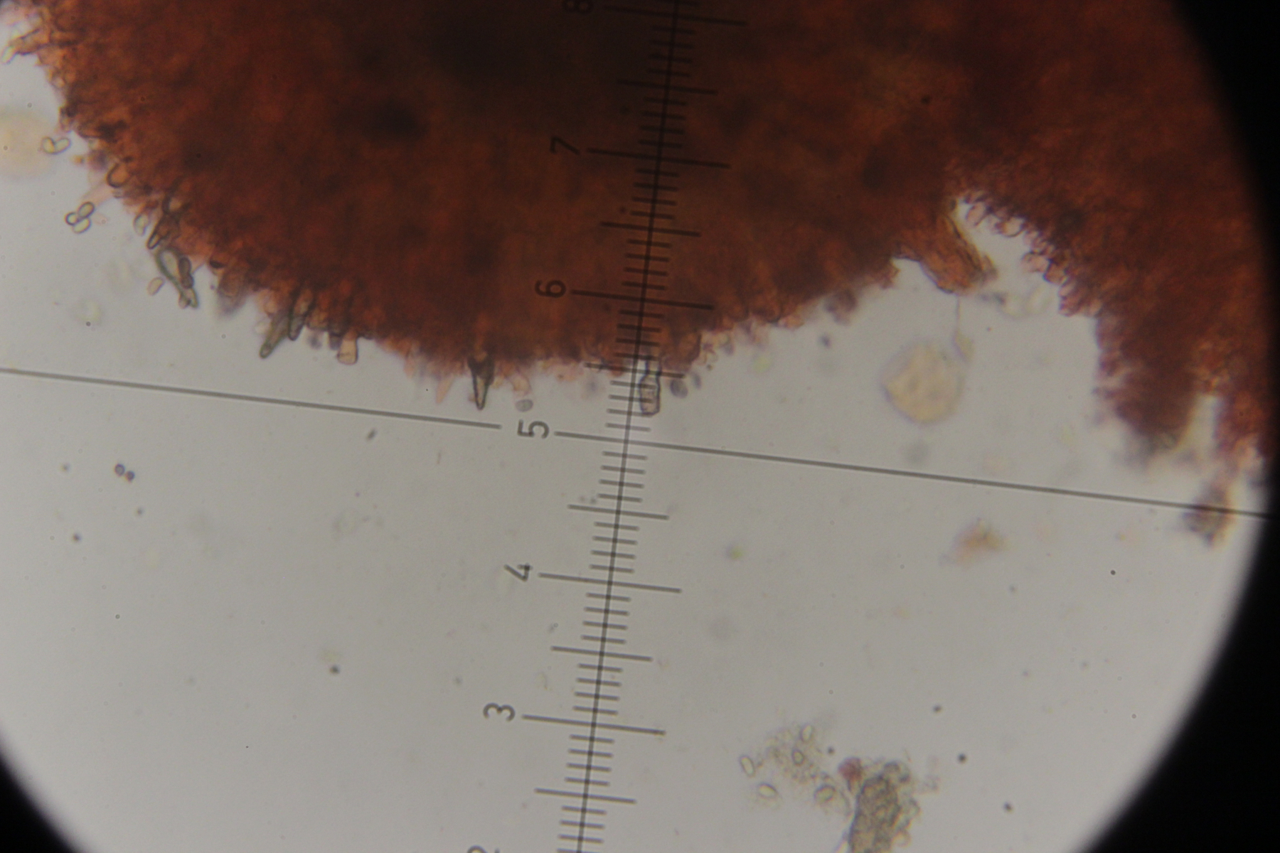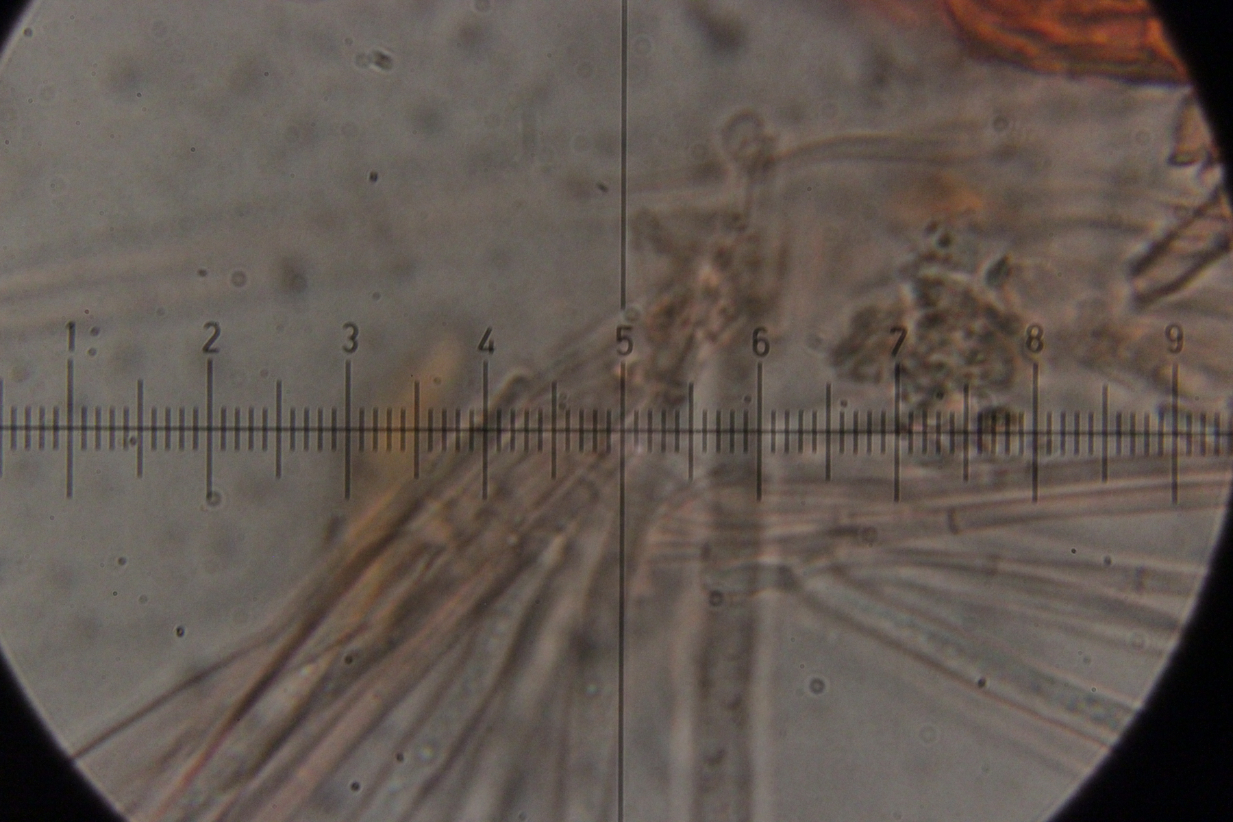 Mikroskopisch zeigen sich dann sehr lange Basidien. Oben an den Basidien werden die Sporen gebildet, allerdings nicht, wie sonst üblich, auf Sterigmen, sondern einfach direkt an den Basidien abspossend. Dabei können dann im Prinzip auch längere Ketten von Sporen gebildet werden. Die konnte ich aber nicht entdecken - aber ich quetsche meine Präparate ja auch immer wie irre.