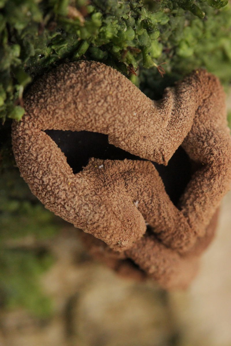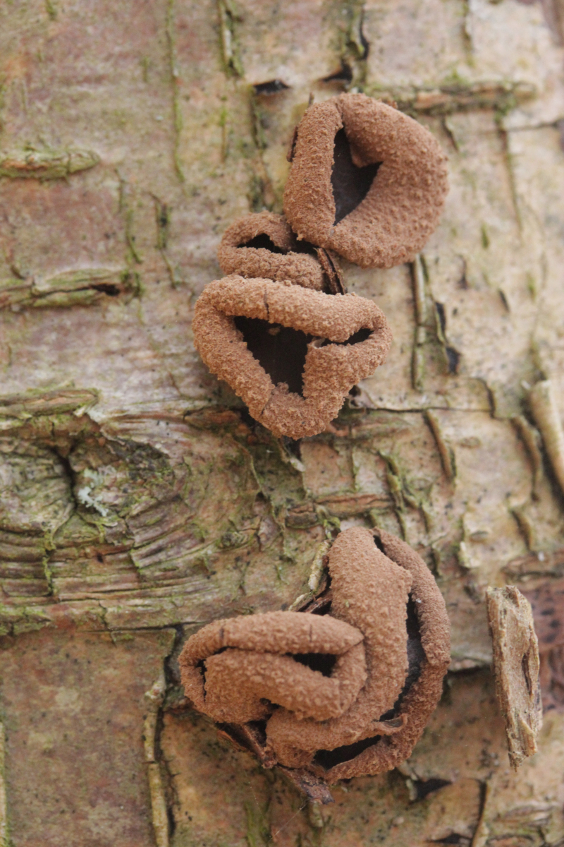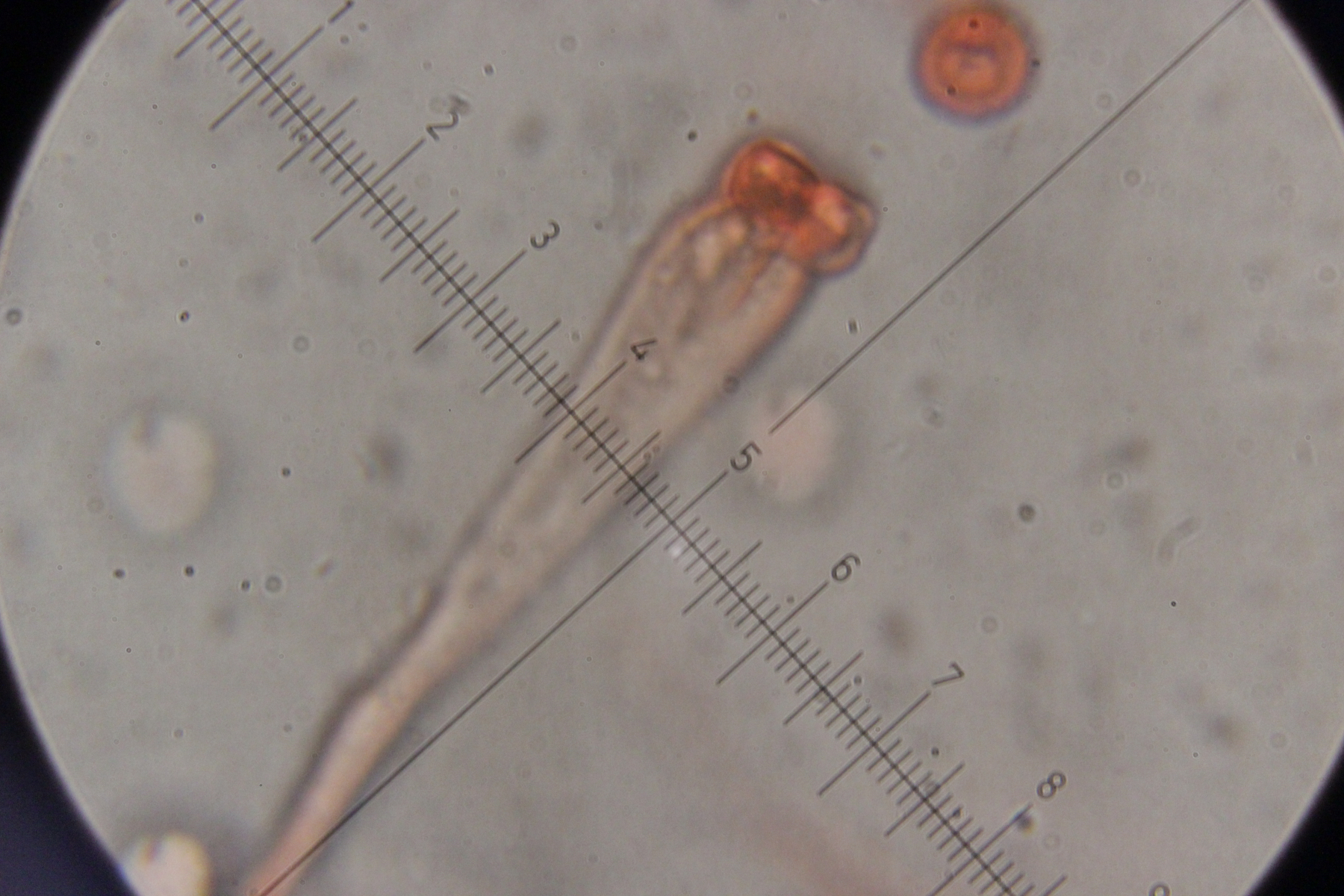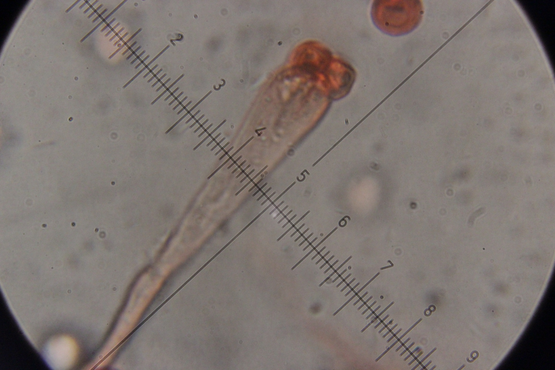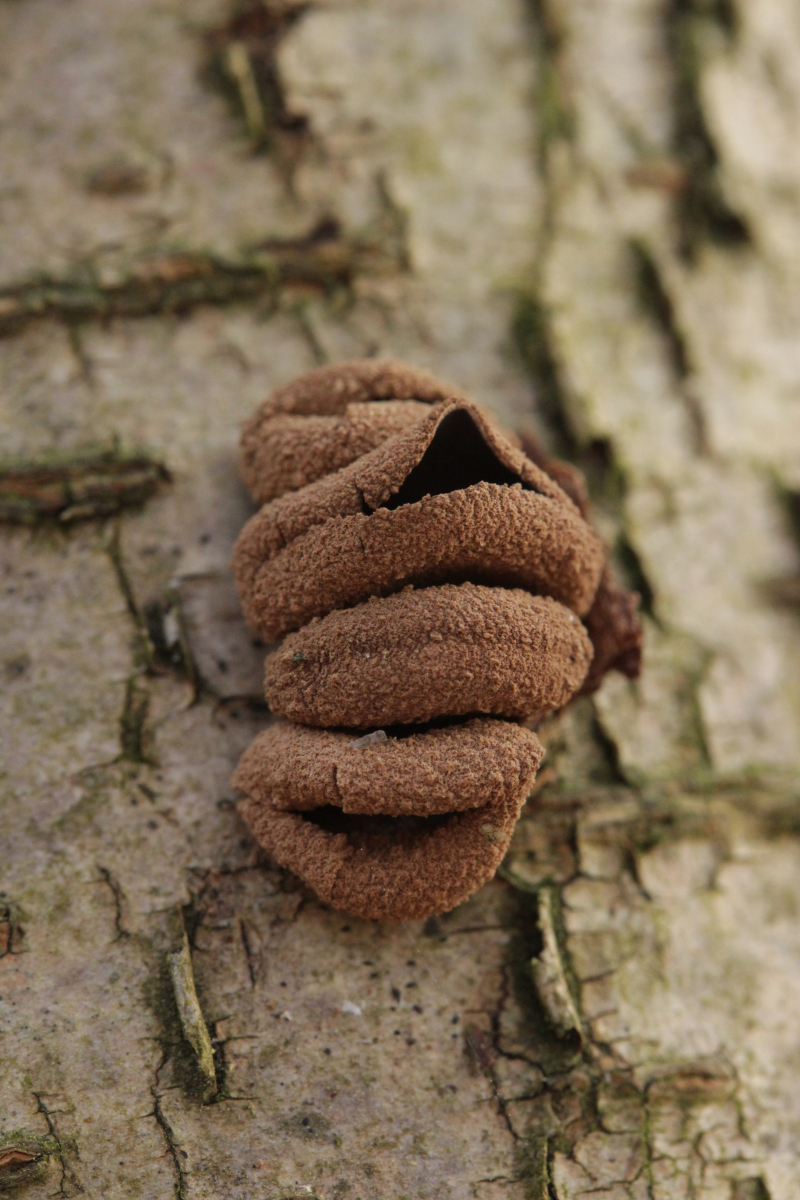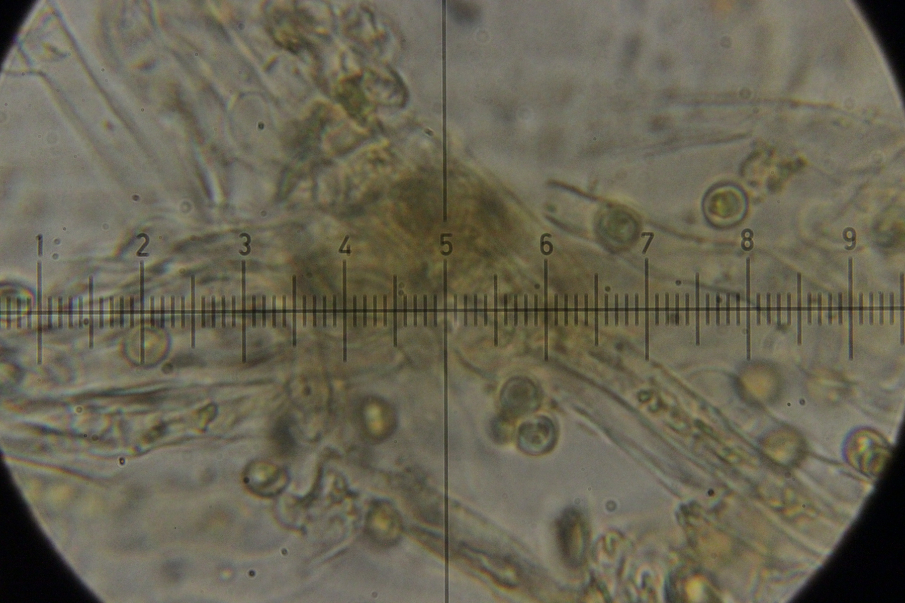 Also habe ich das Präparat noch mal rausgekramt (hat doch auch manchmal sein Gutes, wenn man nicht immer alles sofort aufräumt und sauber macht) und genauer nachgeschaut. Und in der Tat fand sich dieser Pilz, der offenbar auf Granulobasidium vellereum parasitiert und sich sonst an keinem anderen Pilz vergreift. Makroskopisch tritt der Pilz nicht wirklich in Erscheinung und verursacht allenfalls eine leichte Verfärbung seines Wirtes.