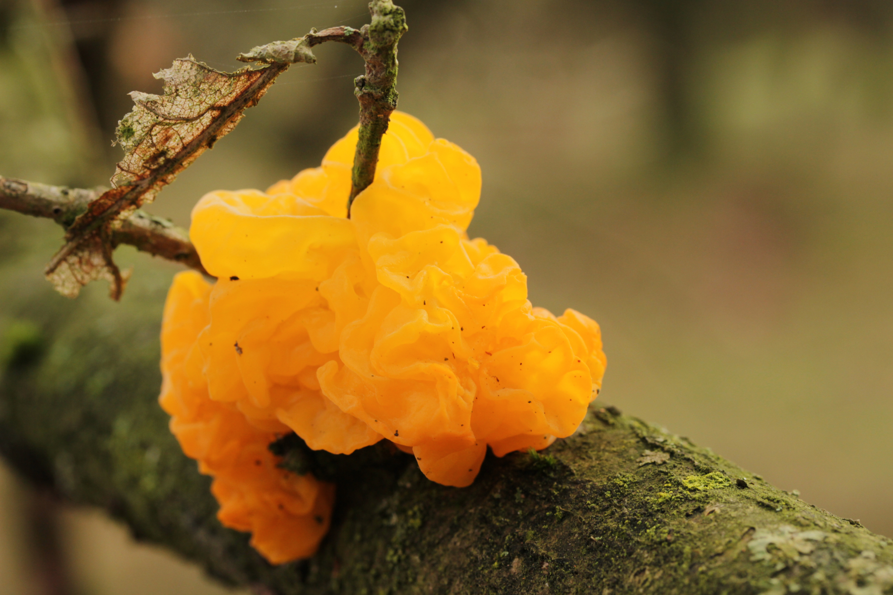 7. Tremella mesenterica. Schichtpilze als Futter waren weit und breit nicht zu sehen, aber Peniophora quercina war an den Ästen jeweils vorhandens, so daß ich T. aurantia ausschließen möchte.