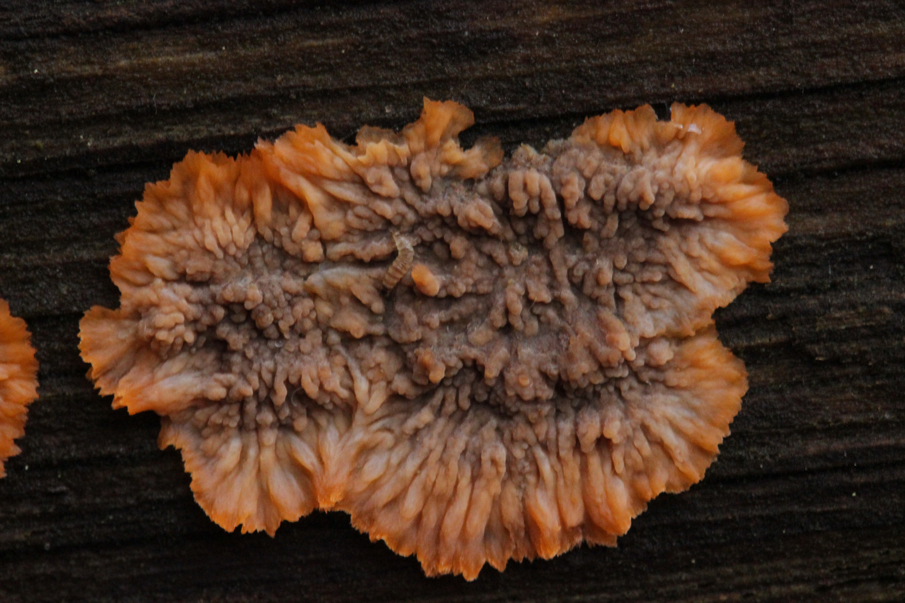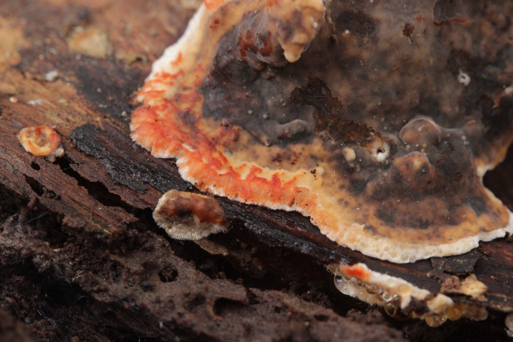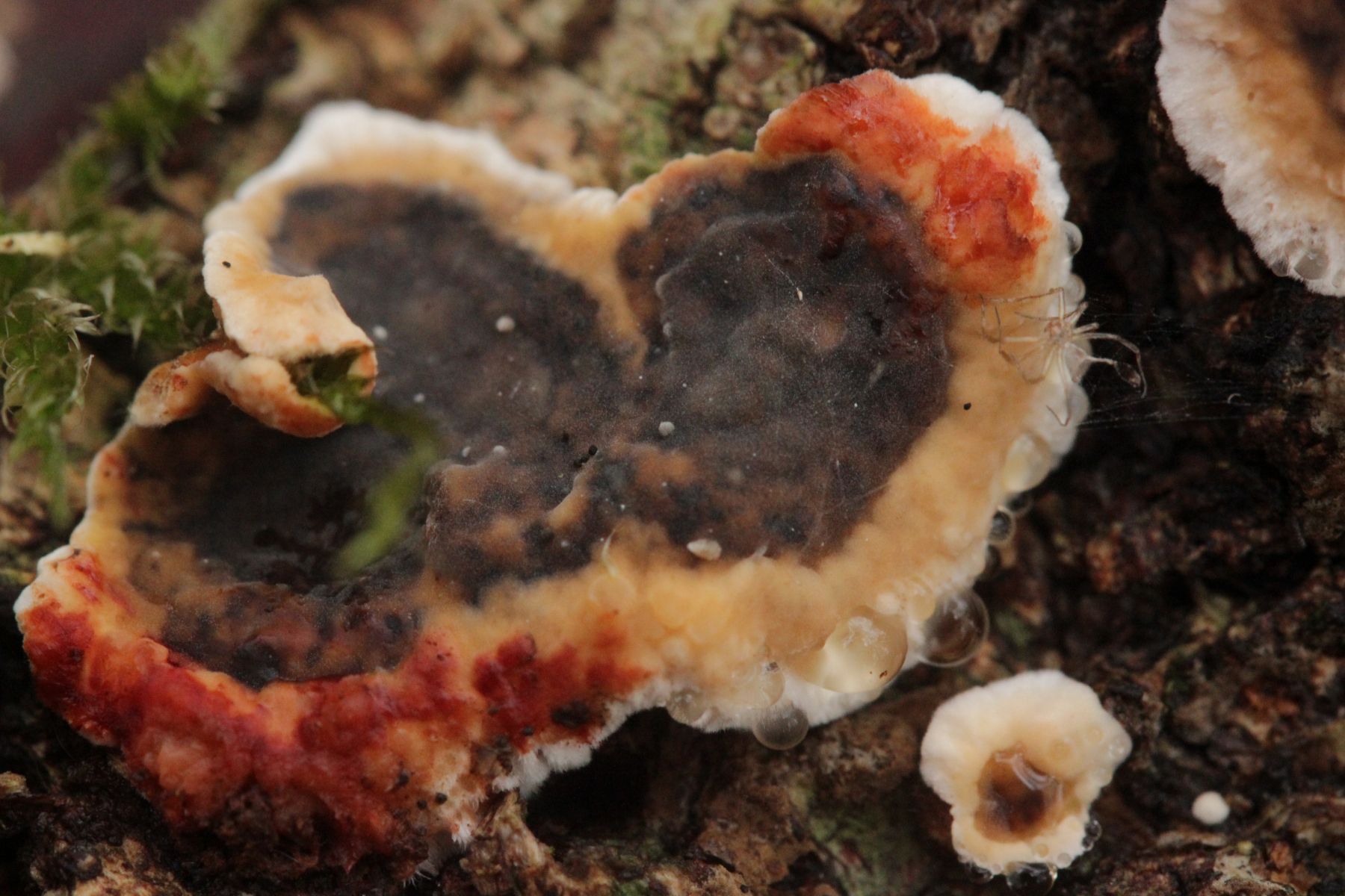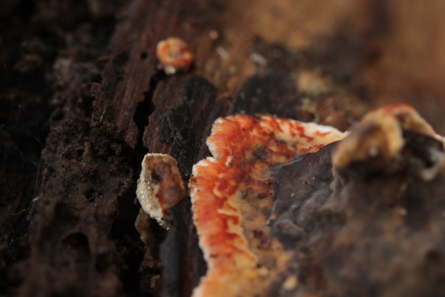 4. Hier würde ich auf Hygrocybe conica tippen, da der Fruchtkörper kurze Zeit nach dem Rüpfen ziemlich deutlich dunkel verfärbte.