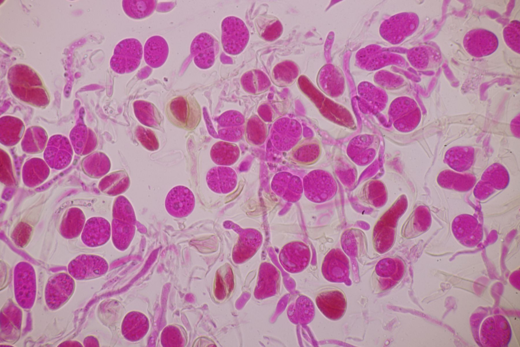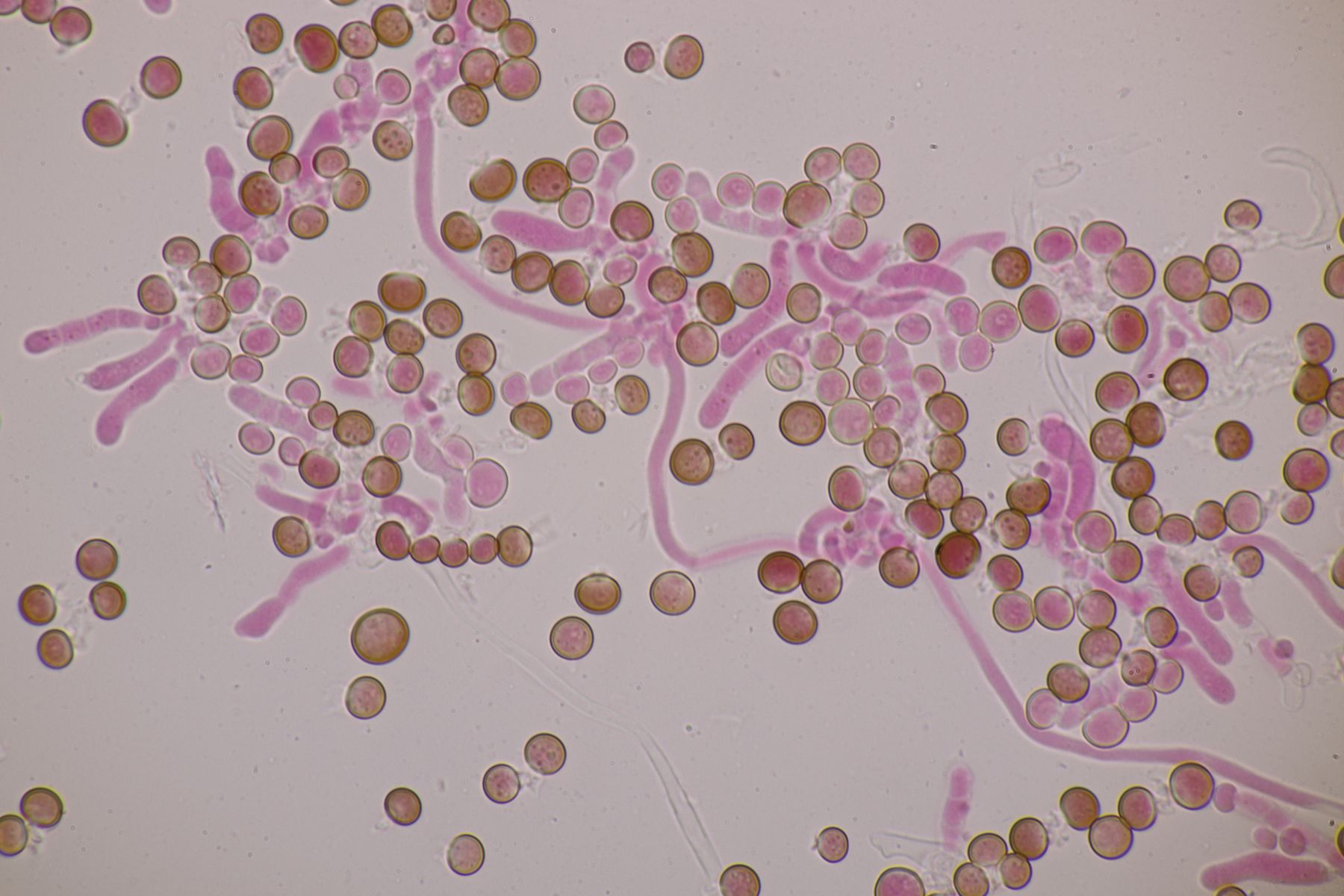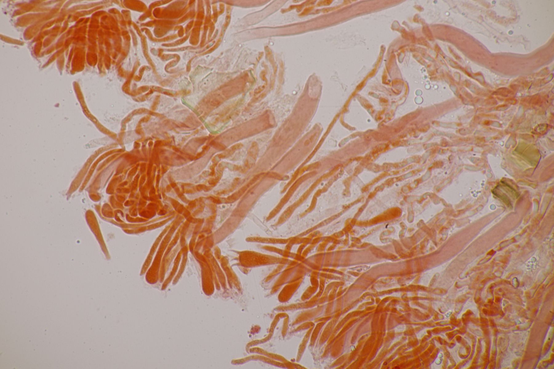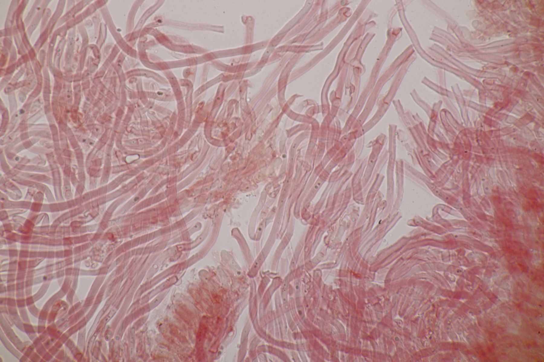 ja Phloxin ist schon ein tolles Zeug. Gerade bei zäheren Angelegenheiten wie Rindenpilzen funktioniert das besser als Kongorot, weil es das Zellplasma und nicht die Zellwand anfärbt, d.h. die Zellwände bleiben dann durchsichtig und man kriegt eine bessere Vorstellung von der Struktur der verklebten Hyphen. Einziger Nachteil ist, daß Phloxin mit KOH ausflockt. Man färbt also erst mit Phloxin ein, wäscht dann gründlich mit Wasser aus und kann dann in KOH mikroskopieren.