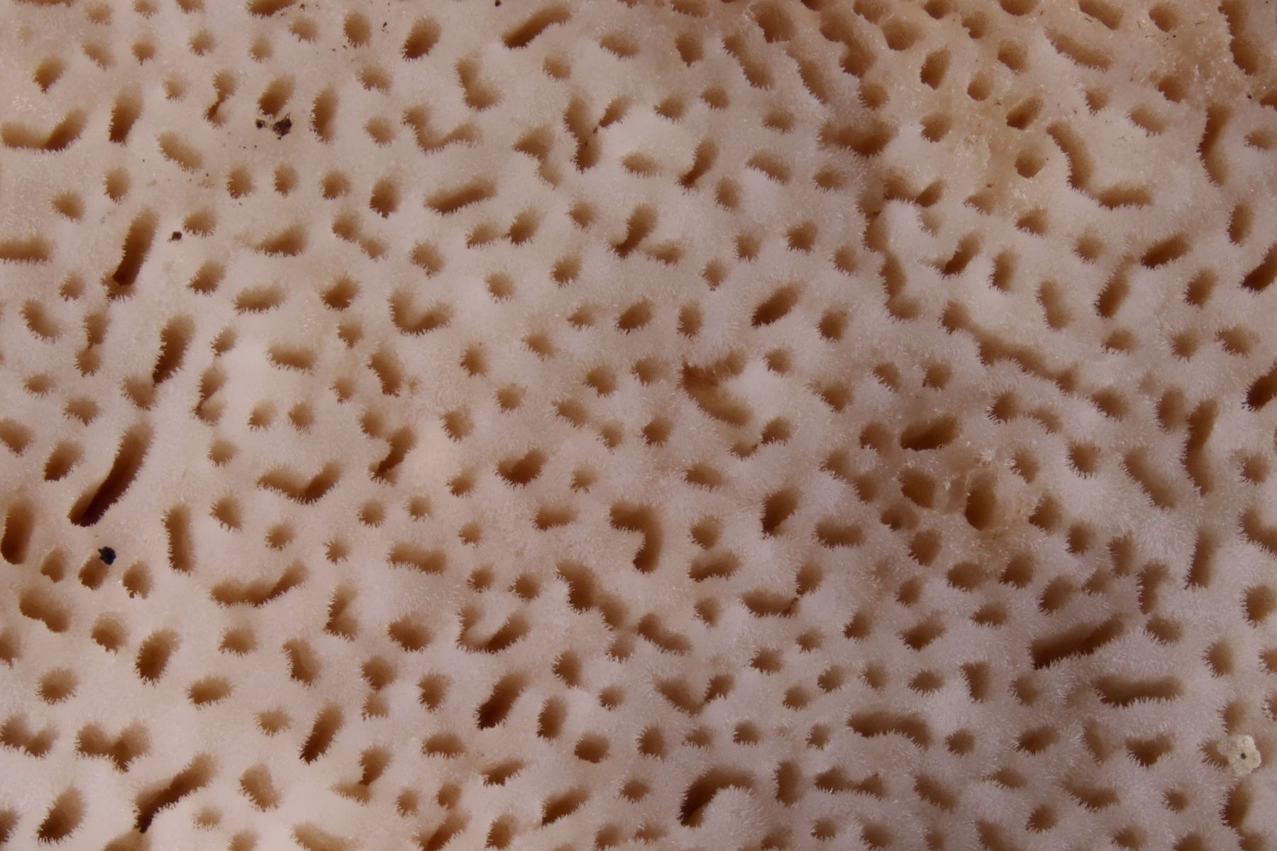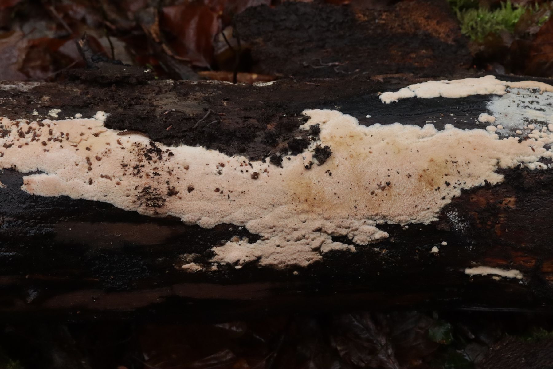 die Ratlosigkeit ist behoben! Ich hatte den Pilz gerade auch bei Facebook eingestellt und dort kam dann der Hinweis auf Phlebia subcretacea. Das paßt in allen Details ziemlich gut zu meinem Fund und erklärt auch, warum ich beim Schlüsseln nicht ans Ziel gekommen bin, denn wachsartig-zäh wie man das sonst von Phlebias kennt, ist P. subcretacea nun wirklich nicht (wobei sie sich schon wachsartig glatt von der Oberfläche her gibt).
