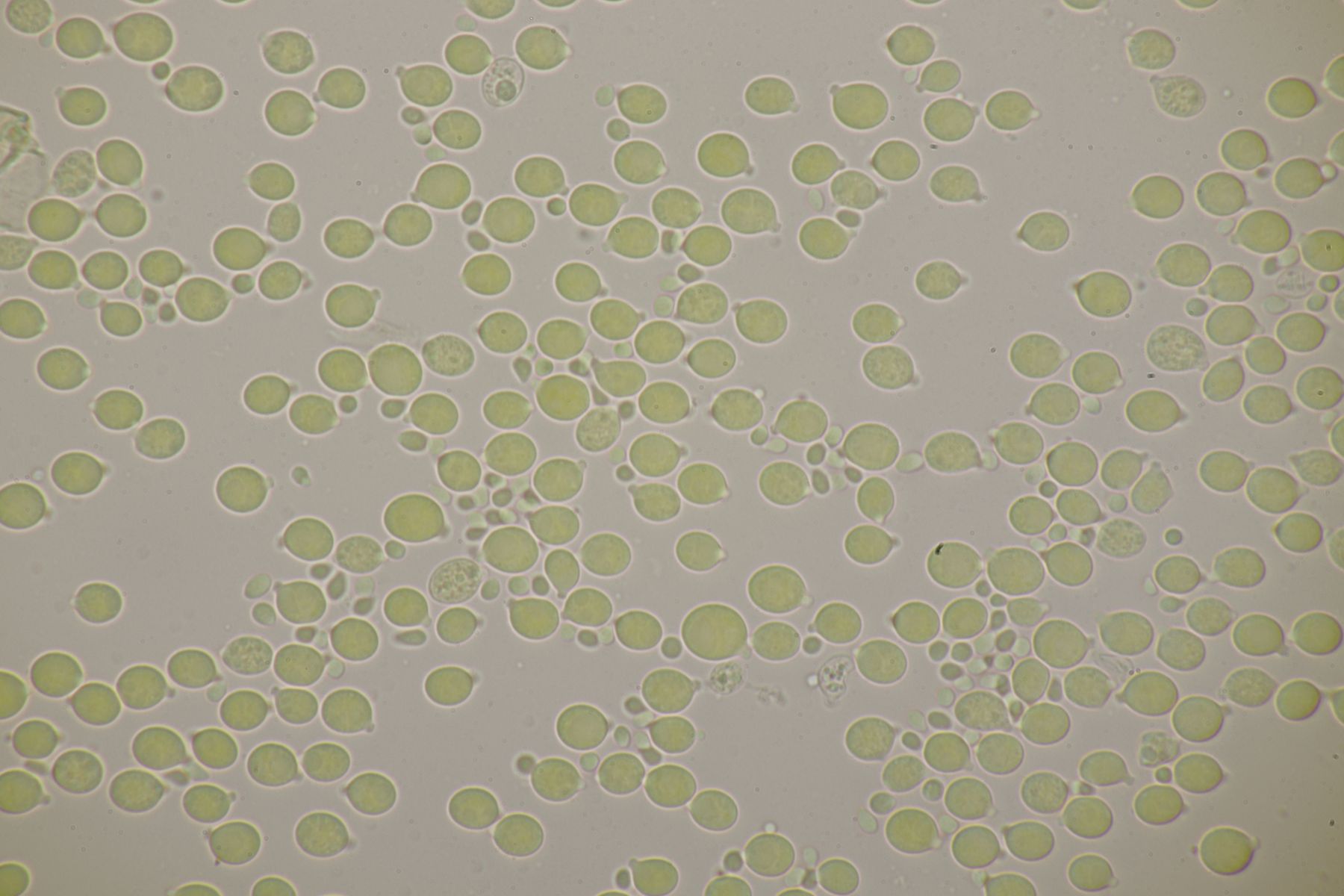 2. Ein Porling mit Sporen von 4,3±0,2 µm × 2,1±0,1 µm, Q=2±0,1; 4-4,6 µm × 2-2,3 µm, Q=1,8-2,2. Schnallen sind vorhanden, Zystiden konnte ich keine beobachten. Substrat war Fagus sylvatica. Damit lande ich dann bei Ceriporiopsis gilvescens.