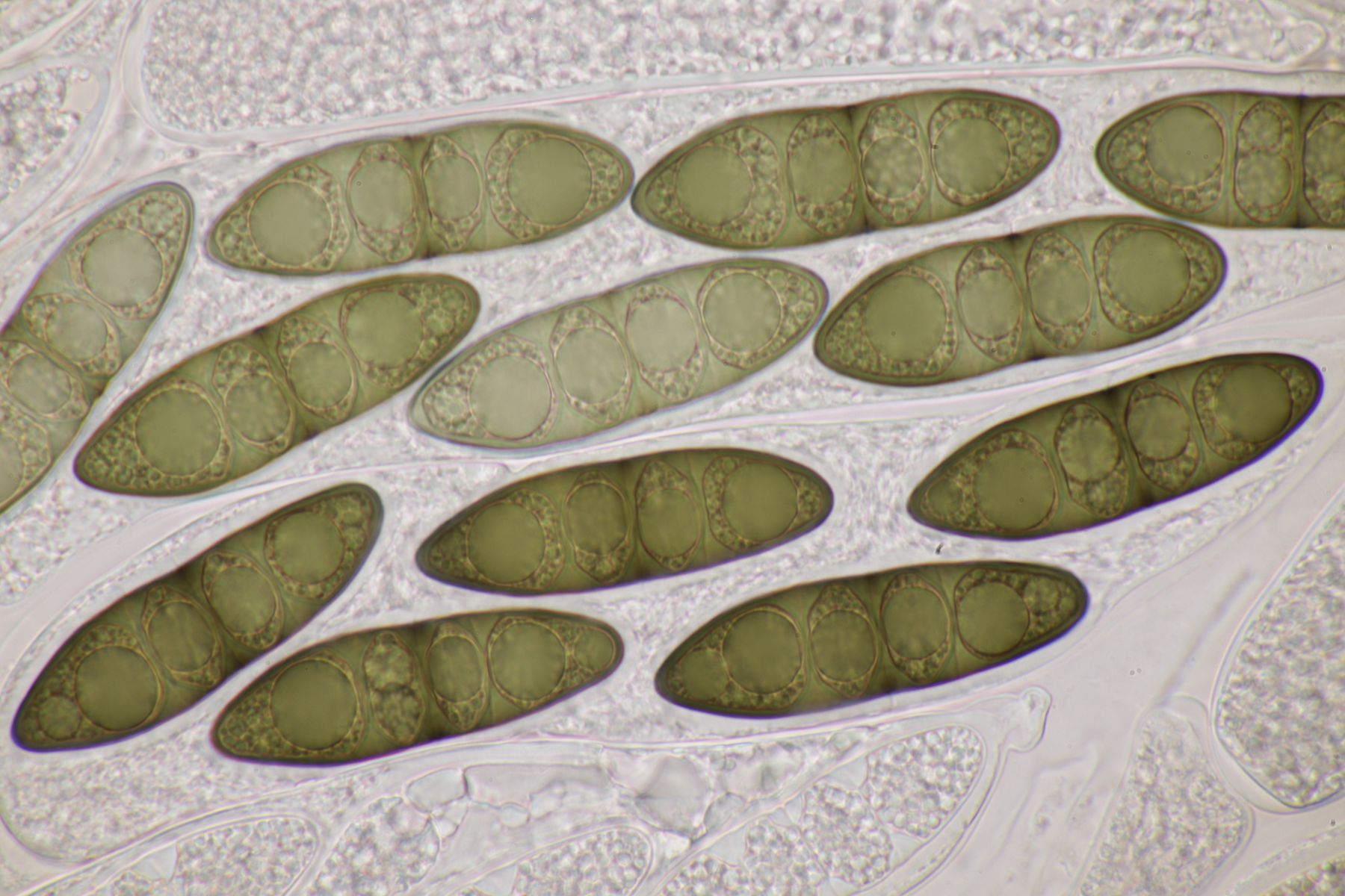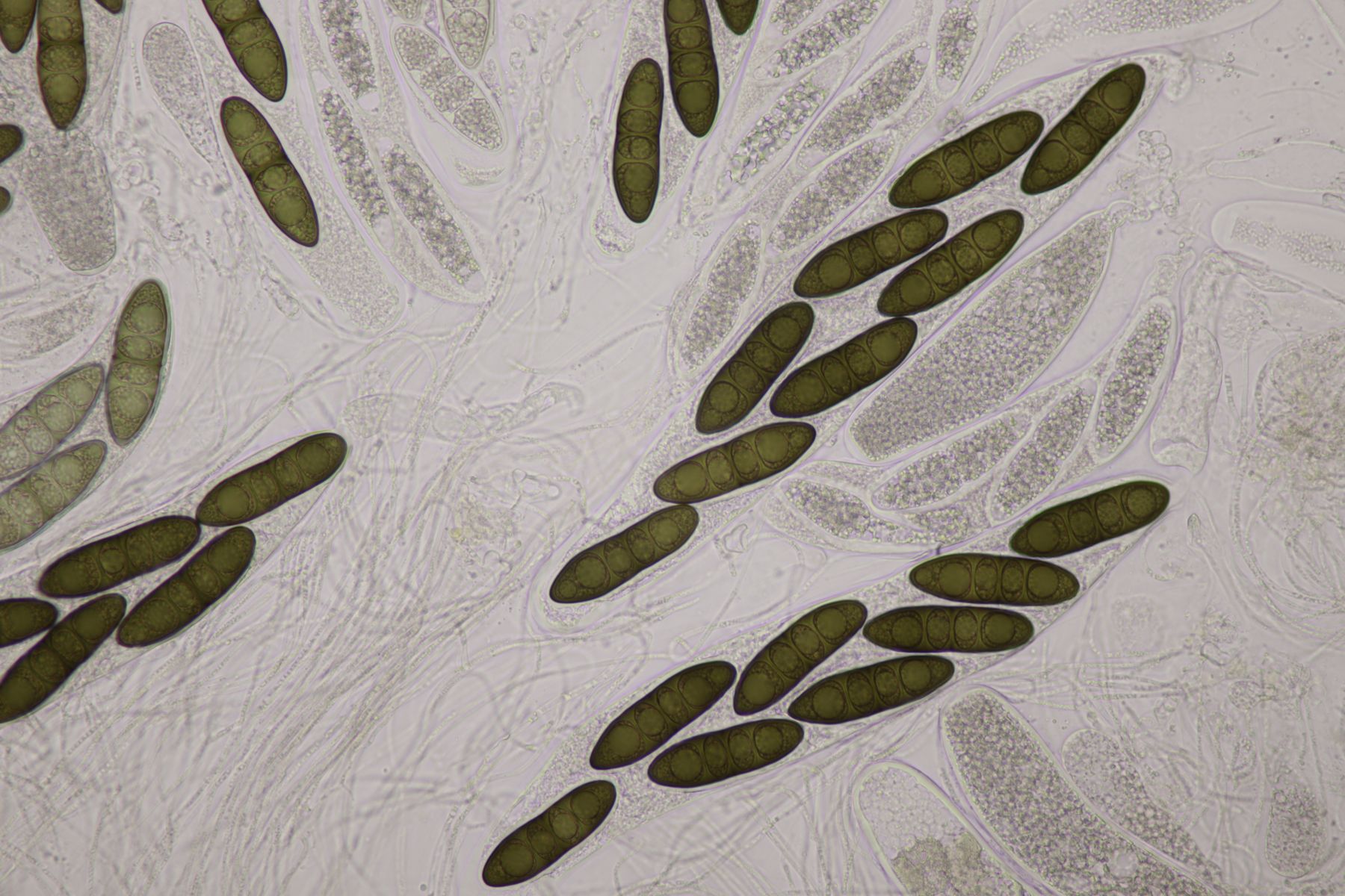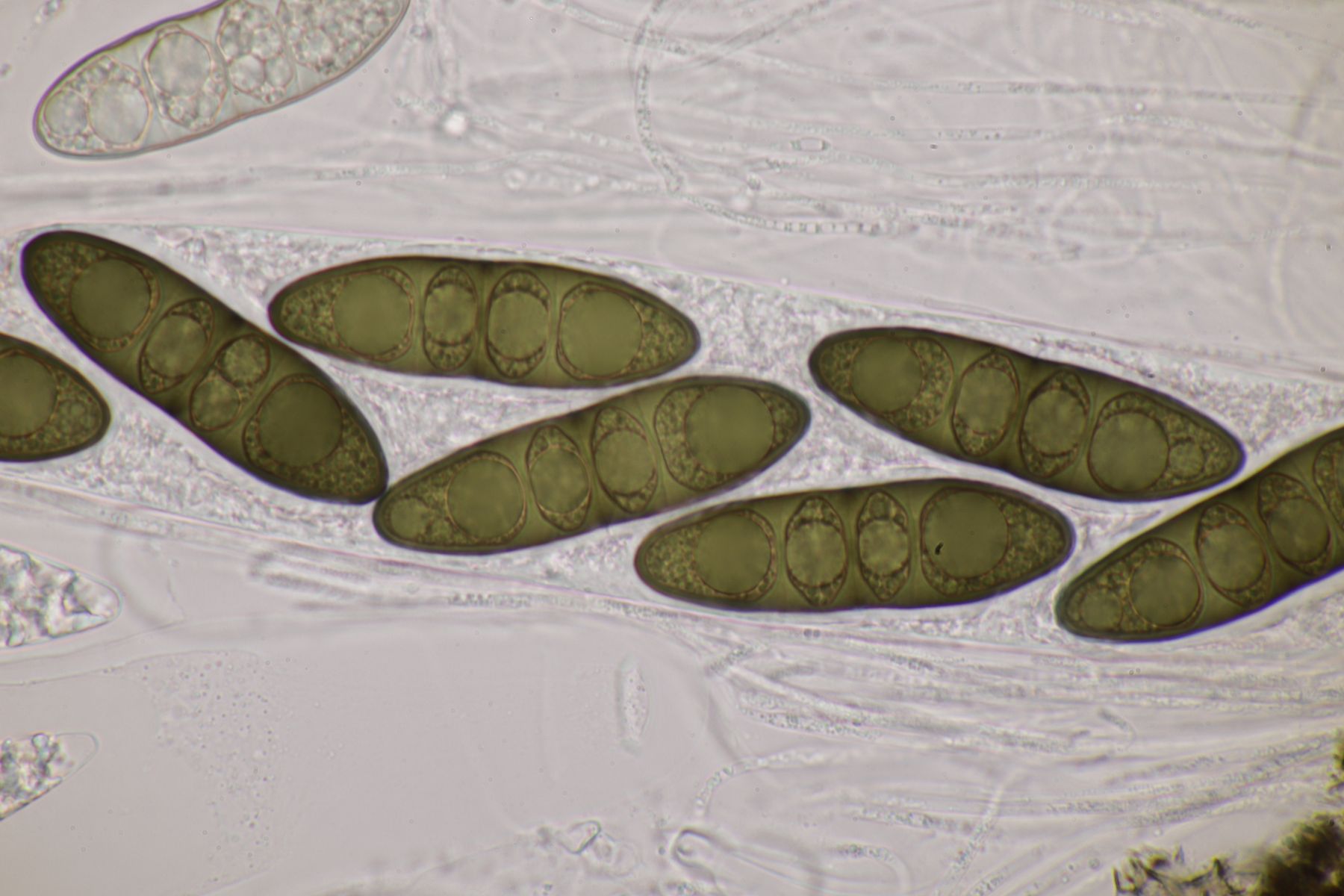 1. Hier bin ich komplett ratlos. Ein Fund auf Pinus sylvestris. Schnallen sind vorhanden, Sporen messen 6,6±0,5 µm × 1,9±0,1 µm, Q=3,5±0,2, 6,1-8,1 µm × 1,7-2,1 µm, Q=3-4,1, sind weder amyloid noch dextrinoid. Zystiden sind scheinbar nicht vorhanden. Auffällig sind die sehr knorzeligen Hyphen. Wenn ich mit diesen Parametern bei Bernicchia oder Larsson schlüssele, komme ich aber irgendwie in keine Gattung.