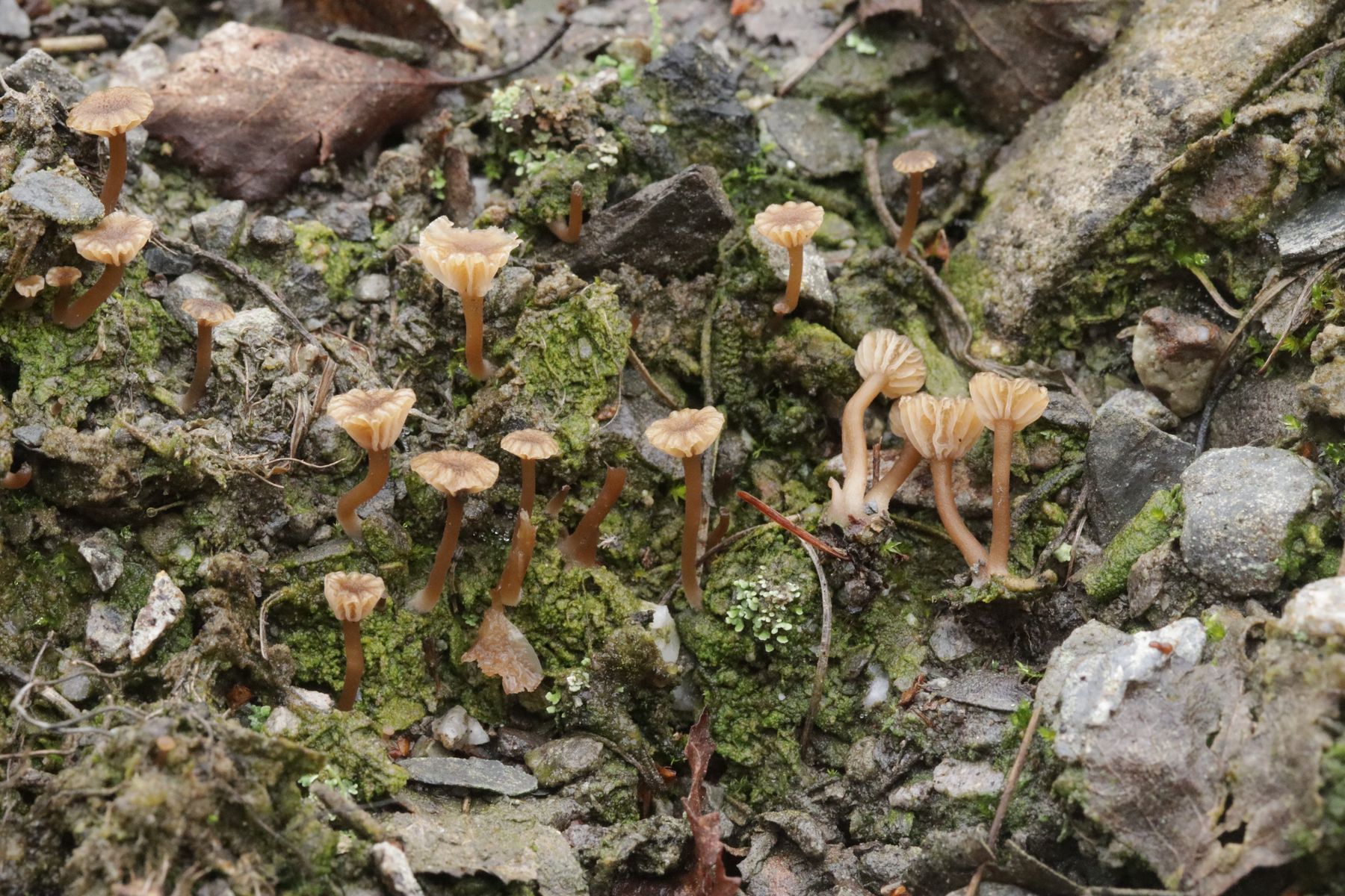 1. Der landete (wie jeden Herbst) als Arrhenia rustica auf der Fundliste, aber mittlerweile habe ich da meine Zweifel, denn die Sporen von 7.5+-0.5 µm x 3.6+-0.3 µm, Q=2.1+-0.1, 6.7-8.5 µm x 3.2-4.1 µm, Q=1.9-2.4 passen nicht zu der Art und A. rustica scheint auch makroskopisch anders zu sein. Leider hatte ich mir die anderen Mikromerkmale nicht angeschaut und beim Schlüsseln mit Gröger und Funga Nordica findet sich auch nichts Passendes.