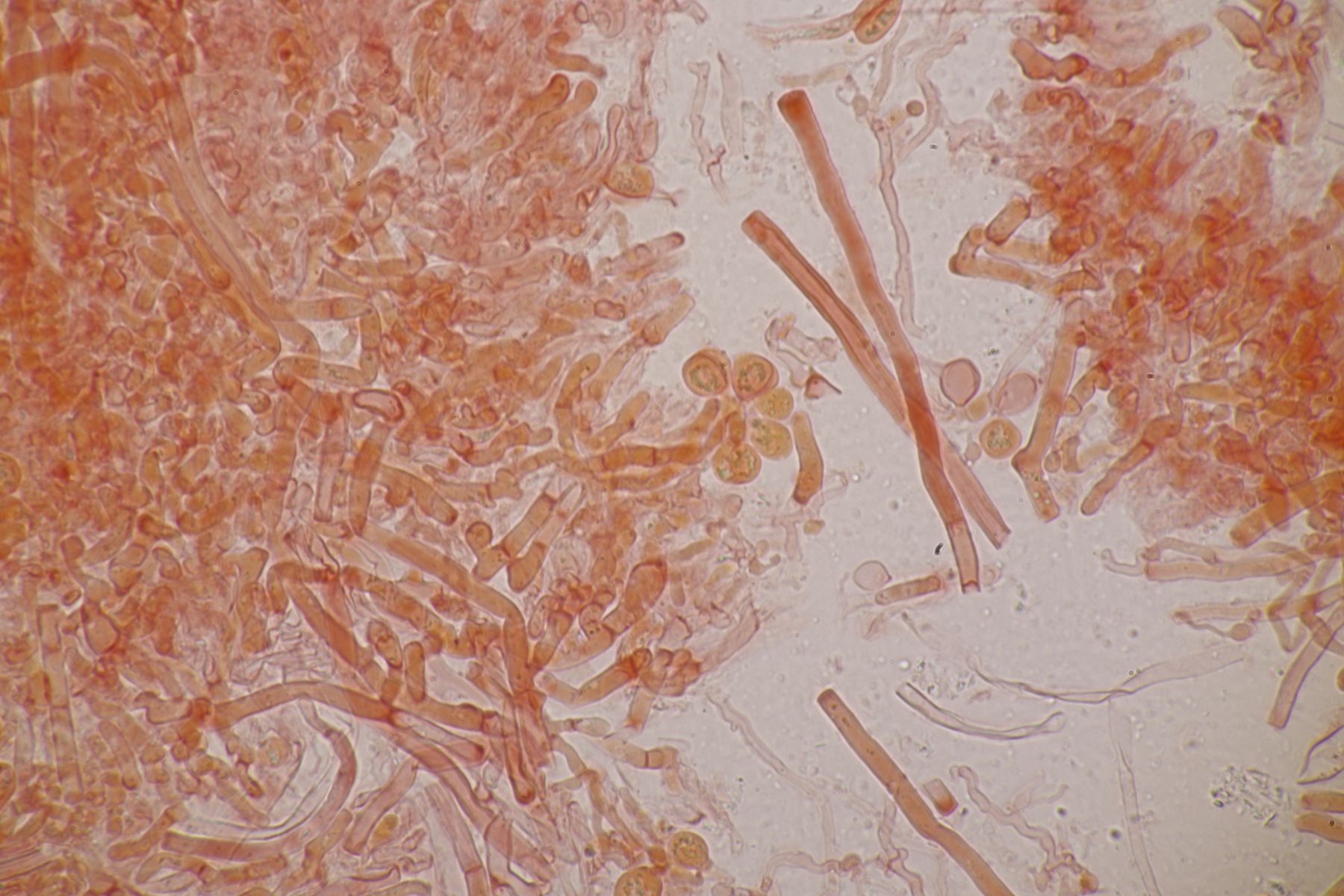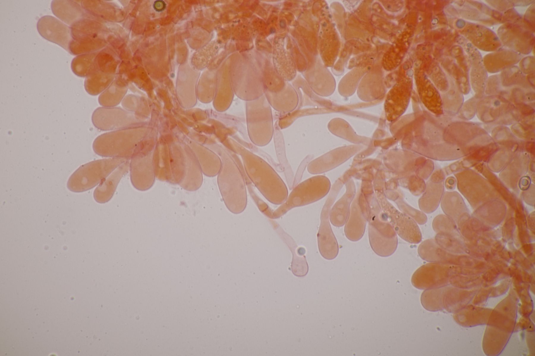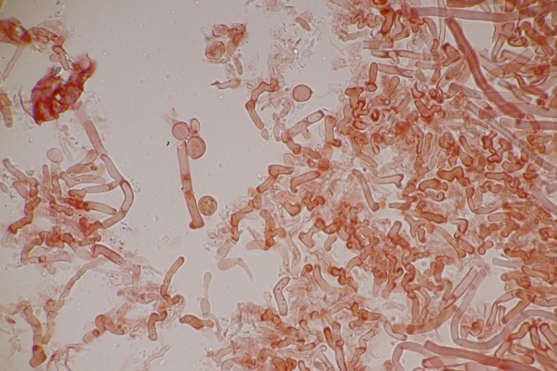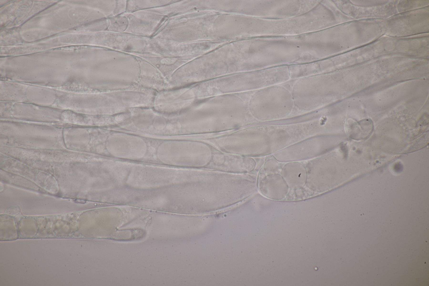 4. Botryobasidium aureum. Im Feld hatte ich wegen des üppigen Wachstums auf etwas anderes gehofft, aber das Mikro war dann eindeutig.