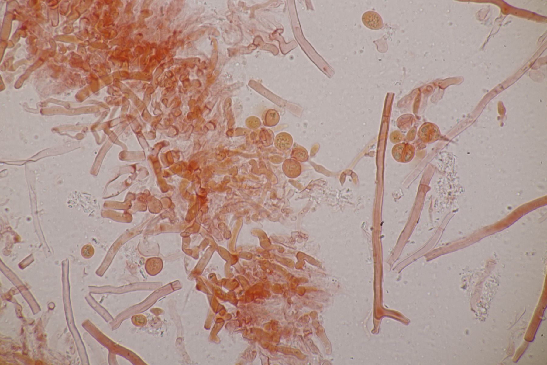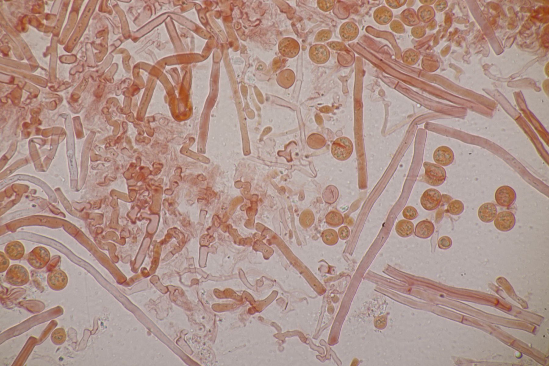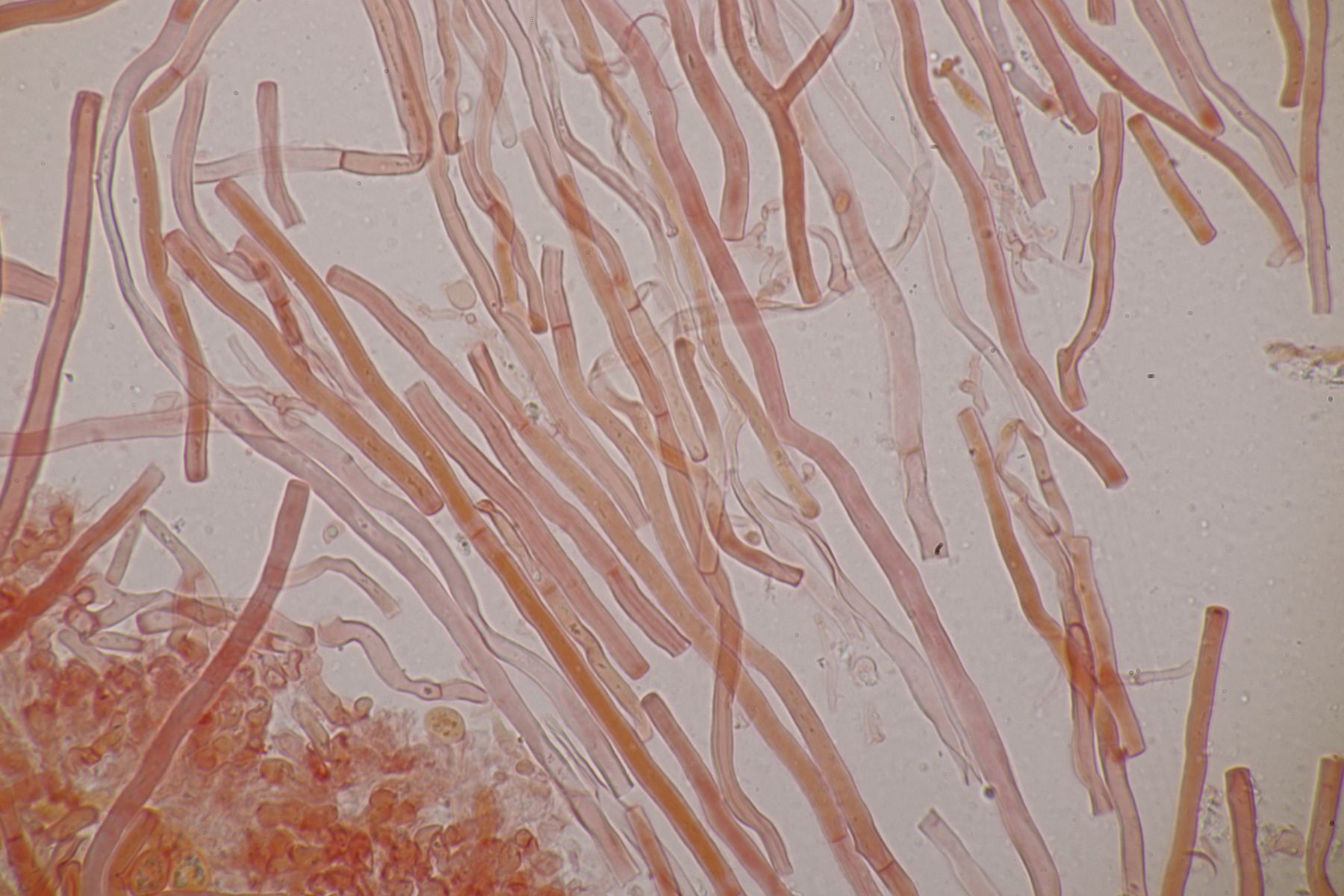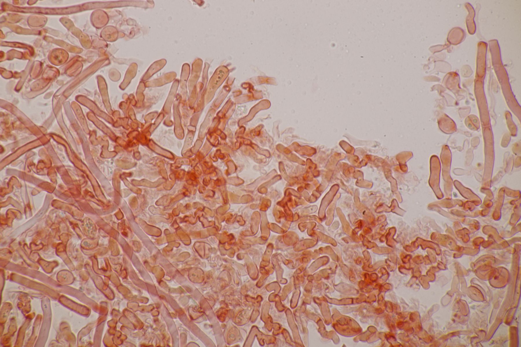 4. Botryobasidium aureum. Im Feld hatte ich wegen des üppigen Wachstums auf etwas anderes gehofft, aber das Mikro war dann eindeutig.