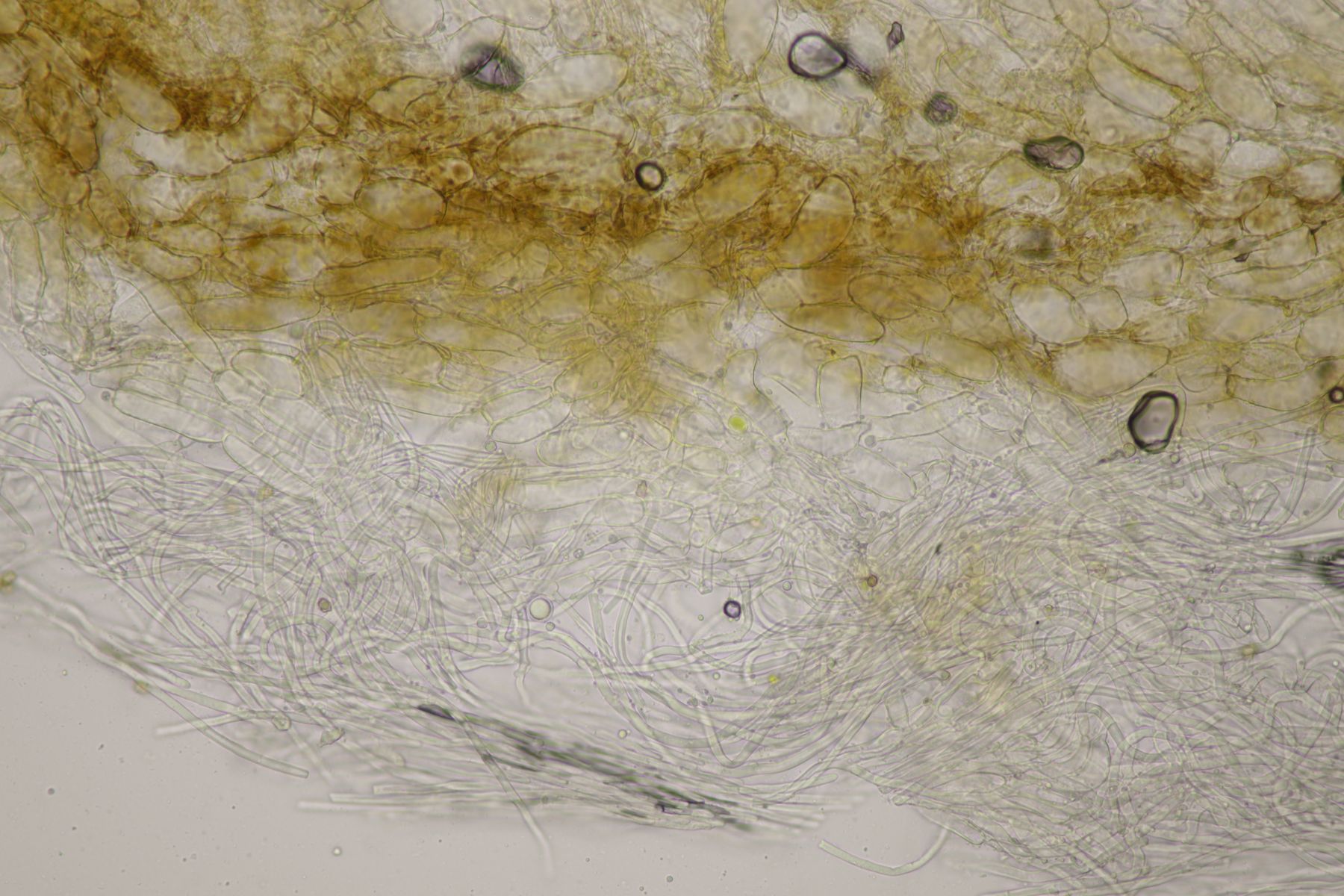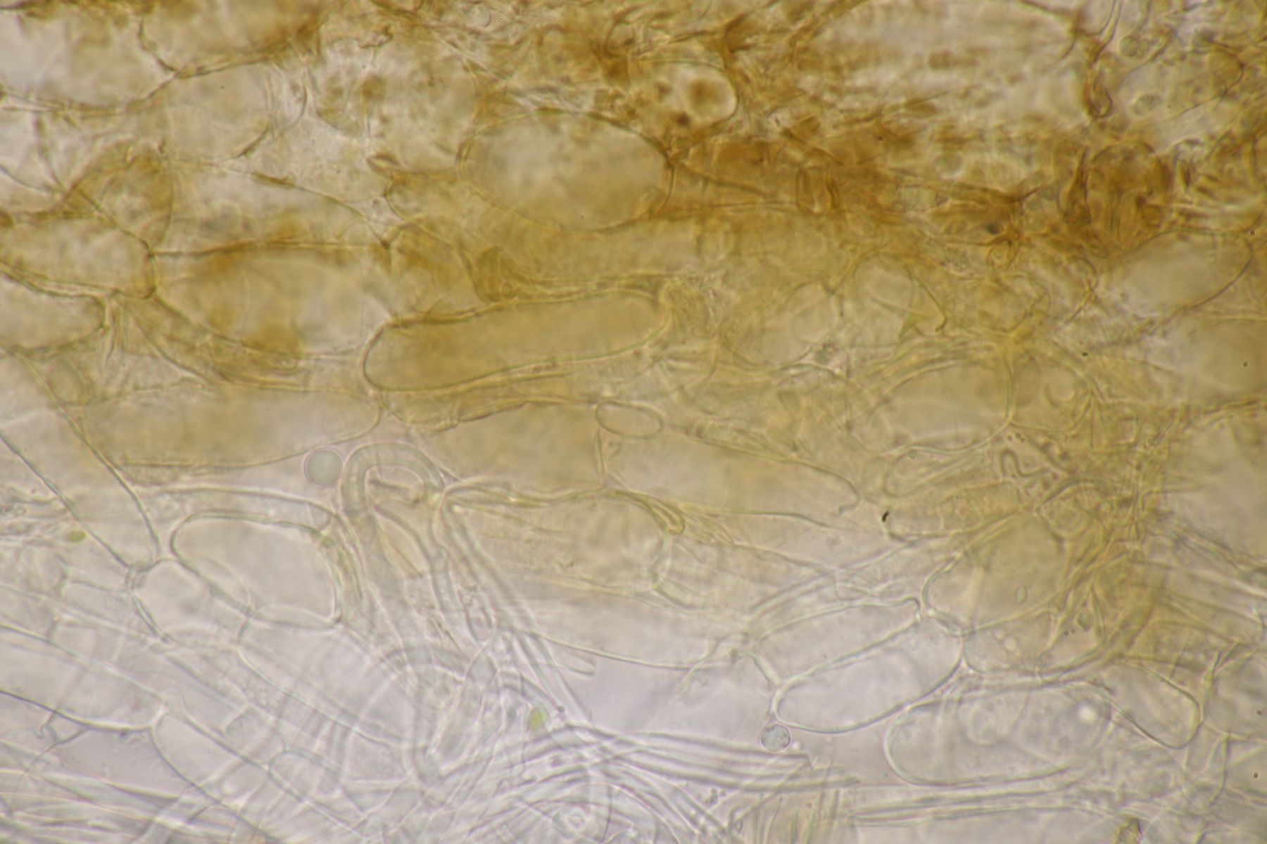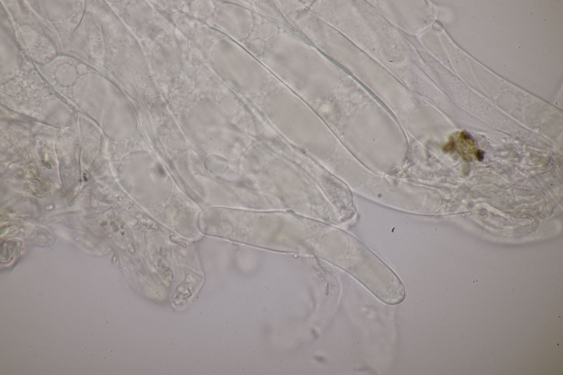 2. Ein Saftling mit glitschigem Hut, wie das Mikroskop auch deutlich zeigt. Sporenmaße 9.0+-0.6 µm x 5.2+-0.5 µm, Q=1.7+-0.1, 8.2-10.5 µm x 4.4-6.1 µm, Q=1.5-1.9, Lamellen aufsteigend angewachsen, Lamellentrama aus langen Zellen. Damit bleibt eigentlich nur Hygrocybe acutoconica, aber dafür wirkten die beiden Fruchtkörper irgendwie zu klein und außerdem sind die Sporen auch nicht groß genug. Hat da jemand eine bessere Idee?