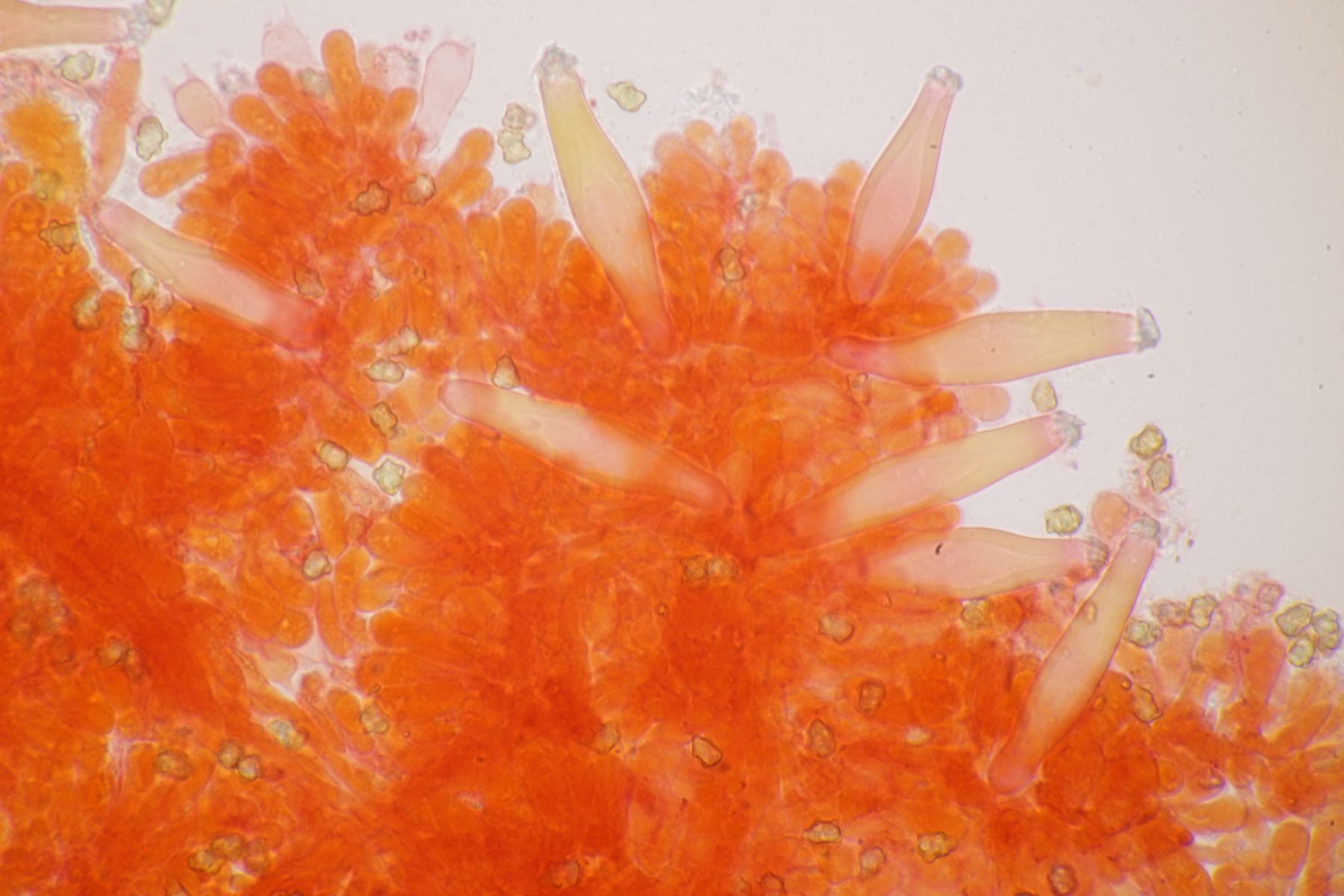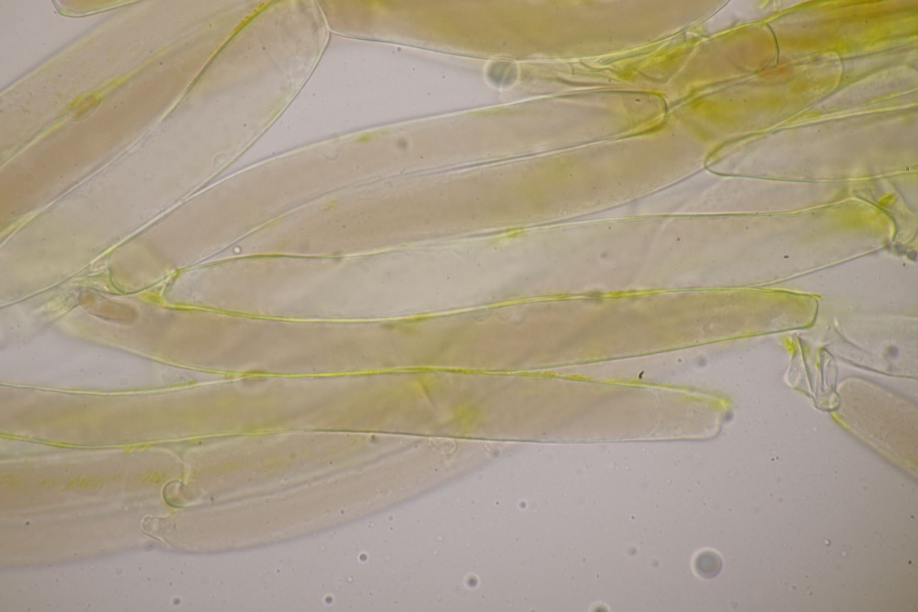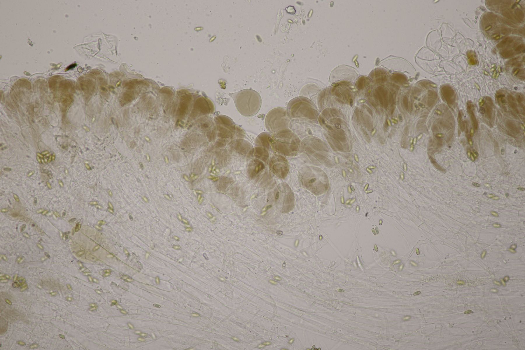 2. Ein Saftling mit glitschigem Hut, wie das Mikroskop auch deutlich zeigt. Sporenmaße 9.0+-0.6 µm x 5.2+-0.5 µm, Q=1.7+-0.1, 8.2-10.5 µm x 4.4-6.1 µm, Q=1.5-1.9, Lamellen aufsteigend angewachsen, Lamellentrama aus langen Zellen. Damit bleibt eigentlich nur Hygrocybe acutoconica, aber dafür wirkten die beiden Fruchtkörper irgendwie zu klein und außerdem sind die Sporen auch nicht groß genug. Hat da jemand eine bessere Idee?