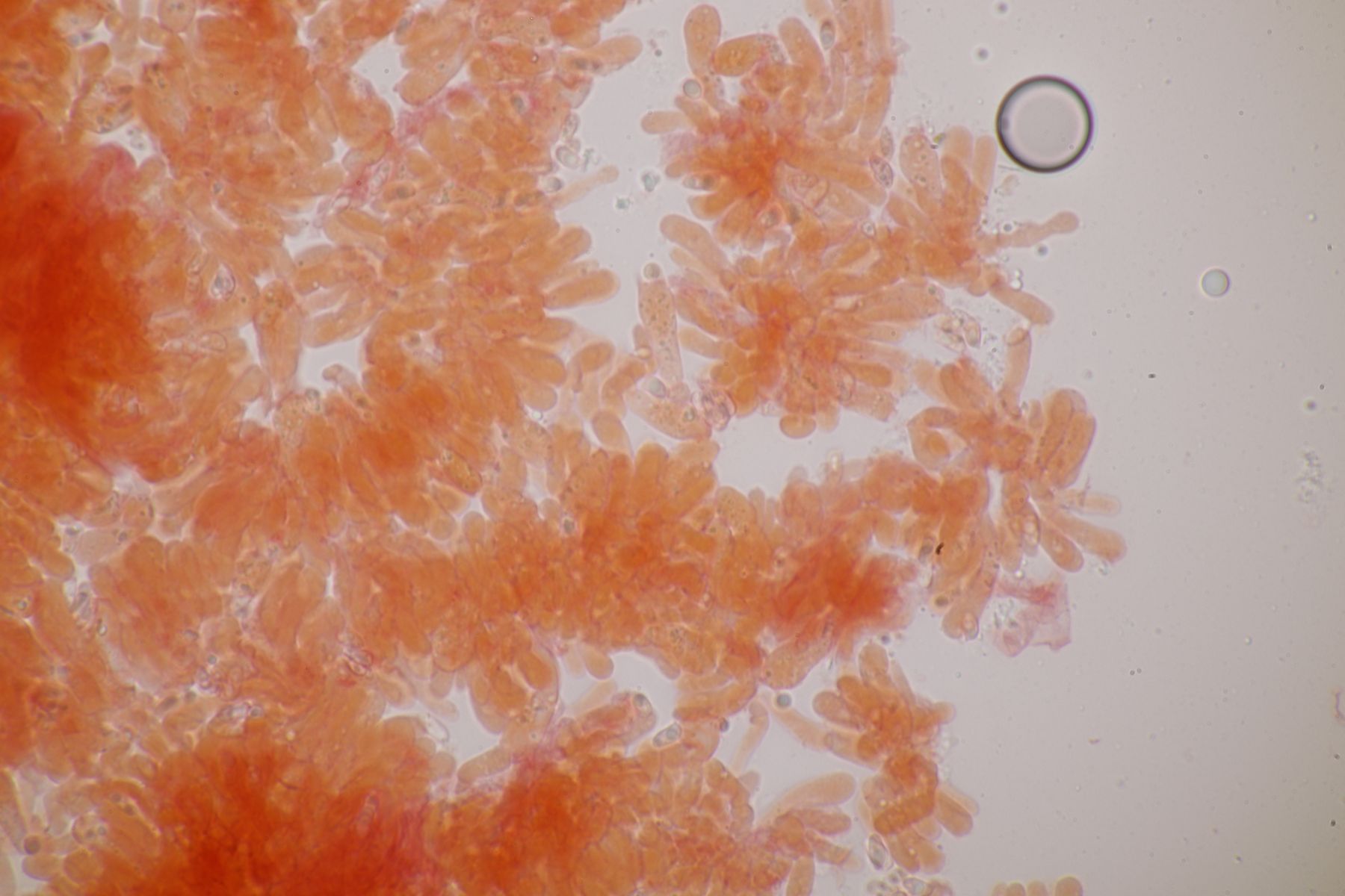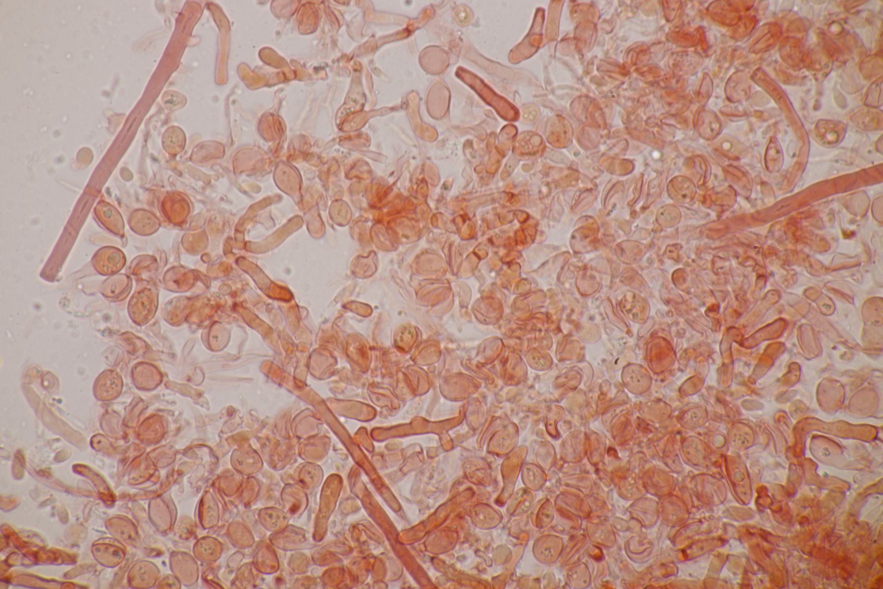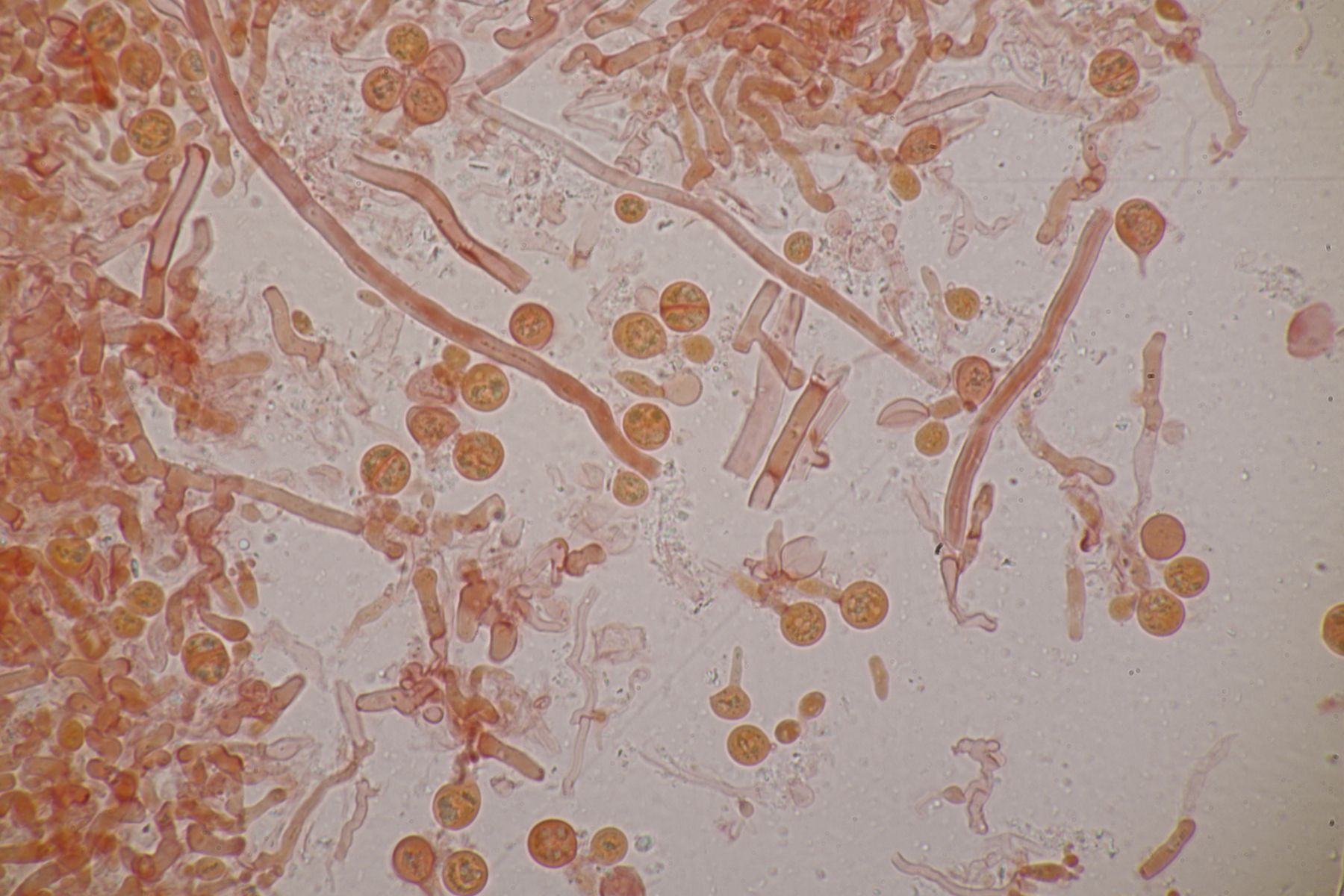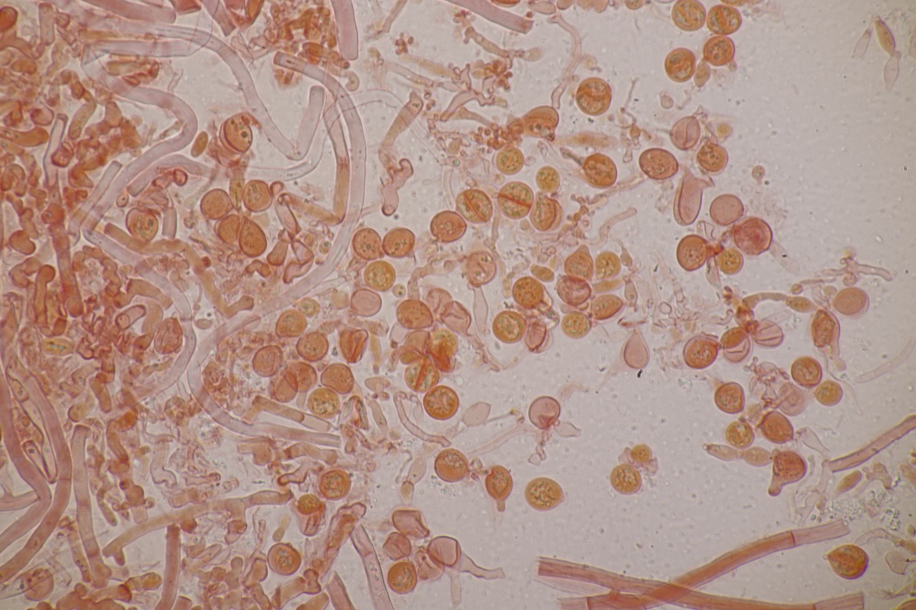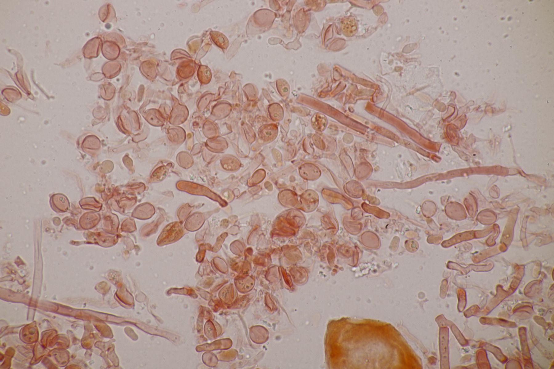 nachdem der oben gezeigte Porling eine Weile bei mir in der Küche lag, hatte ich jetzt endlich einmal Zeit einen mikroskopischen Blick hineinzuwerfen. Dabei fielen mir unmittelbar jede Menge rundliche Objekte auf, die es bei Pycnoporellus fulgens eigentlich gar nicht geben sollte. Eine genauere Betrachtung förderte dann septierte Basidien zu Tage und der Sporenabwurf, den ich vom Porling gemacht hatte, enthielt auch nicht eine Porlingsspore, sondern vielmehr Sporen eines anderen Pilzes, die teilweise mit Konidien gekeimt oder vermischt waren. Mit dem Phragmo-Schlüssel findet sich dann auch schnell ein Name für den Pilz im Pilz: Carcinomyces polyporinus, früher Tremella polyporina (bei PD als C. polyporina, im IF C. polyporinus mit dem Hinweis, daß die Umkombination den Namen C. polyporina benutzt hat). Makrosokopisch ist der Pilz praktisch unsichtbar und zeigt sich nur zufällig beim Mikroskopieren. In der Literatur wird meistens Postia als Wirt angegeben, gelegentlich auch Anthrodia. Funde an Pycnoporellus sind mir nicht bekannt, aber wer mikroskopiert auch Porlinge, wenn sie makroskopisch ansprechbar sind...