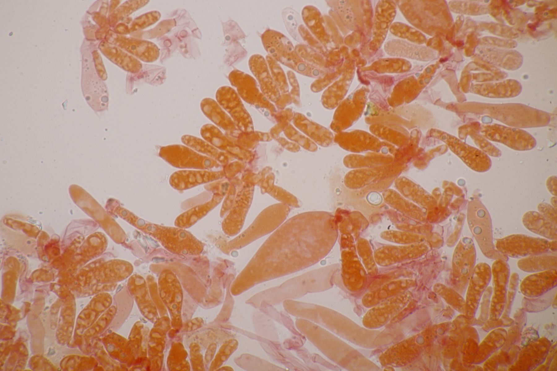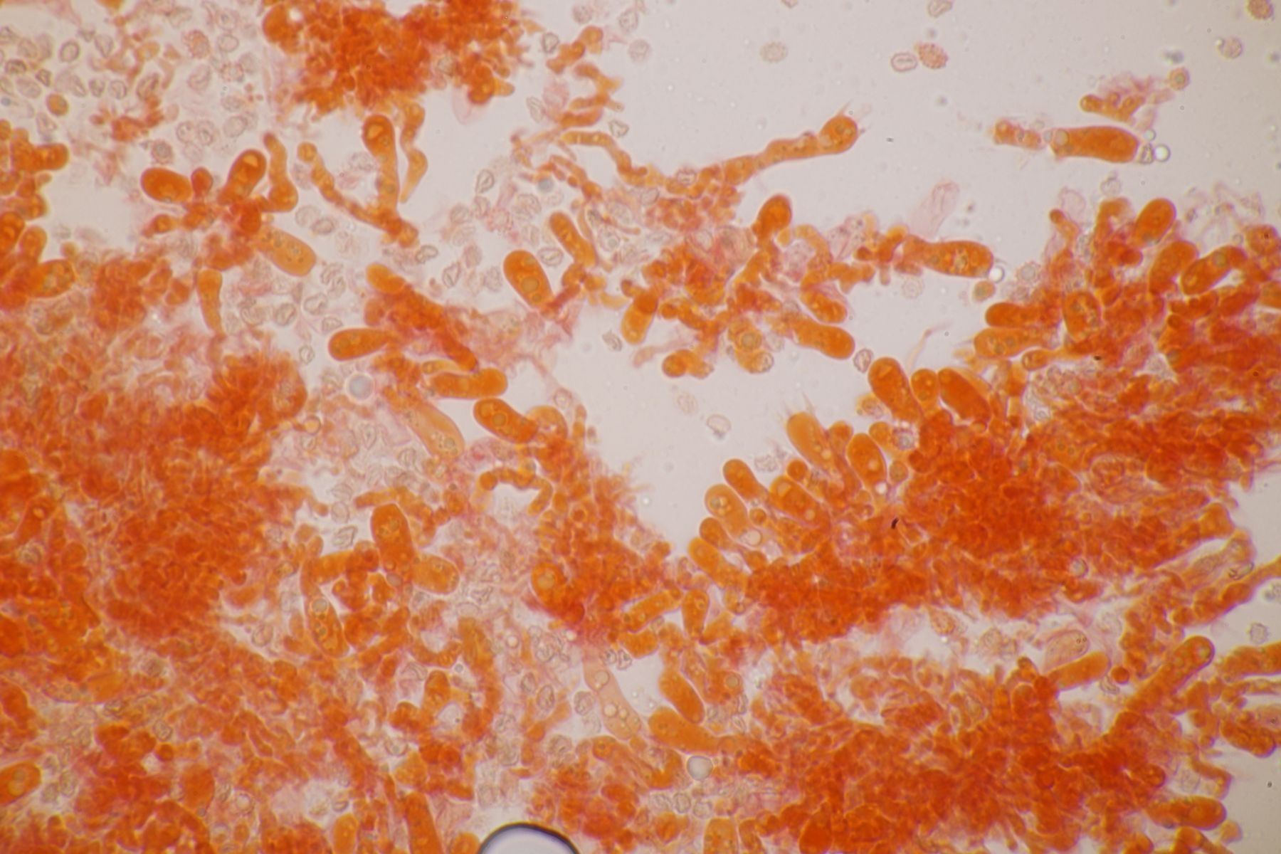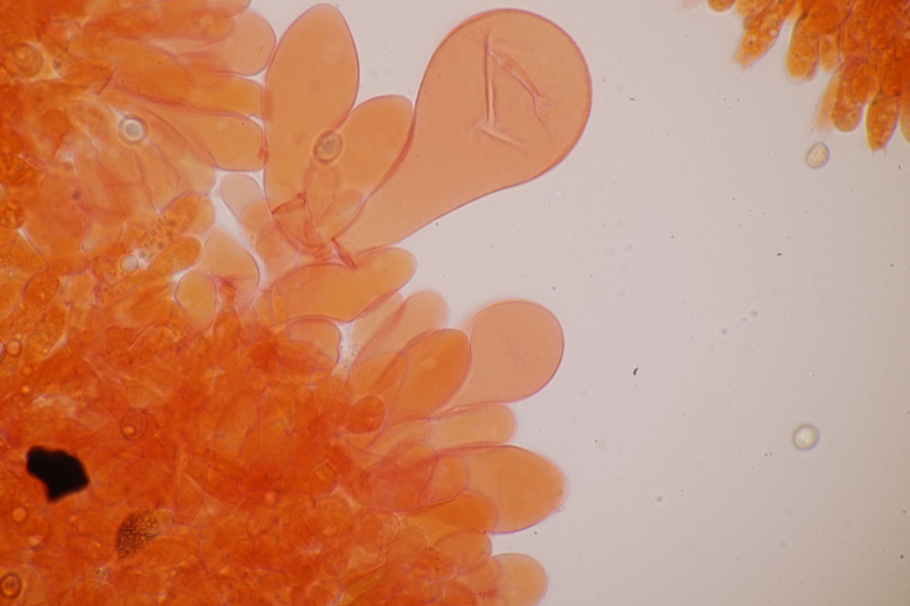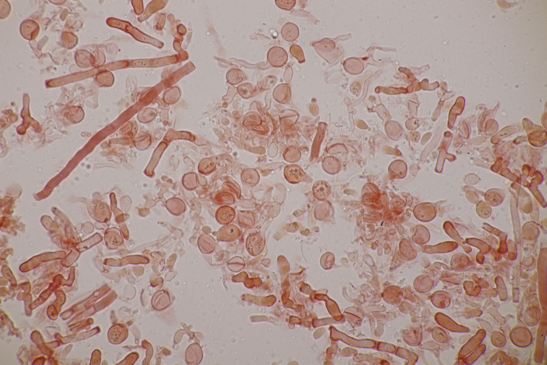 nachdem der oben gezeigte Porling eine Weile bei mir in der Küche lag, hatte ich jetzt endlich einmal Zeit einen mikroskopischen Blick hineinzuwerfen. Dabei fielen mir unmittelbar jede Menge rundliche Objekte auf, die es bei Pycnoporellus fulgens eigentlich gar nicht geben sollte. Eine genauere Betrachtung förderte dann septierte Basidien zu Tage und der Sporenabwurf, den ich vom Porling gemacht hatte, enthielt auch nicht eine Porlingsspore, sondern vielmehr Sporen eines anderen Pilzes, die teilweise mit Konidien gekeimt oder vermischt waren. Mit dem Phragmo-Schlüssel findet sich dann auch schnell ein Name für den Pilz im Pilz: Carcinomyces polyporinus, früher Tremella polyporina (bei PD als C. polyporina, im IF C. polyporinus mit dem Hinweis, daß die Umkombination den Namen C. polyporina benutzt hat). Makrosokopisch ist der Pilz praktisch unsichtbar und zeigt sich nur zufällig beim Mikroskopieren. In der Literatur wird meistens Postia als Wirt angegeben, gelegentlich auch Anthrodia. Funde an Pycnoporellus sind mir nicht bekannt, aber wer mikroskopiert auch Porlinge, wenn sie makroskopisch ansprechbar sind...