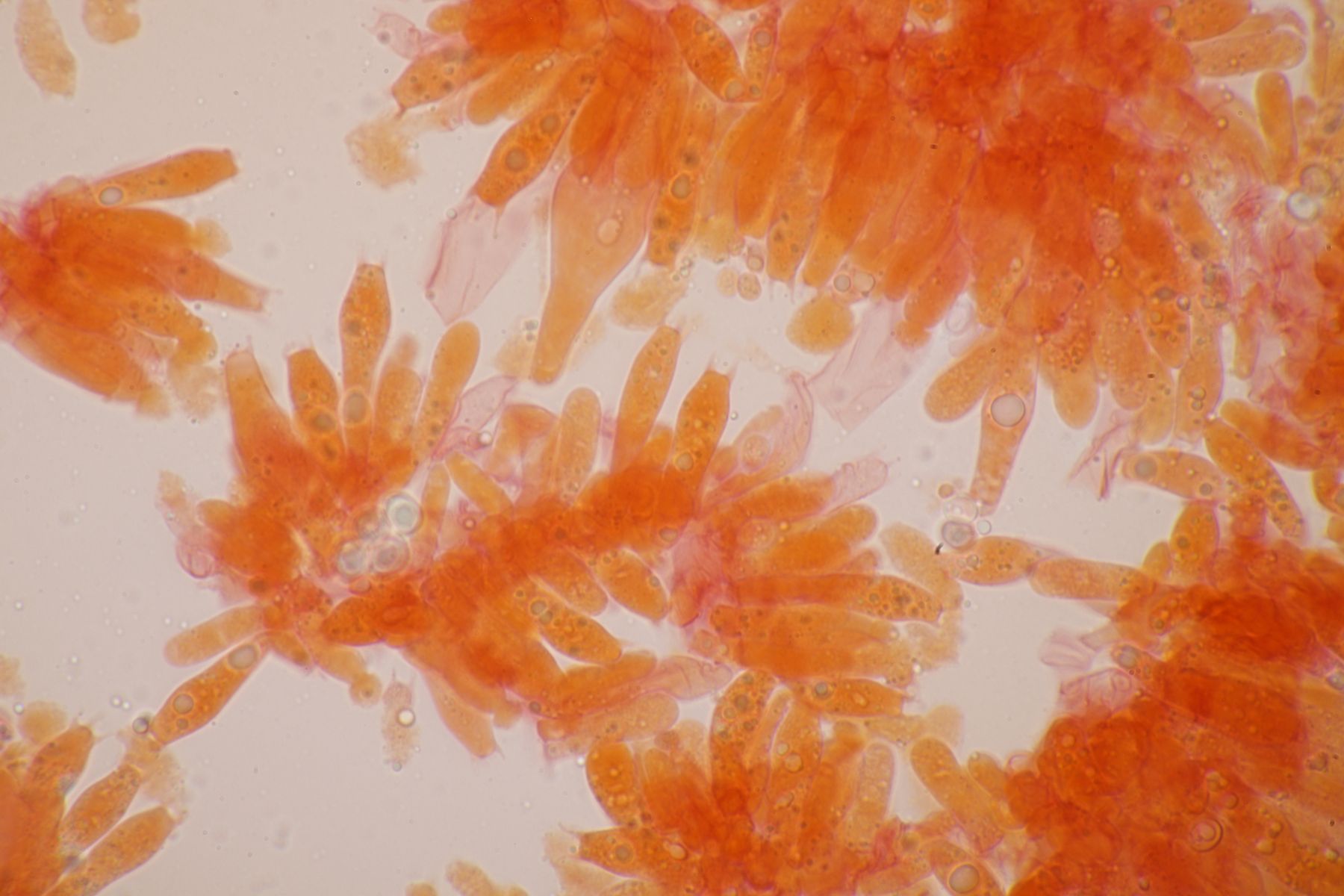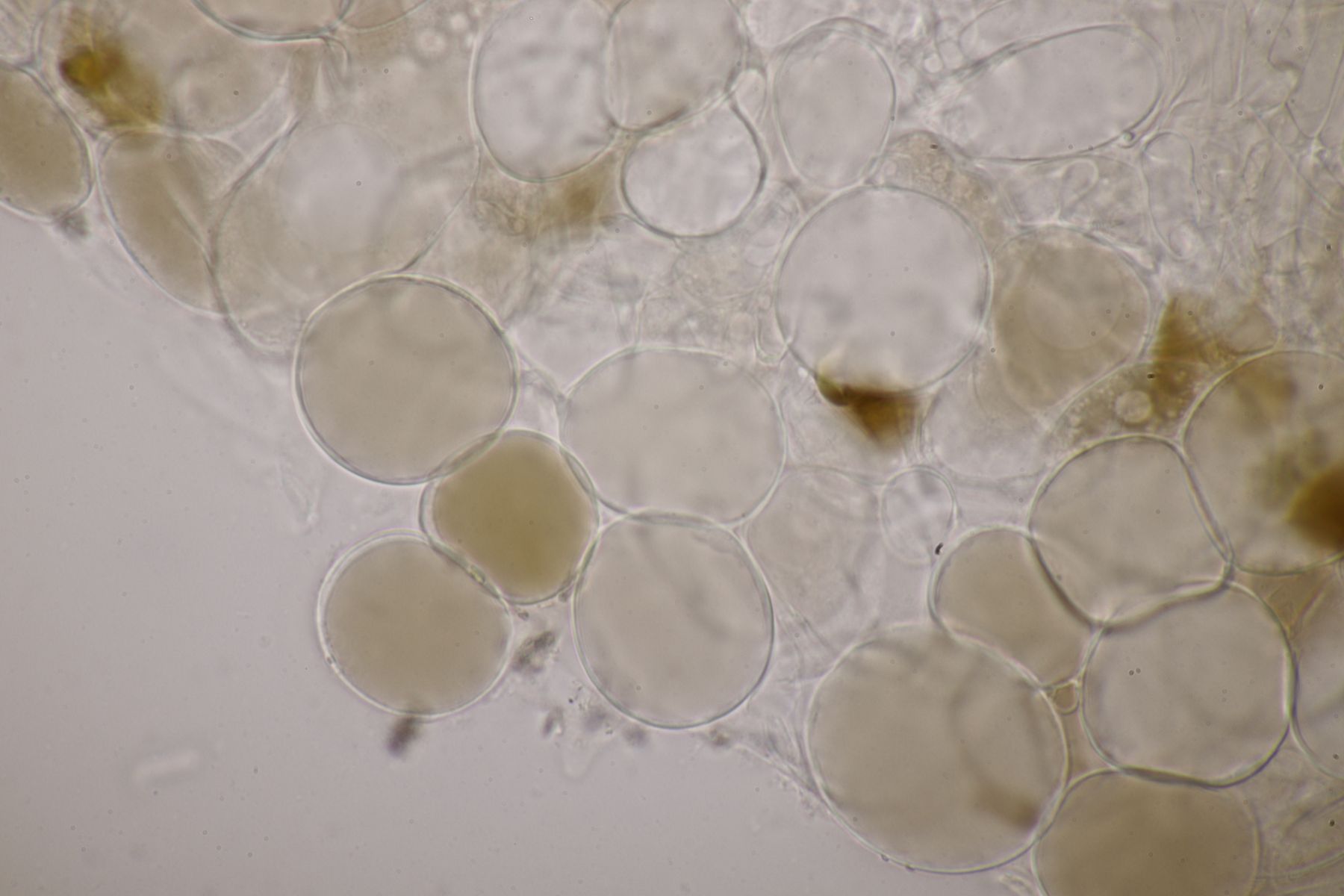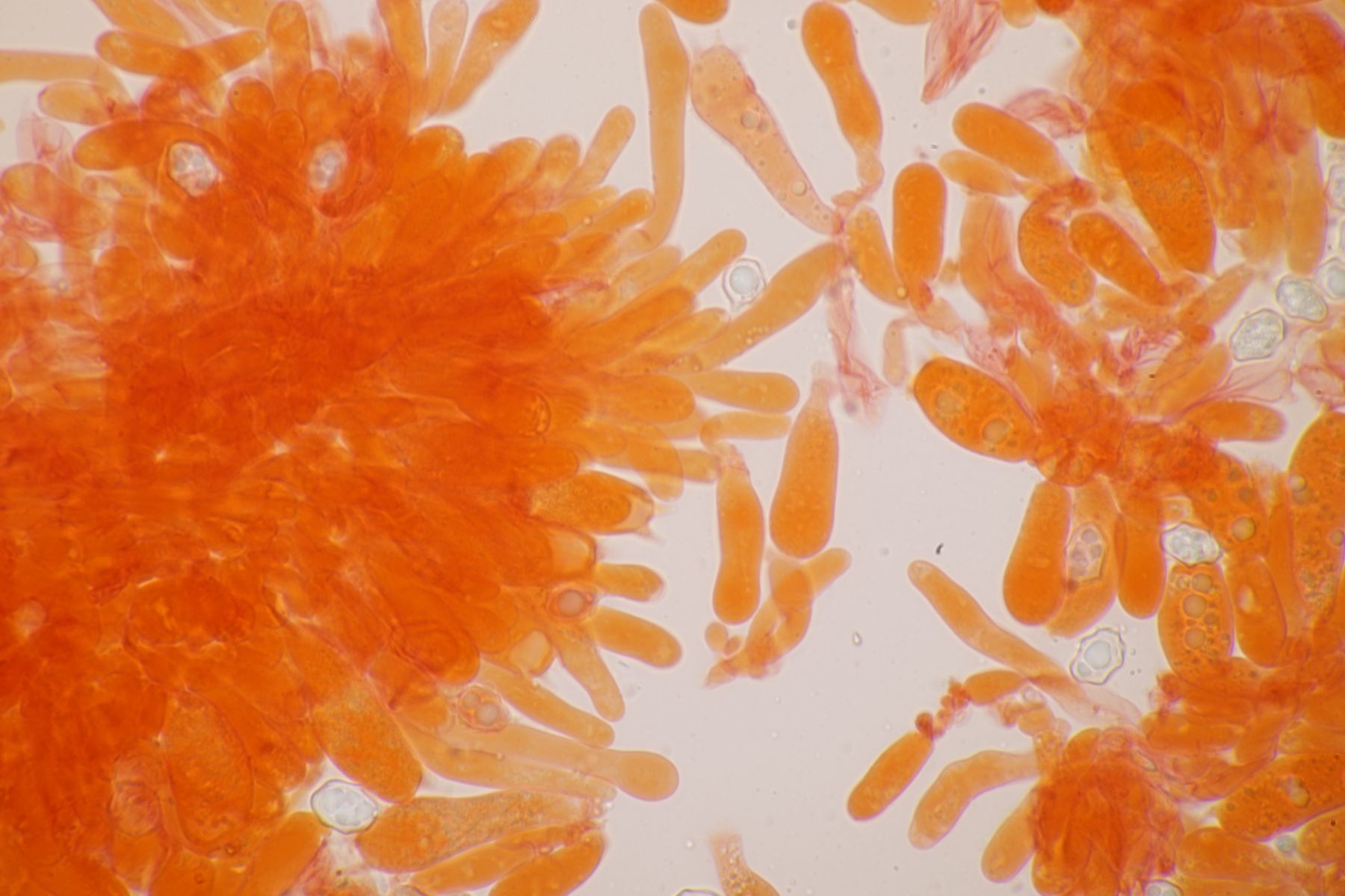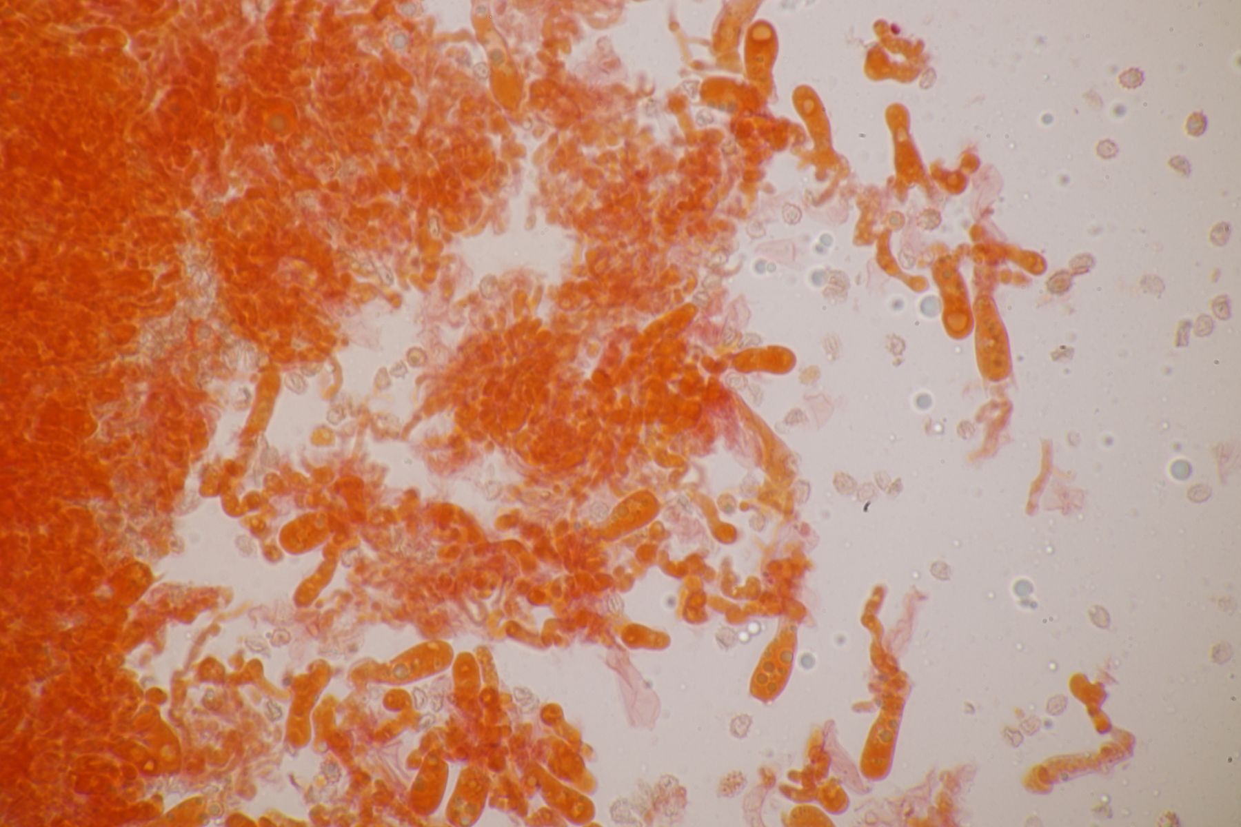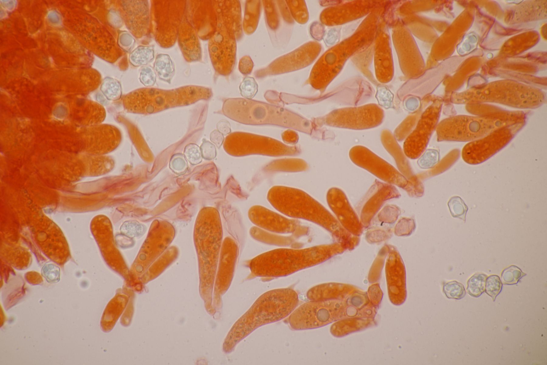 nachdem der oben gezeigte Porling eine Weile bei mir in der Küche lag, hatte ich jetzt endlich einmal Zeit einen mikroskopischen Blick hineinzuwerfen. Dabei fielen mir unmittelbar jede Menge rundliche Objekte auf, die es bei Pycnoporellus fulgens eigentlich gar nicht geben sollte. Eine genauere Betrachtung förderte dann septierte Basidien zu Tage und der Sporenabwurf, den ich vom Porling gemacht hatte, enthielt auch nicht eine Porlingsspore, sondern vielmehr Sporen eines anderen Pilzes, die teilweise mit Konidien gekeimt oder vermischt waren. Mit dem Phragmo-Schlüssel findet sich dann auch schnell ein Name für den Pilz im Pilz: Carcinomyces polyporinus, früher Tremella polyporina (bei PD als C. polyporina, im IF C. polyporinus mit dem Hinweis, daß die Umkombination den Namen C. polyporina benutzt hat). Makrosokopisch ist der Pilz praktisch unsichtbar und zeigt sich nur zufällig beim Mikroskopieren. In der Literatur wird meistens Postia als Wirt angegeben, gelegentlich auch Anthrodia. Funde an Pycnoporellus sind mir nicht bekannt, aber wer mikroskopiert auch Porlinge, wenn sie makroskopisch ansprechbar sind...