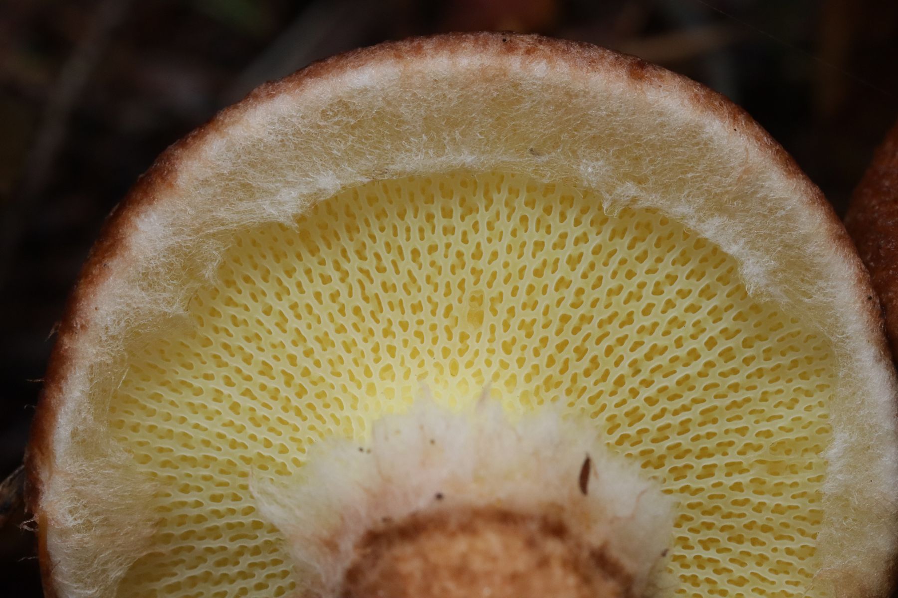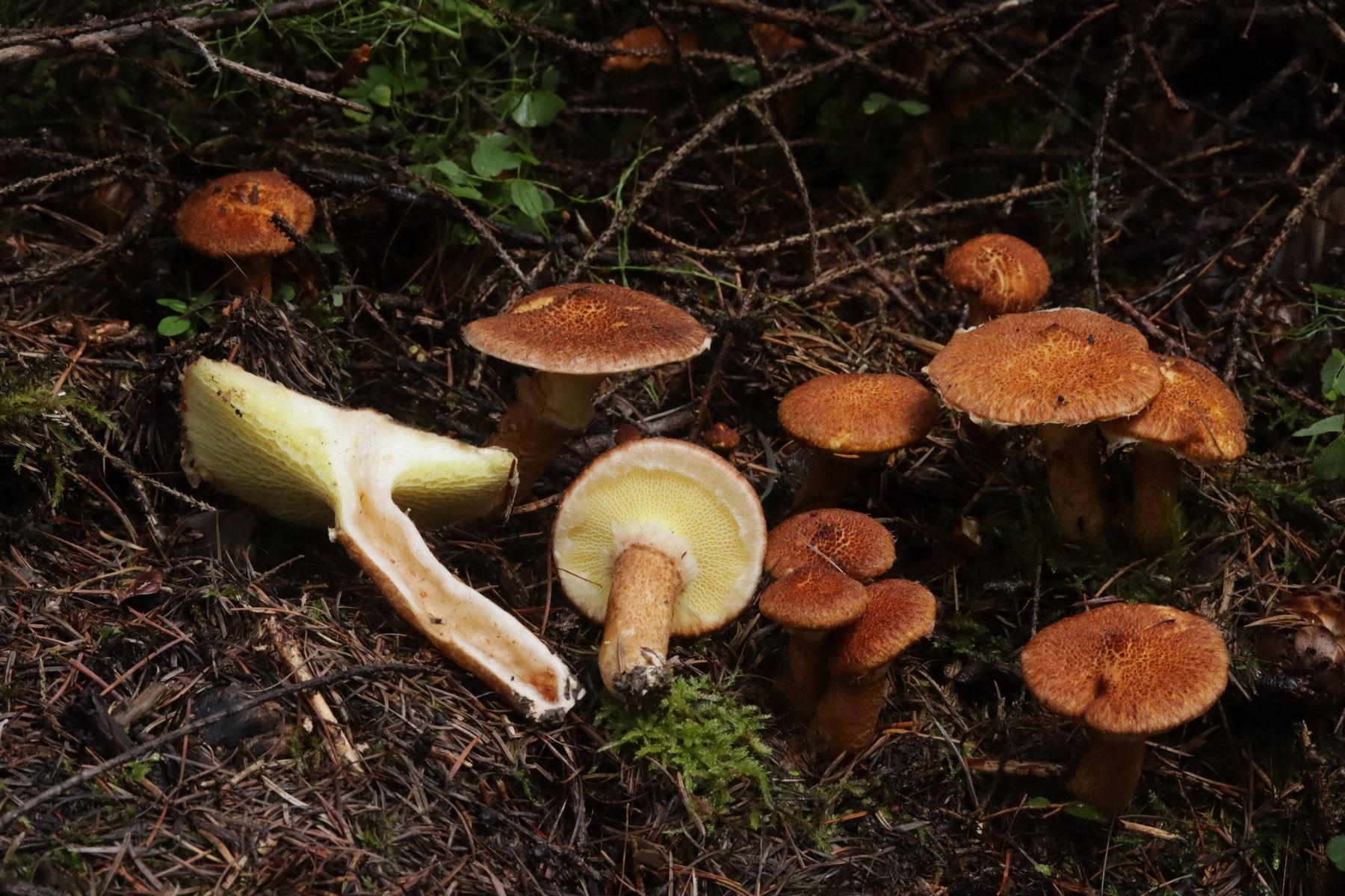 7. Hier bin ich etwas unsicher. Die Fruchtkörper unter Kiefer waren ziemlich massiv, so daß ich Richtung S. collinitus tendieren würde. Das Basalmyzel wirkte auf mich aber weißlich, was für S. granulatus typisch wäre.