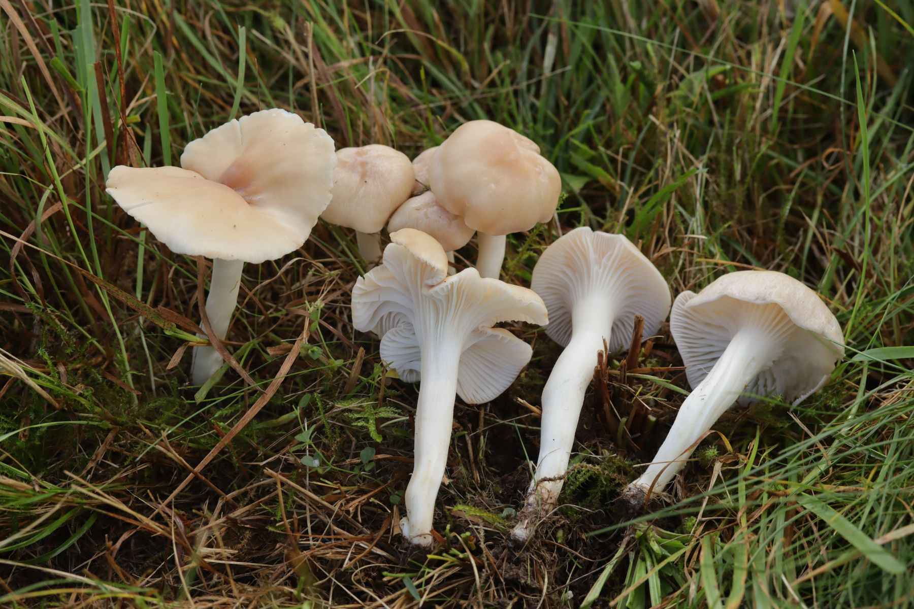 21. Irgendwie wirken mir diese Teile viel zu kräftig und stämmig für Cuphophyllus virgineus und auch der spitz gebuckelte Hut will nicht so recht passen. Kann das Cuphophyllus fornicatus sein?