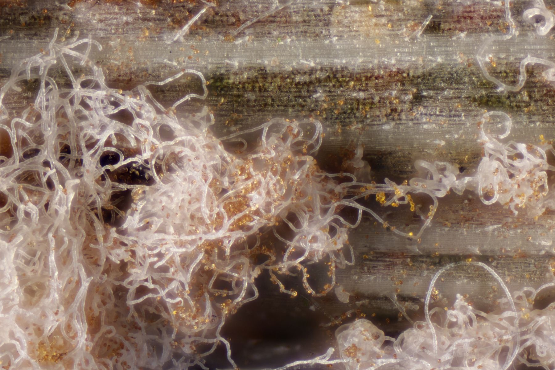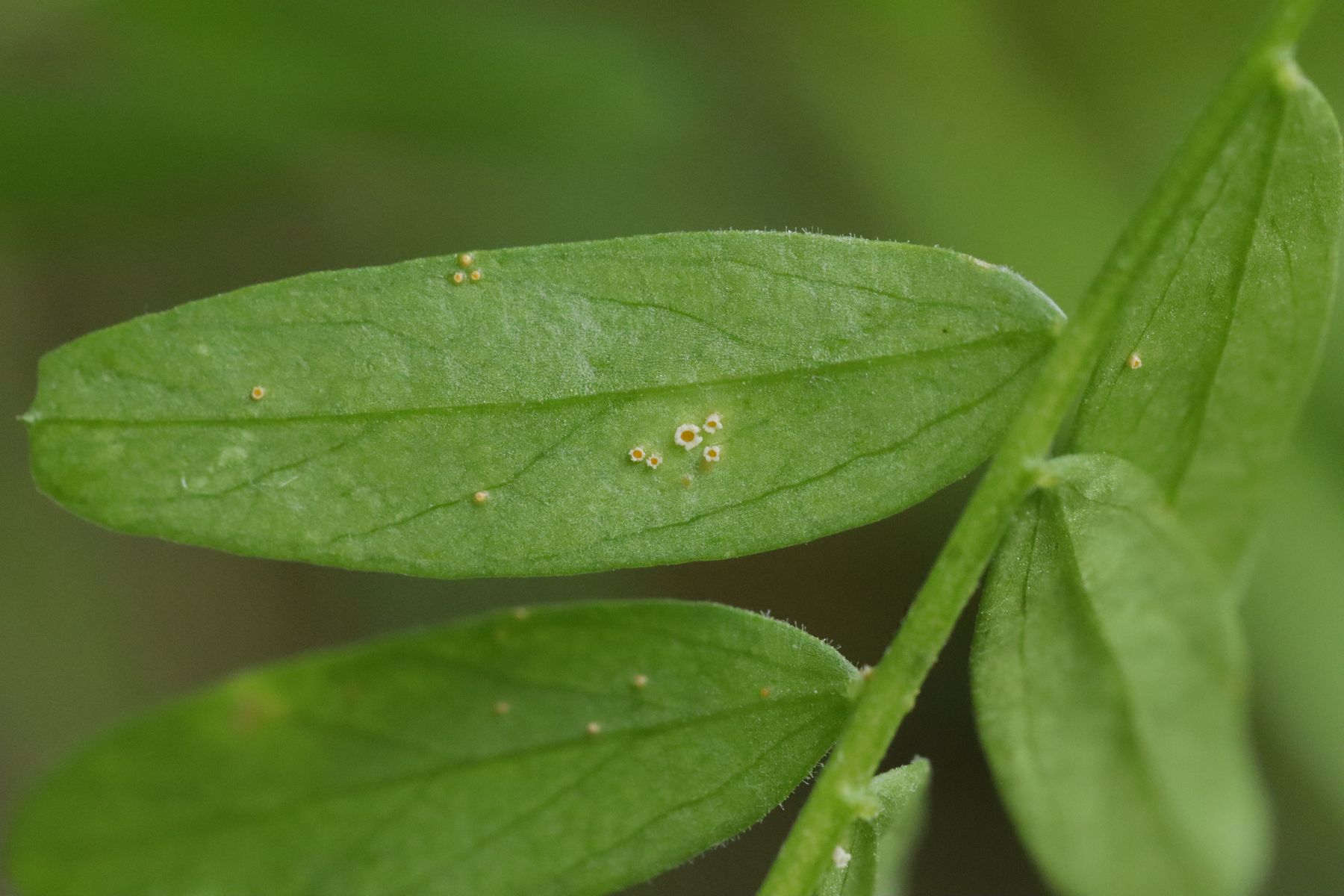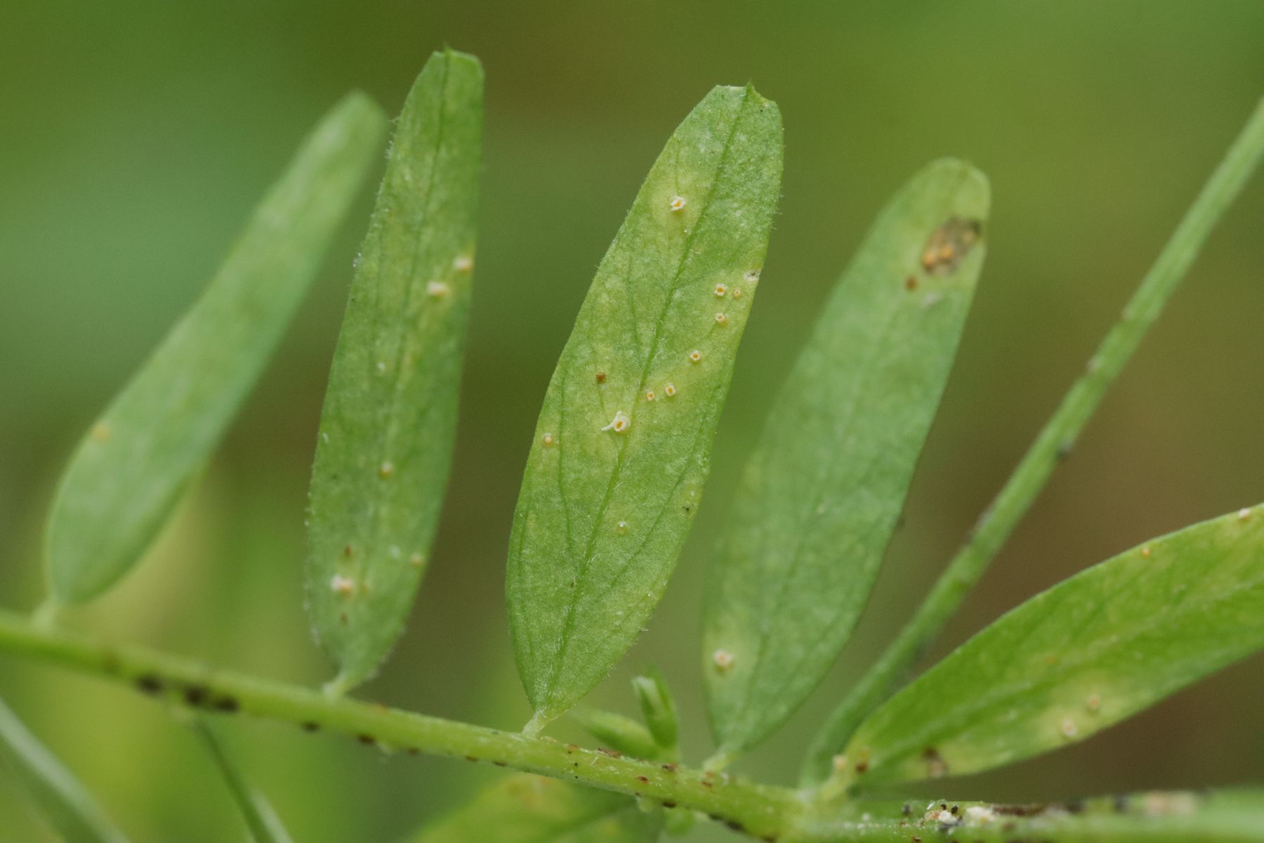 9. Peronospora ervi ex Vicia ervi. Hier gibt es keine Makrofotos, weil ich den Befall erst zu Hause am Beleg von Uromyces ervi bemerkt habe.