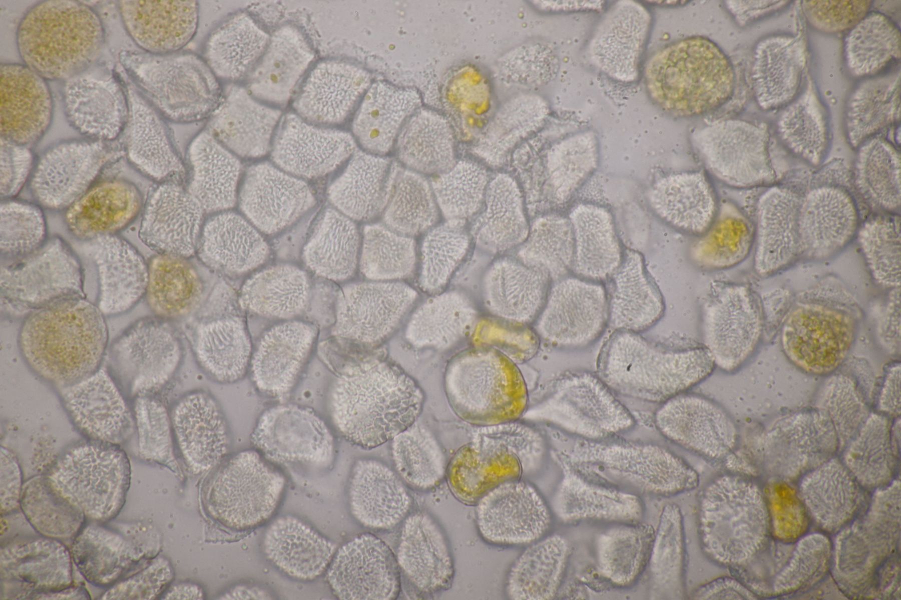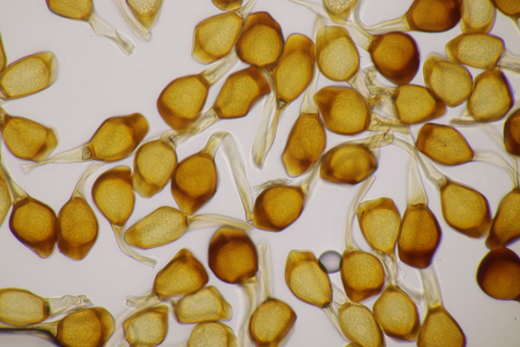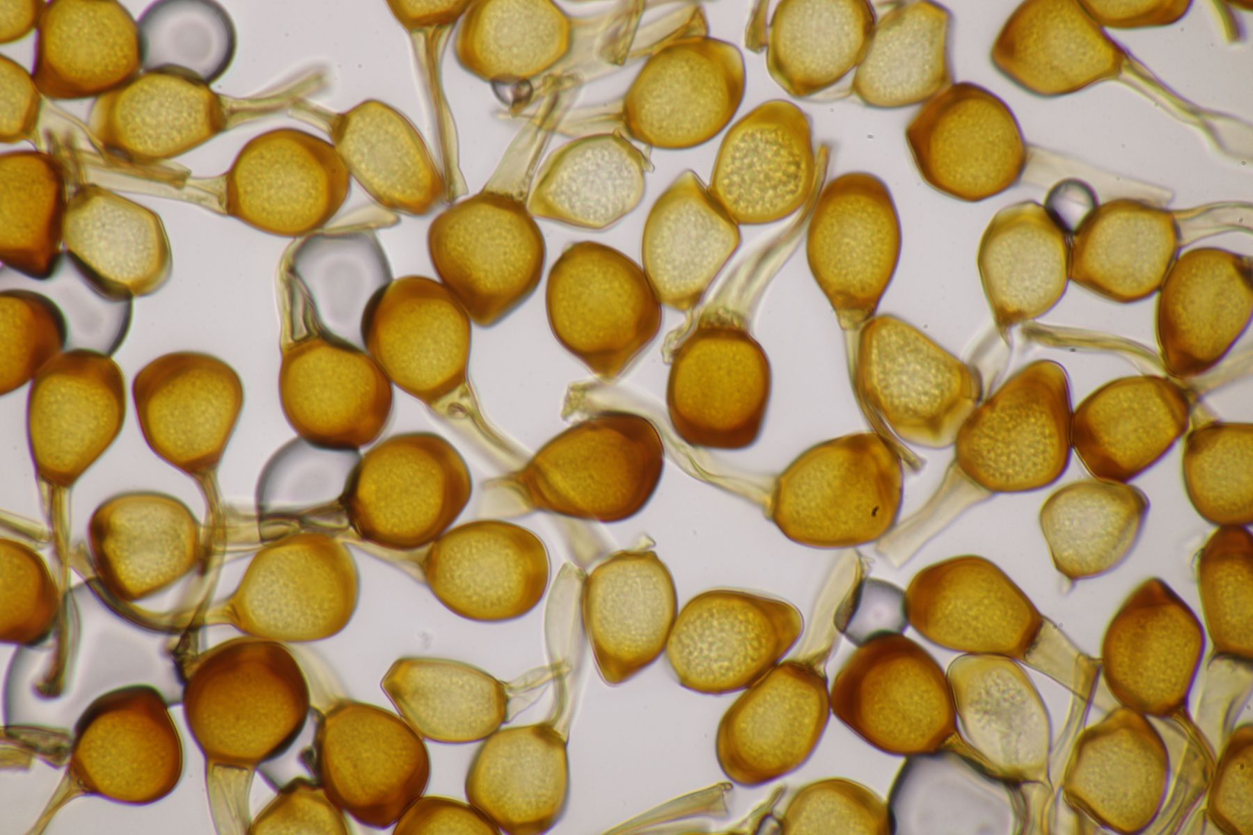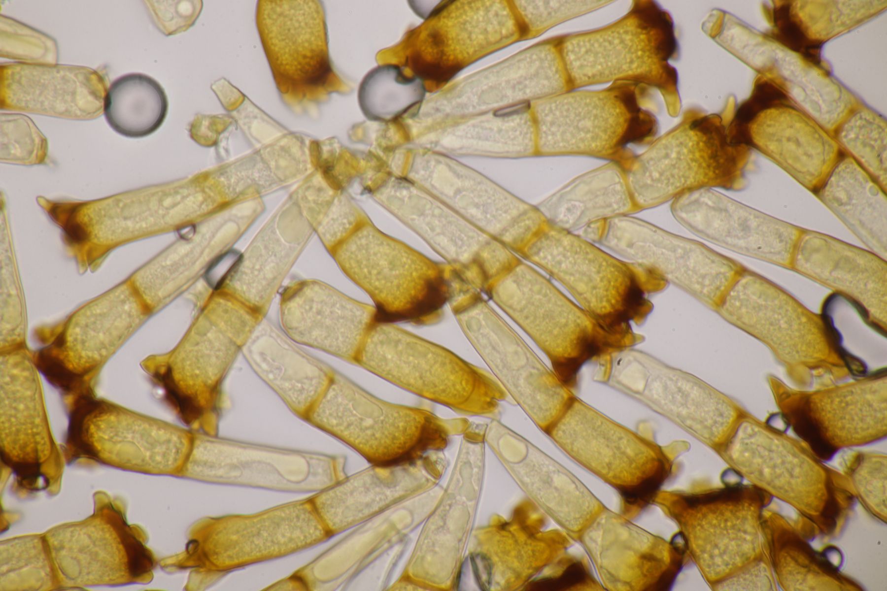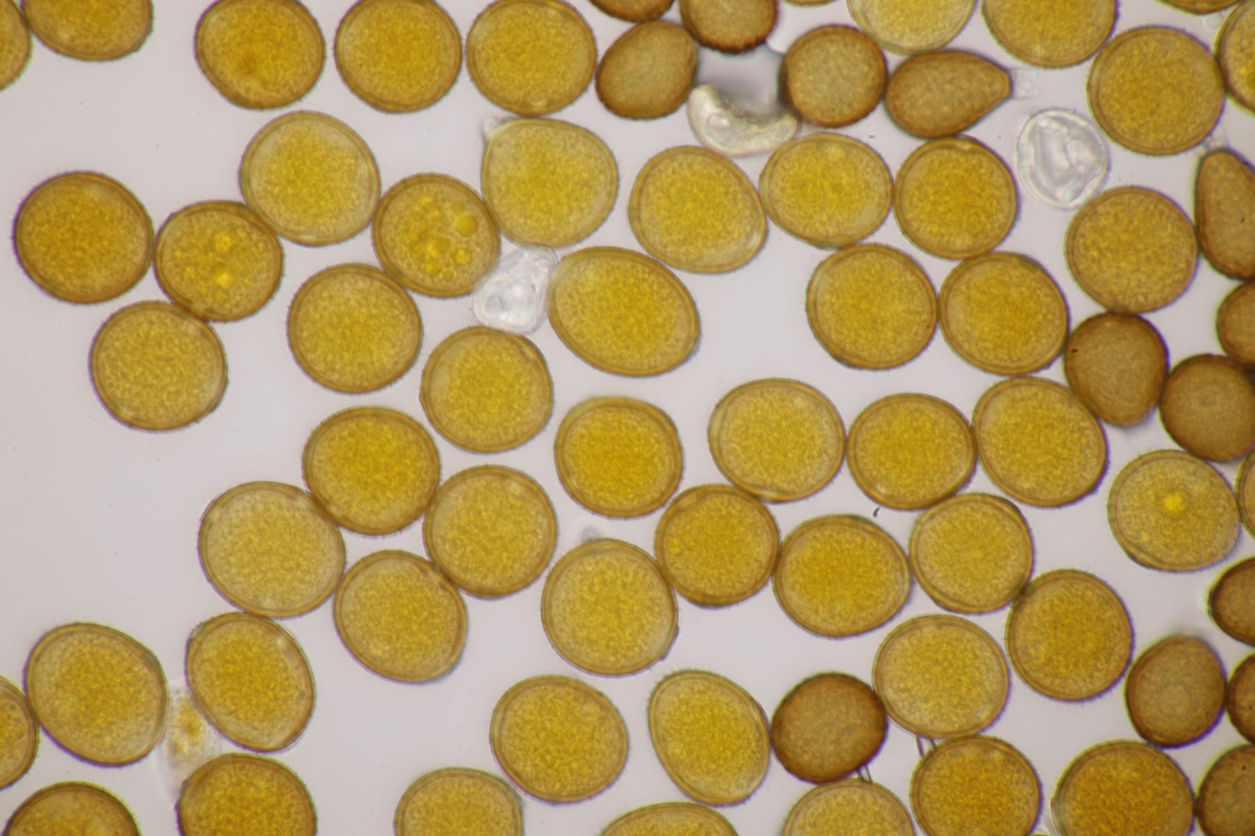 ich würde beim Huthautpräparat nicht zu sehr quetschen, man möchte ja auch noch grob wissen, wo bei der Huthaut oben und unten ist. Idealerweise hat man mit der oben beschriebenen Rasierklingentechnik aber auch nur ein hauchdünnes Stück Huthaut, das man gar nicht groß quetschen muß. Beim intrazellulären Pigment ist das Pigment im "Saft" im Inneren der Zelle gelöst. Das ist mitunter nicht so gut zu erkennen, gerade bei helleren Fruchtkörpern. In den FE wird deshalb auch empfohlen, Präparate in Zucker- oder Salzlösung zu machen, wo die Osmose dann dazu führt, daß das Zellinnere Wasser verliert und die Färbung besser erkennbar wird.