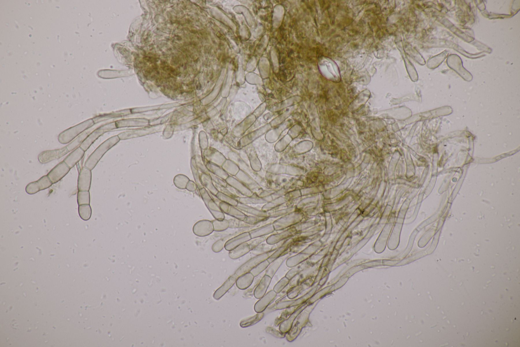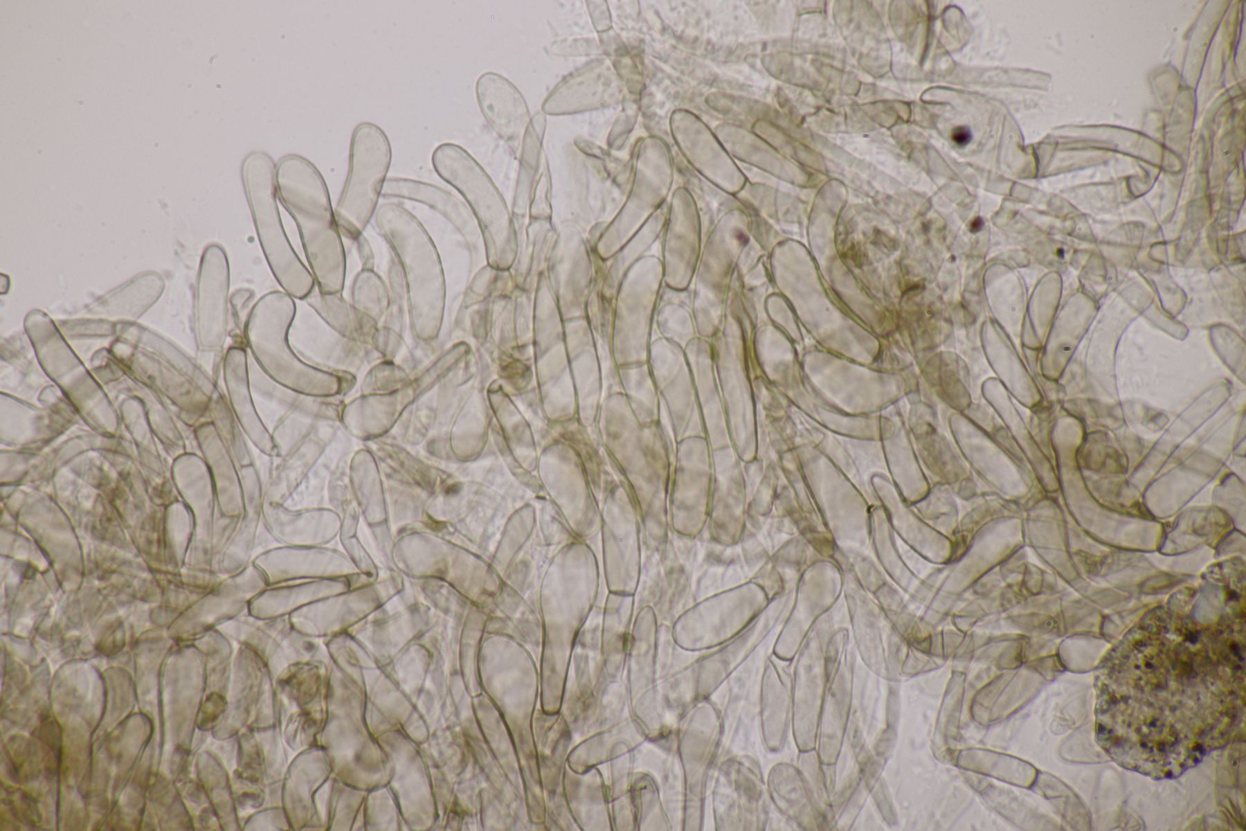 10. Noch eine Erdzunge, von der ich allerdings kein Makrofoto gemacht habe. Sporen im Abwurf 7-fach septiert, 86,5-96,4 µm x 4,7-6,0 µm, im Mittel 91 µm x 5,3 µm, Q=17.2+-2.0. Paraphysen an der Spitze verdickt, teilweise an Golfschläger einnernd und zum Teil eingerollt. Die Fruchtkörper waren nicht glitschig, Setae sind nicht vorhanden, so daß es also ein Geoglossum ist. Das paßt irgendwie alles nicht so richtig zu G. umbratile. G. cookeanum ist auch raus, aber was ist es dann?