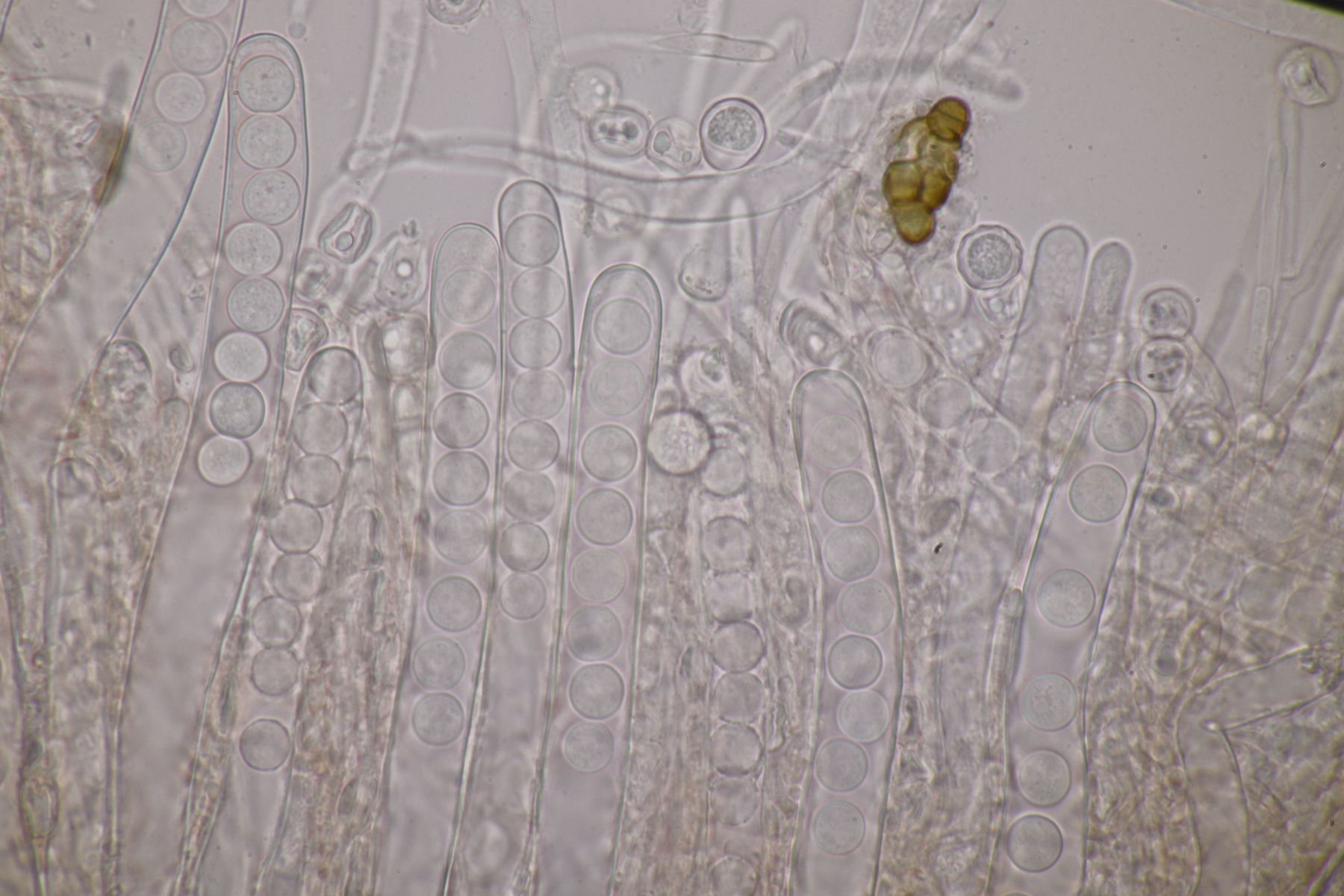 es gibt offenbar doch noch Pilze, die die Literatur lesen und dann ihre Fruchtkörper genau so ausbilden, wie es vorgeschrieben ist! Wobei ich hier richtig Glück hatte: Ich habe genau diesen einen Fruchtkörper gefunden, der eine überschaubare Anzahl an Asci enthielt und habe dann ein halbwegs gelungenes Präparat hinbekommen. Ich sollte mir vielleicht angewöhnen, die Köttelchen, von denen ich gerade einen Pilz entnommen habe, irgendwie zu markieren, weil man dann ja eine größere Wahrscheinlichkeit hat, Dinge noch mal wiederzufinden (sofern es sie mehr als einmal gibt).