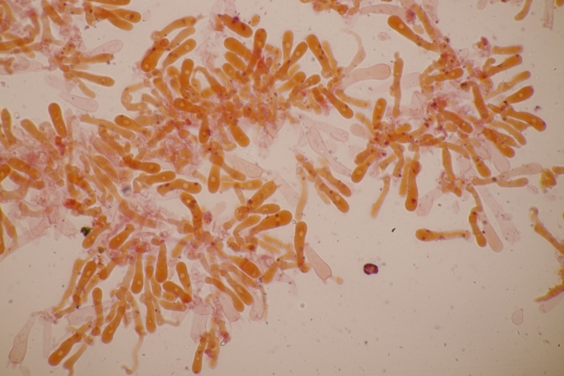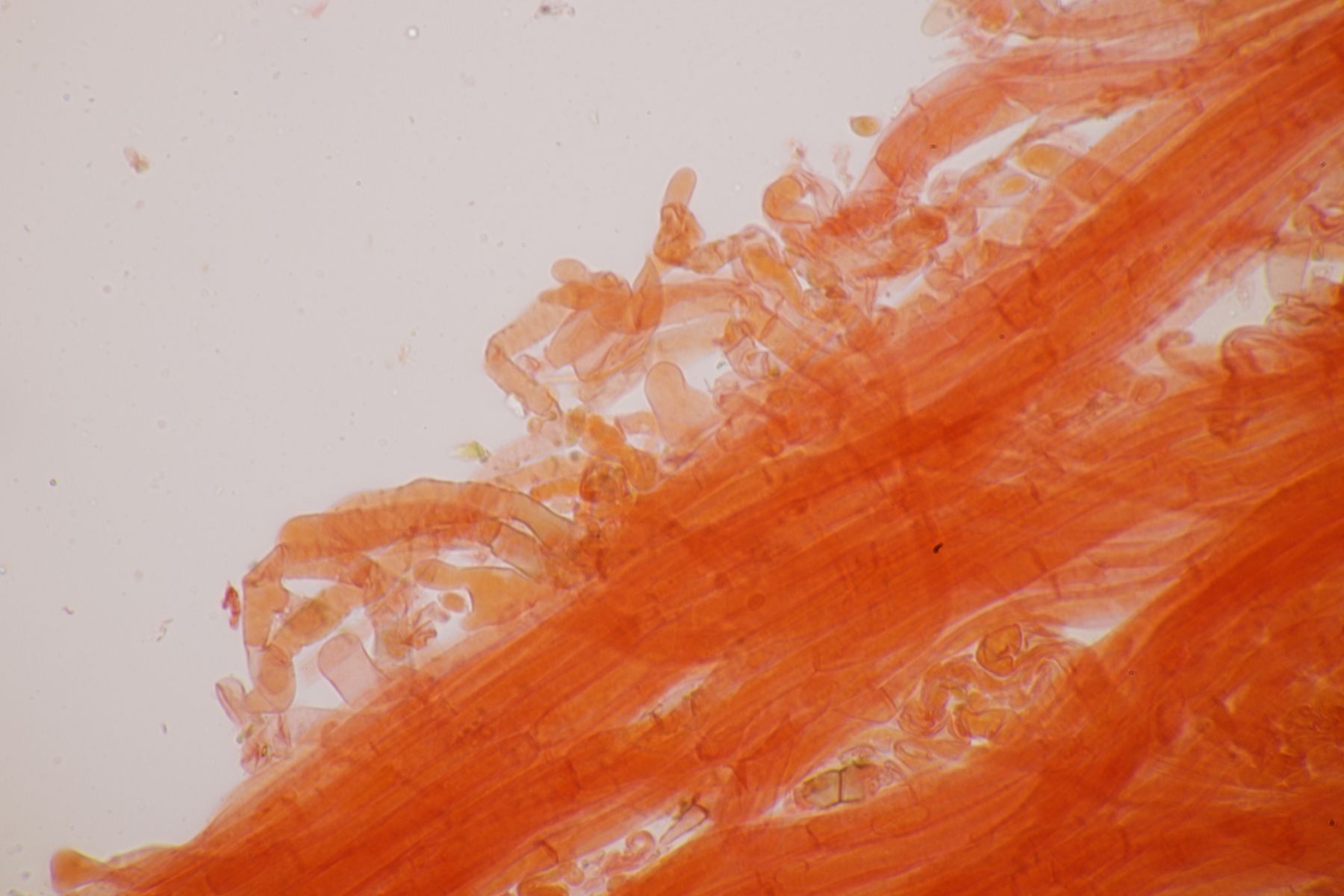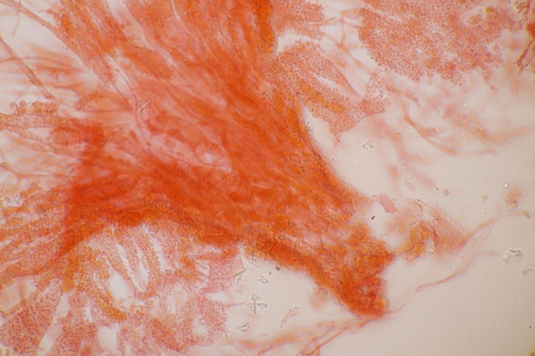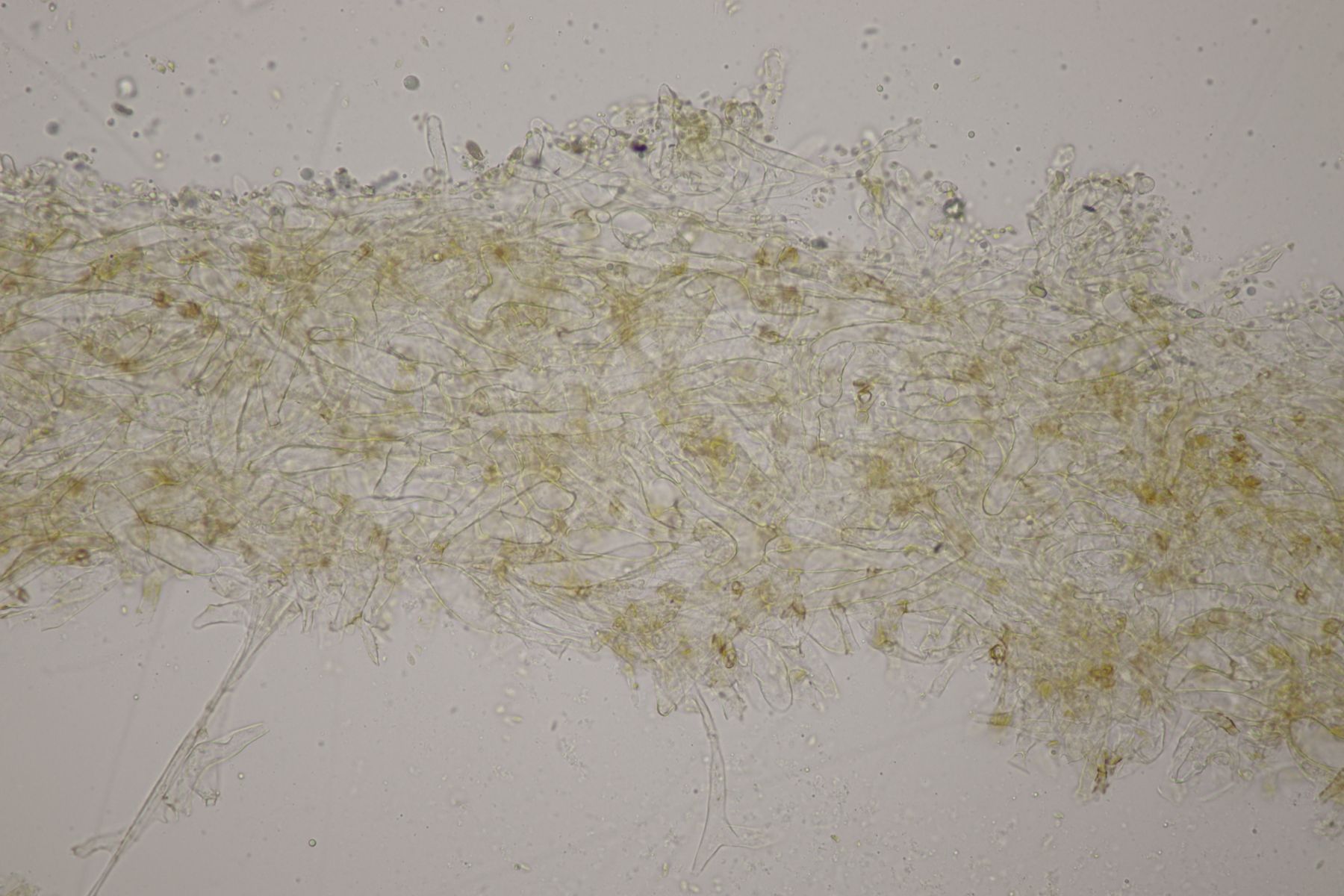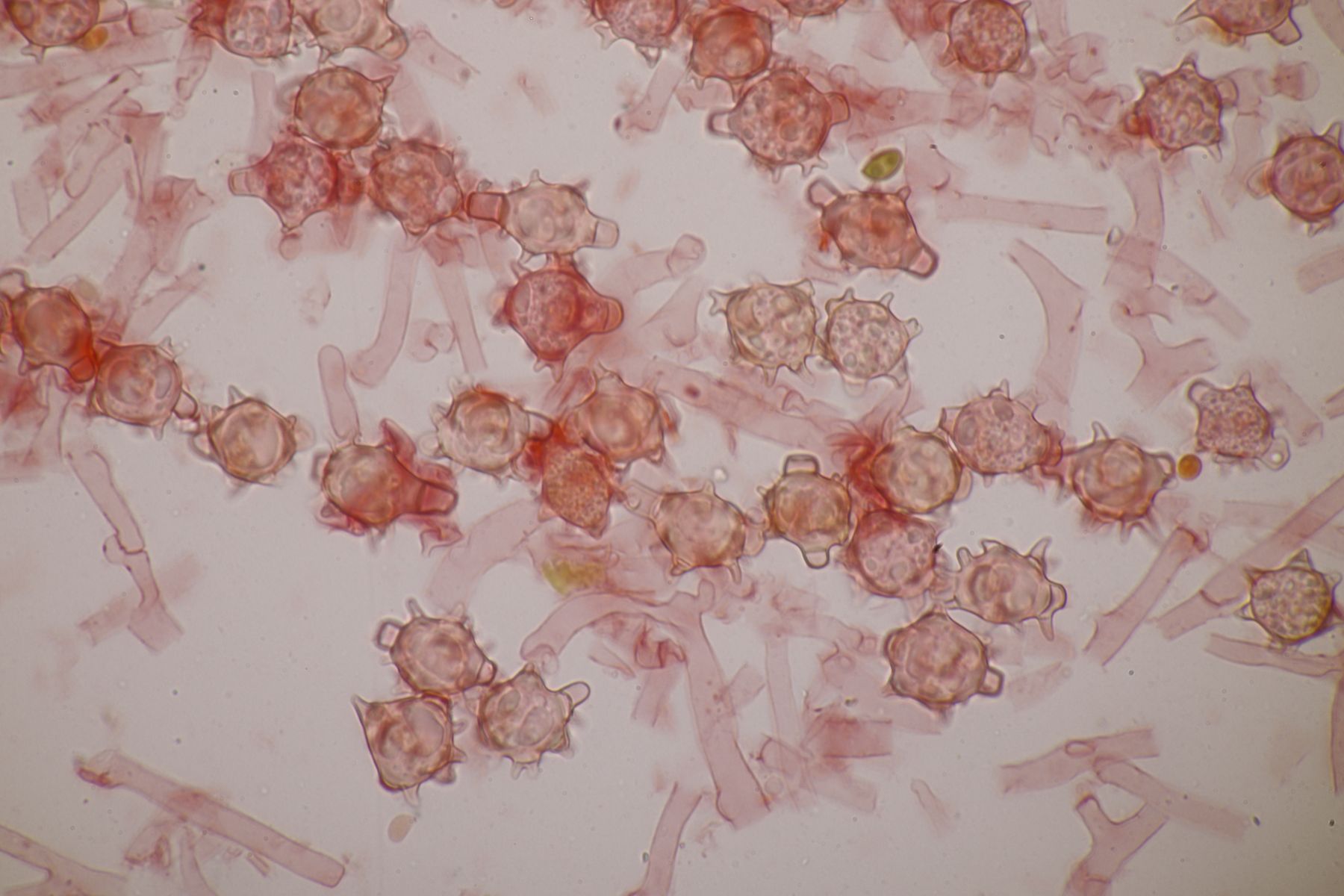 ich nehme ja ab und zu mal eine Tomentella mit nach Hause, weil die zwar oft schwierig in der Bestimmung sind, aber eben auch hübsche Mikromerkmale bieten. Was das Erkennen von tomentelloiden Pilzen angeht, kann man erstmal salopp sagen: Braune Krusten, die auf dem Boden wachsen, sind mit hoher Wahrscheinlichkeit eine Tomentella (oder eine resupinate Thelephora). Wenn man mal einige Tomentellas gesehen hat, erkennt man die eigentlich auch im Feld schon ganz gut (bzw. findet sie dann überhaupt erst). Wenn man sich da systematischer heranwagen möchte, sei auf den Schlüssel in den Fungi Europaei Band 10 über Corticiaceaen verwiesen: Sternförmige Asterohyphidien abwesend -> Setae abwesend -> Dichohyphen oder Skeletthyphen nicht dextrinoid -> Sporen hyalin bis typischerweise braun oder violett in KOH, ornamentiert, telephoric acid vorhanden -> Tomentelloide Pilze