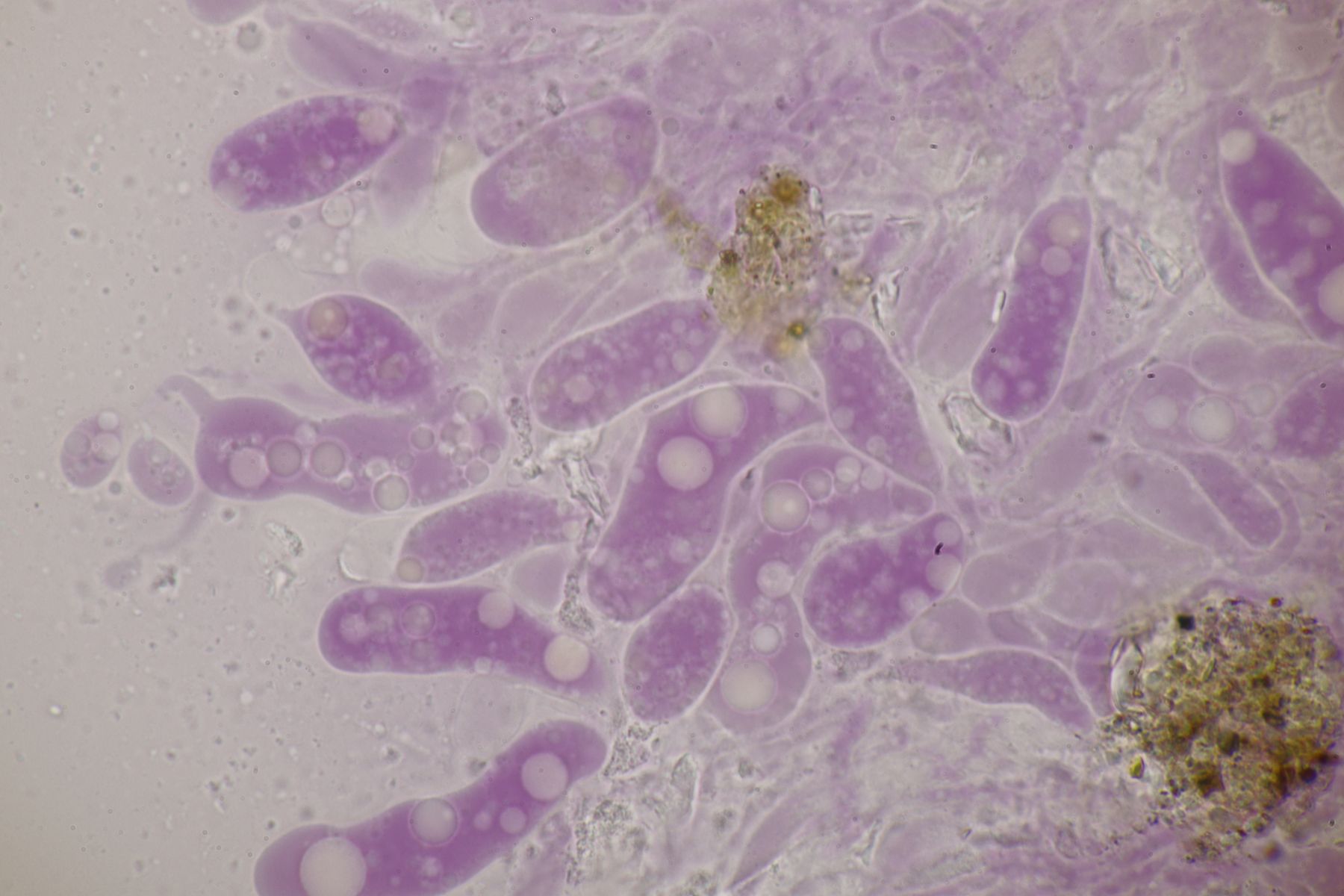 Ein weiteres wichtiges und noch nicht erwähntes Bestecktteil ist ein Radiergummi. Damit kann man wunderbar auf dem Deckgläschen rumklopfen und drücken (das erfordert natürlich Übung und Fingerspitzengefühl) und die Bestandteile des Präparats auseinanderdrücken. Das klappt natürlich nicht immer gleich gut: Bei Keulchen klebt gerne alles zusammen und man muß sehr feste quetschen, bei Entoloma hat man mit etwas zu viel Druck gerne direkt die Basidien an den Köpfen gesprengt.