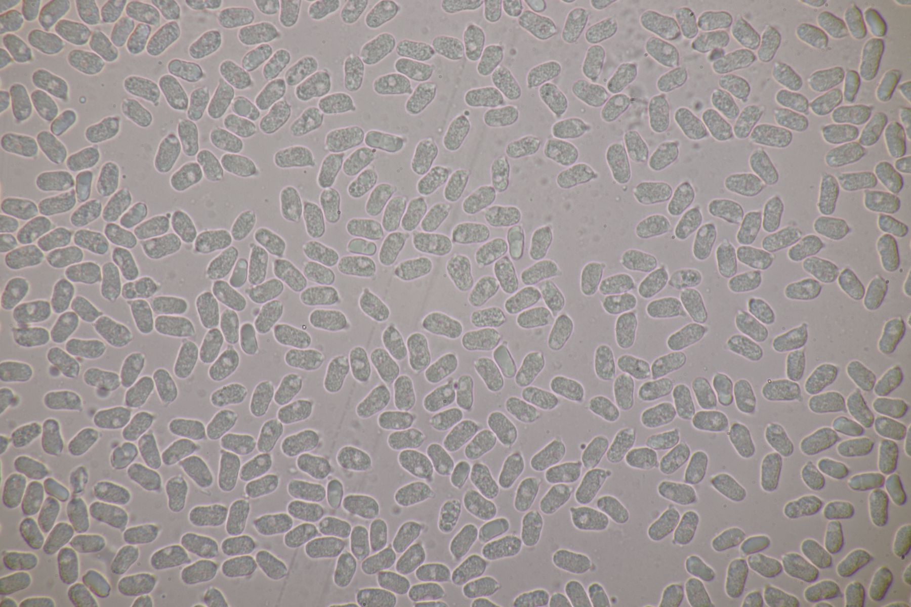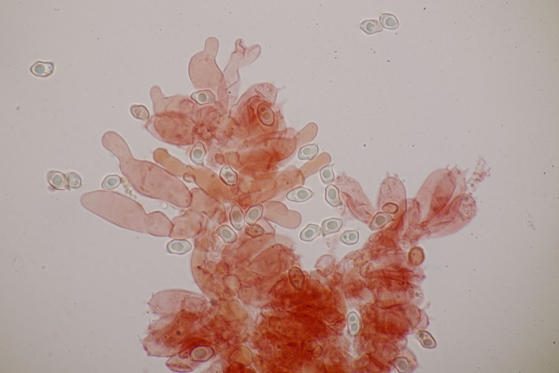 1. Cuphophyllus russocoriaceus. Auch wenn ich keine Ahnung habe, wie Juchtenleder riecht, konnte ich schon einen angenehmen Geruch wahrnehmen. Sporenmaße 8,5±0,4 µm × 5,2±0,4 µm, Q=1,7±0,1; 7,8-9,7 µm × 4,4-6,3 µm, Q=1,4-2
