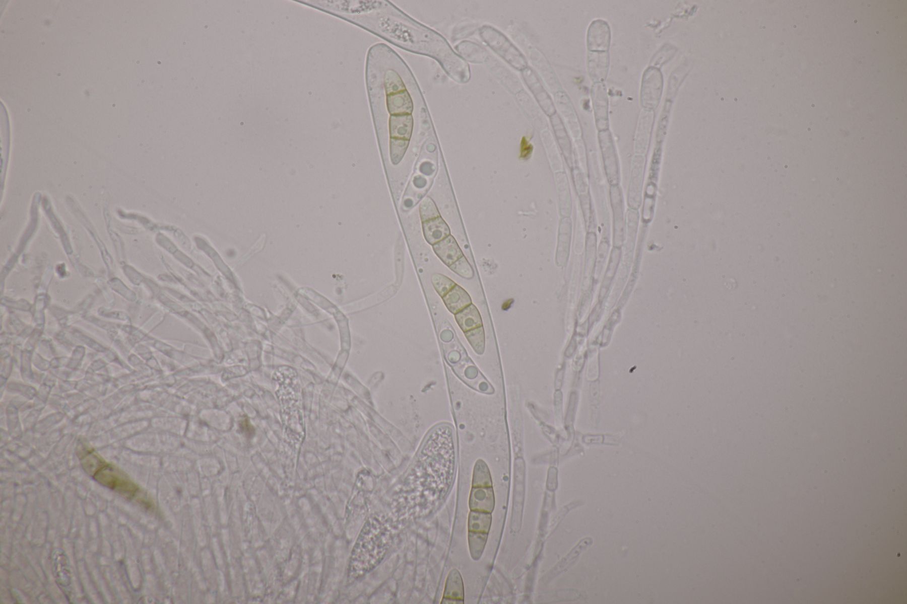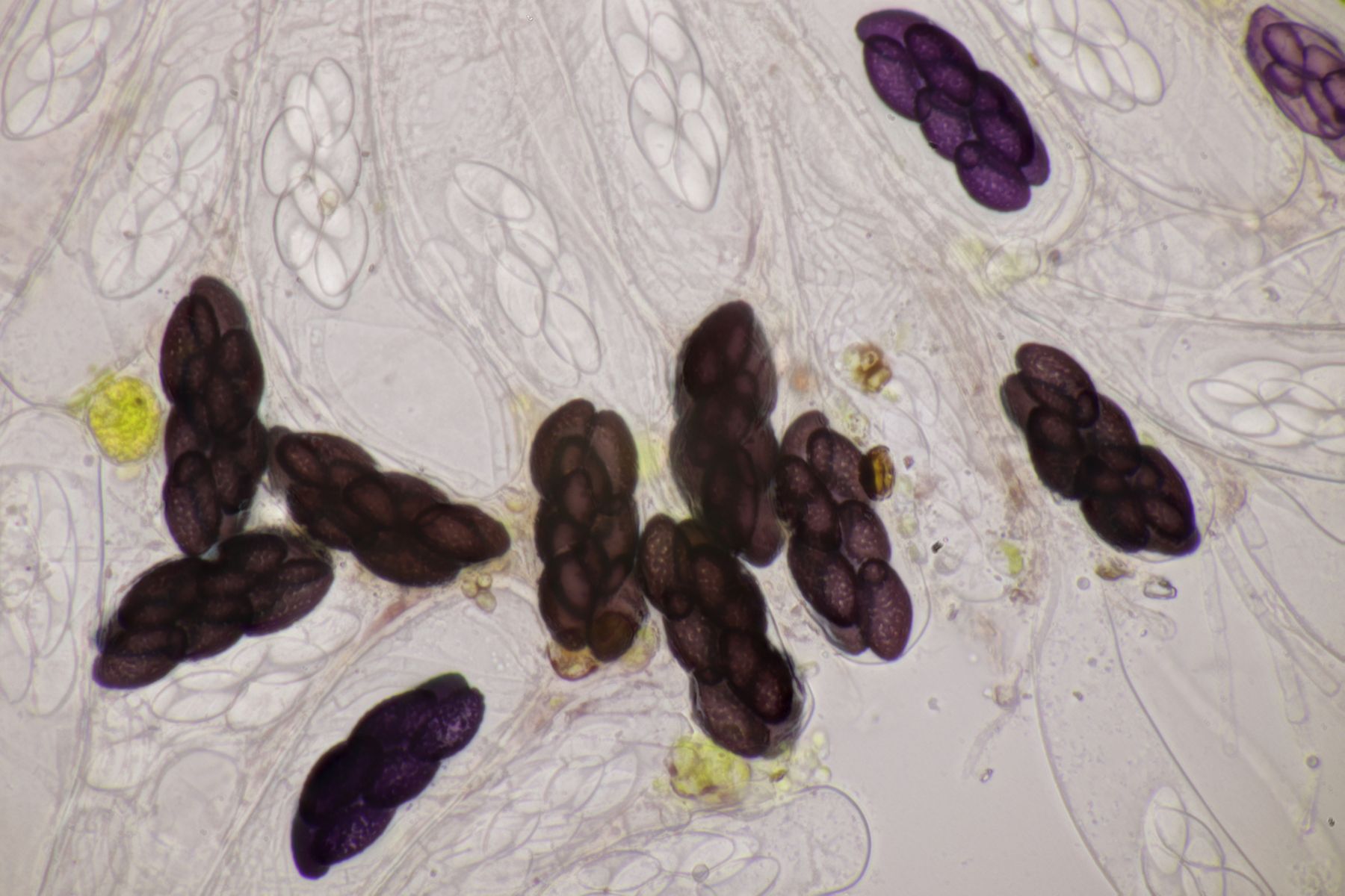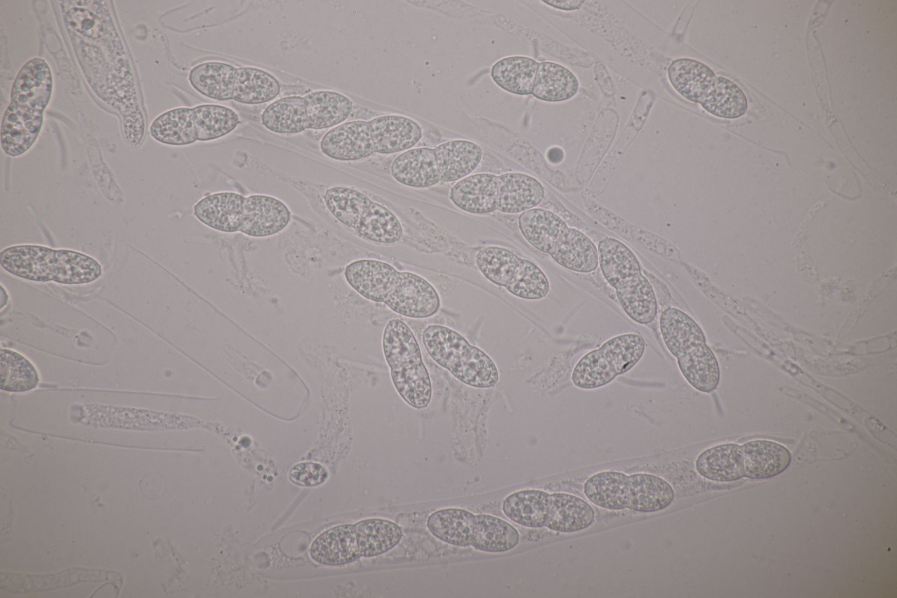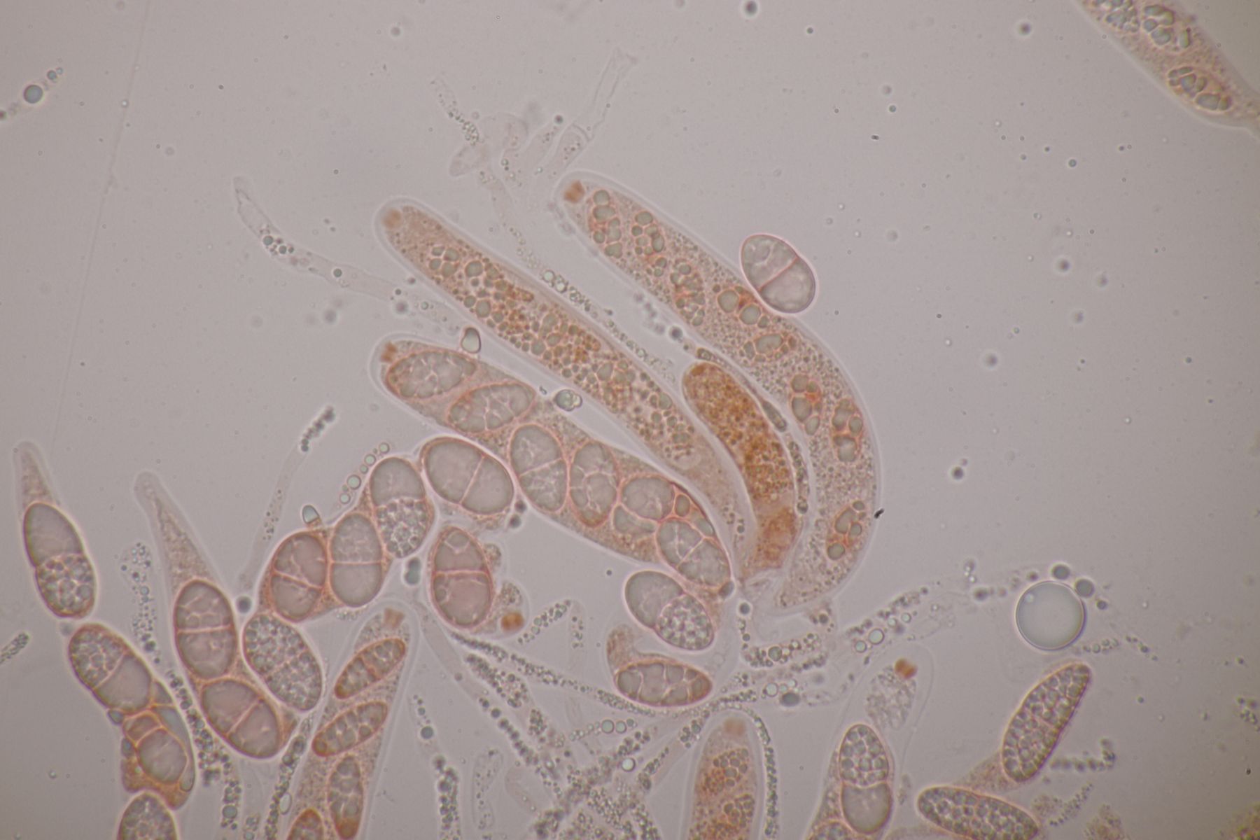 1. Das hier war ein Beifang bei der Präparation eines anderen Pilzes. Weitere Fruchtkörper habe ich nicht gefunden, deshalb ist kann ich insgesamt nur wenig über den Fund sagen. Sporen messen 6,5 x 4 µm. Letztens wurde hier ja eine Sordaria minima vorgestellt, die relativ kompatibel mit meinem Fund aussieht.