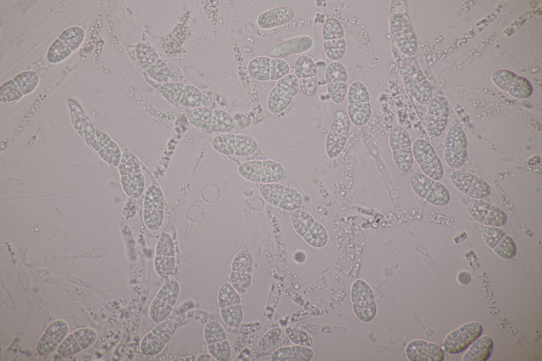 5. Und zum Abschluß noch ein dicker Brocken von Sporormiella. Die Sporen sind bis über 90 µm groß und 14 µm breit. Das ist bei Ahmed und Cain zwar gerade die Trennlinie zwischen S. longispora und S. longisporopsis, aber die Anordnung der Sporen in den Asci paßt besser zu letzterer Art, auch wenn mir die charakteristische Rotverfärbung des Substrats, die für die Art typisch ist, hier nicht aufgefallen ist.