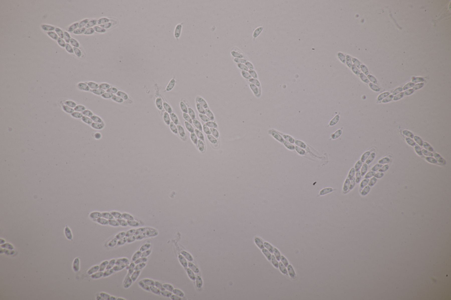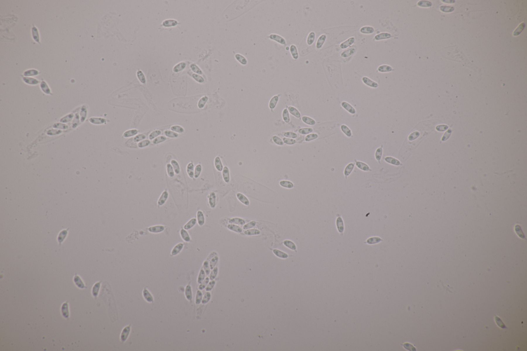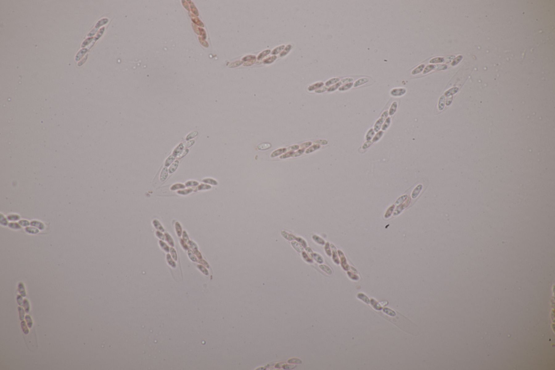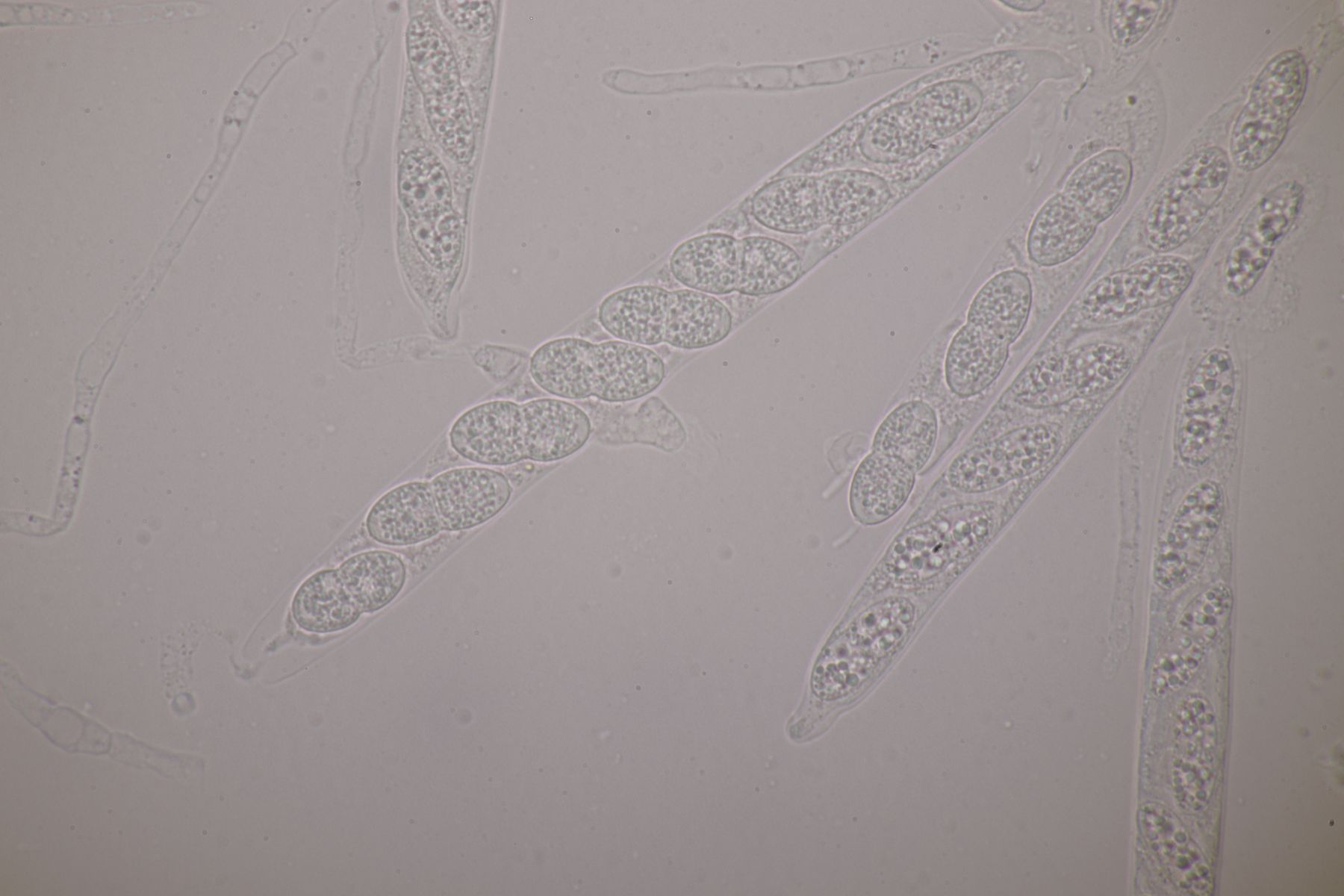 2. Eine Sporormiella auf Kaninchen. Die Sporen messen 37-45 µm x 8-9 µm. Die Asci würde ich als eher kurz gestielt bezeichnen. Gehe ich dann bei Ahmed und Cain zu Schlüsselschritt 8, komme ich bei S. australis raus, die aber wegen der eher parallelen, nur leicht in der Mitte geknickten Keimspalten aber nicht paßt. Gehe ich zu Schritt 13 und entscheide mich für eine zylindrische Sporenform, lande ich bei S. isomera und S. leporina, die aber kleinere Sporen haben sollten. Bliebe noch die Option mit den zugespitzen Sporen, die mich zu S. dubia bringt. Da würden Sporengröße und Keimspalte immerhin passen.
