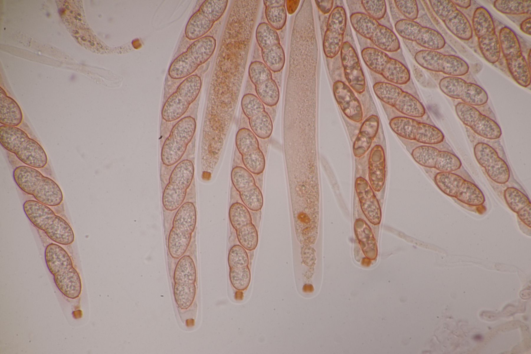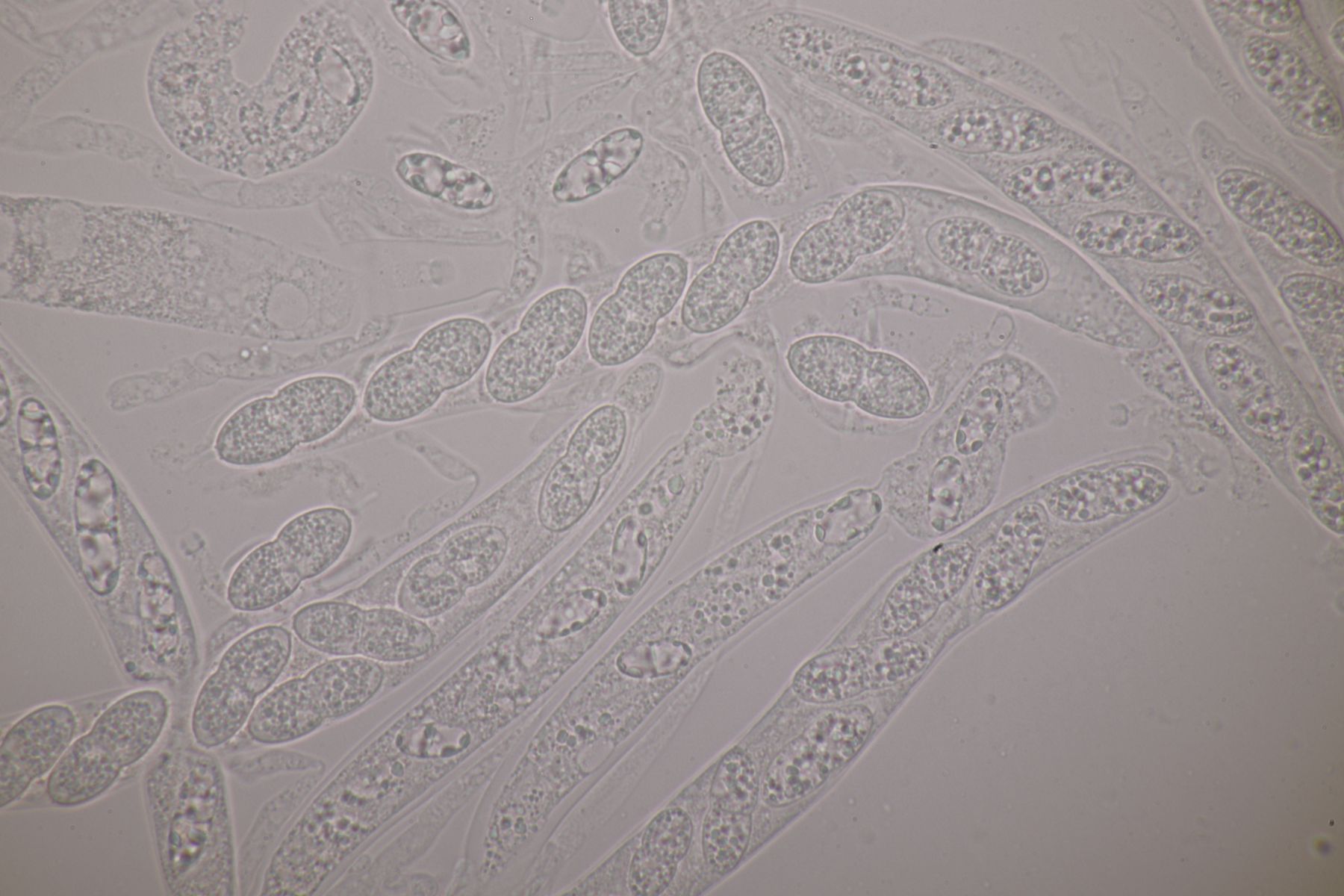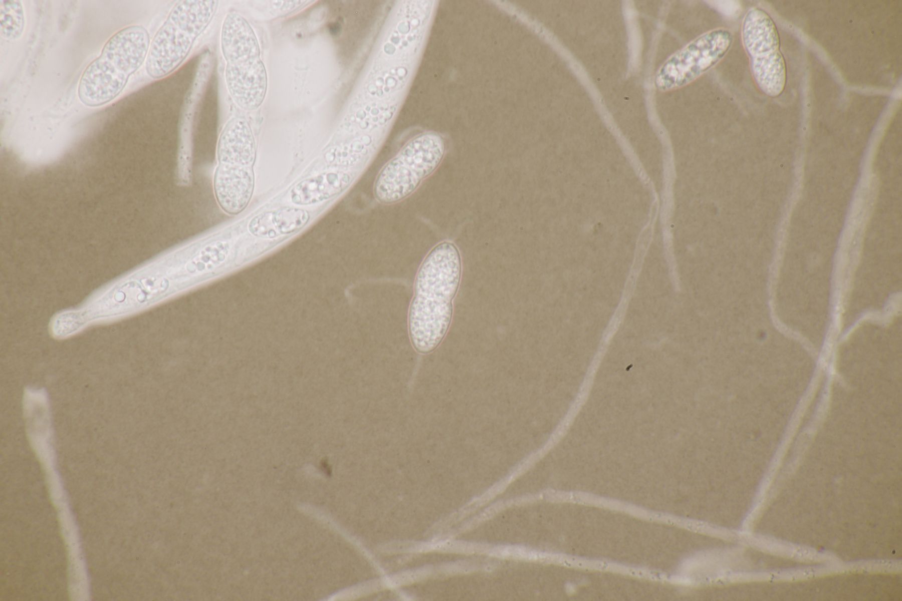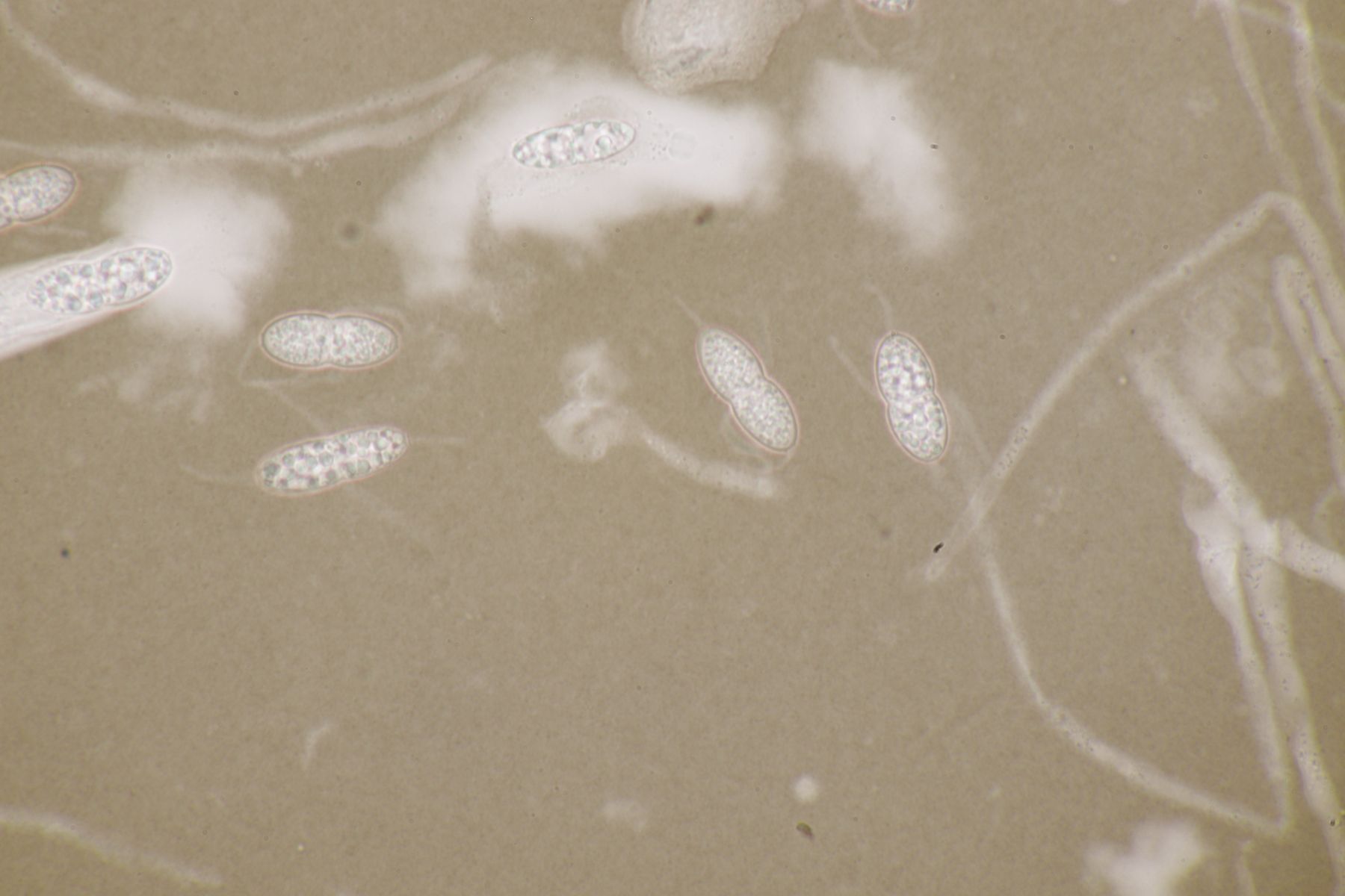 2. Diese kleinen, gelben Kerlchen halte ich für einen Coprotus. Asci reagieren nicht mit Lugol, es sind keine Haare oder dergleichen vorhanden. Sporen messen 14.1-15.5 µm x 8.9-10.2 µm, Paraphysen sind ohne gelbe Tröpfchen, auch wenn die Fruchtkörper selber gelblich aussehen. Damit komme ich dann leider auch weder mit Doveri noch mit Kusan et al. zu einem Ergebnis.