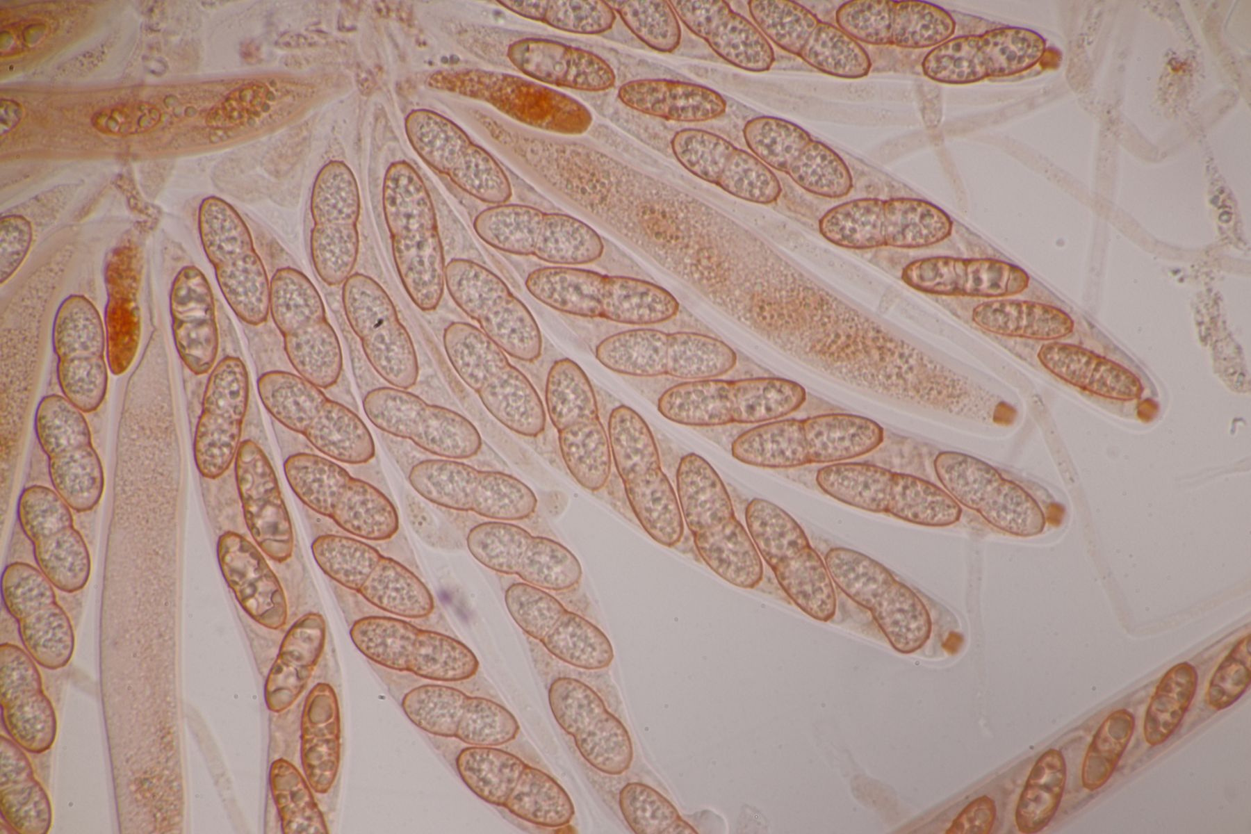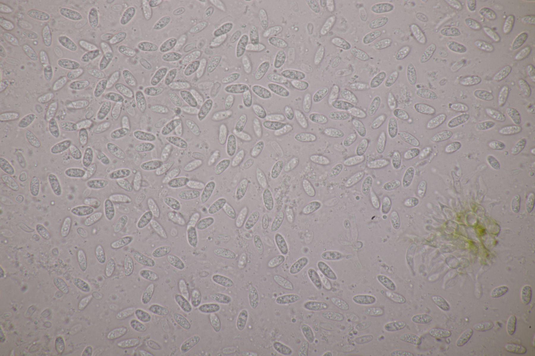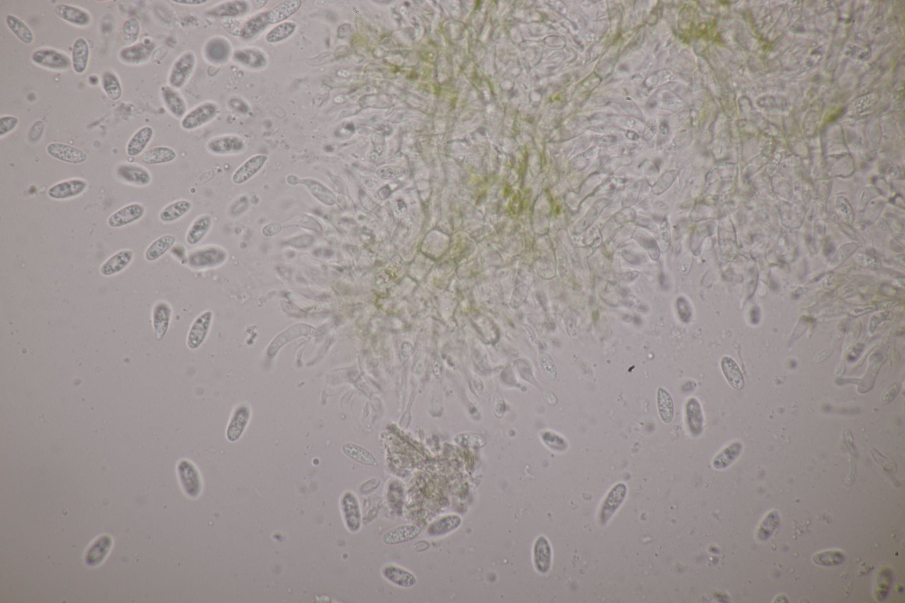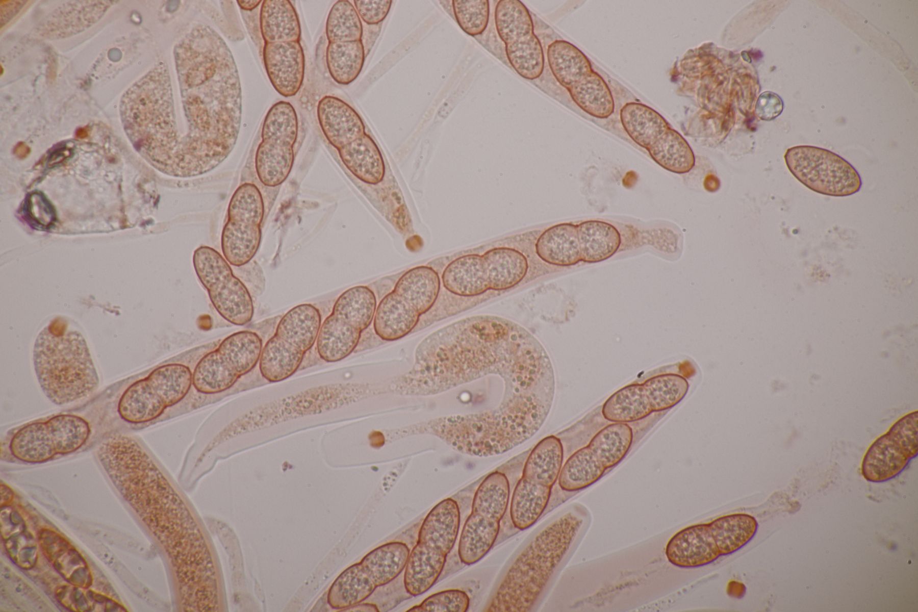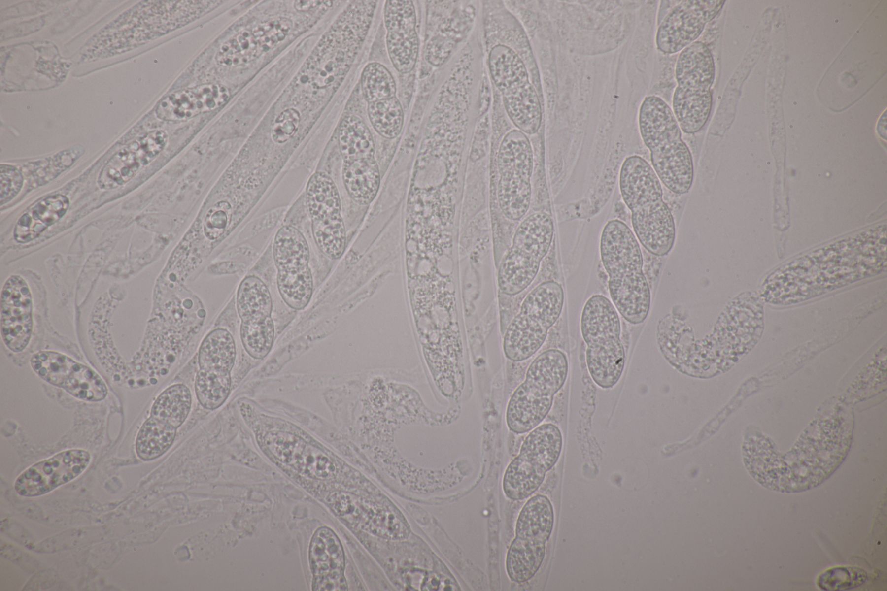2. Diese kleinen, gelben Kerlchen halte ich für einen Coprotus. Asci reagieren nicht mit Lugol, es sind keine Haare oder dergleichen vorhanden. Sporen messen 14.1-15.5 µm x 8.9-10.2 µm, Paraphysen sind ohne gelbe Tröpfchen, auch wenn die Fruchtkörper selber gelblich aussehen. Damit komme ich dann leider auch weder mit Doveri noch mit Kusan et al. zu einem Ergebnis.